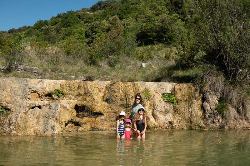 Le lendemain, nous essayons de partir tôt pour éviter les grosses chaleurs. La route tout en descente jusqu’à Notre Dame de Londres est des plus agréables, sans circulation. Au delà de ce village pittoresque à la fontaine salvatrice, nous empruntons une piste caillouteuse, qui nous mène à la source du ruisseau de Gorniès. Les gouffres poissonneux sont un appel à la baignade sous ce soleil de plomb. L’après midi passe tranquillement entre rafraîchissement, jeux, exploration des lieux, lessives et repas.