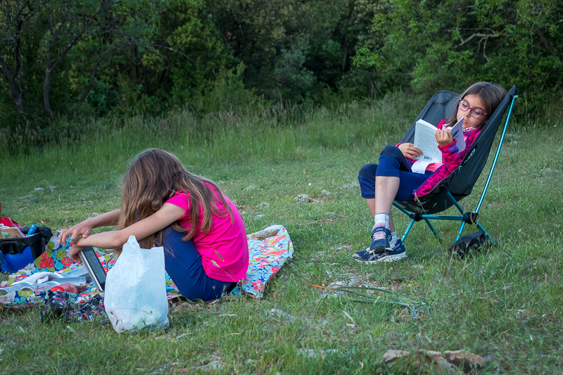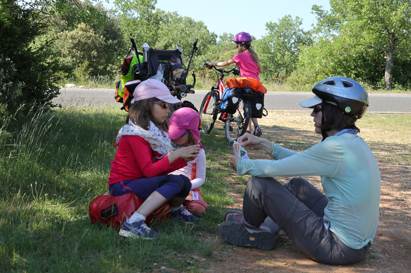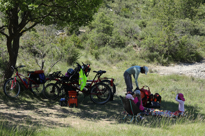 Nous nous régalons de cette visite et la chaleur ne nous paraît que plus intense à la sortie. On traîne encore un peu mais il faut se remettre en route pour le bivouac du soir repéré à l’aller. Une partie de la montée se fait sur le bord d’une départementale très passante et vraiment désagréable. Nous ne traînons pas pour rejoindre une route secondaire et profiter de quelques zones ombragées. La montée tant redoutée ce matin est finalement vite passée entre goûter, jeu et recherche du bivouac idéal.