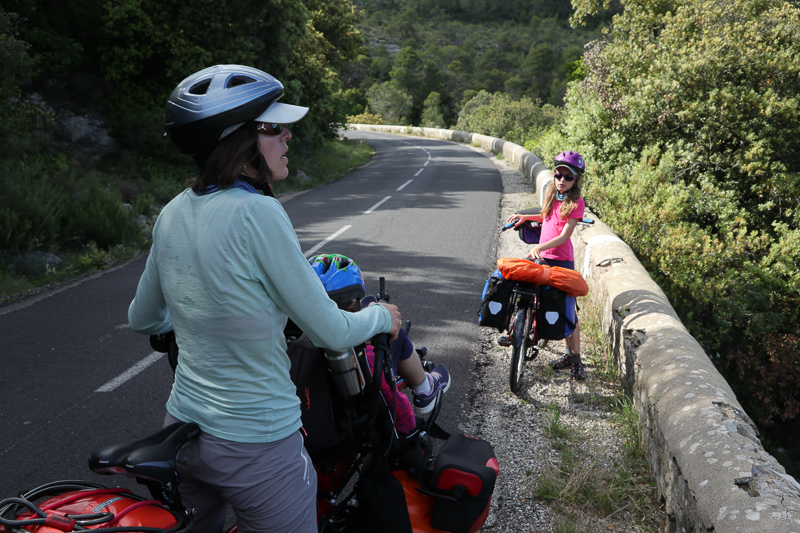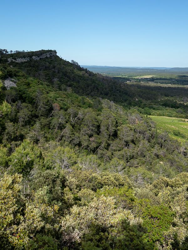 Nous démarrons doucement, sous une belle chaleur. La route serpentant entre vignes et pinèdes nous offre de beaux points de vue sur le Pic Saint Loup et l’Hortus. Nous adorons les admirer de profil lorsqu’ils semblent se donner la réplique. Nous grimpons doucement sur le plateau de l’Hortus, où nous accueille un premier bivouac plat et ombragé…. bref, le paradis…. des tiques surtout. Elles prolifèrent et nous leur livrons une lutte sans merci!