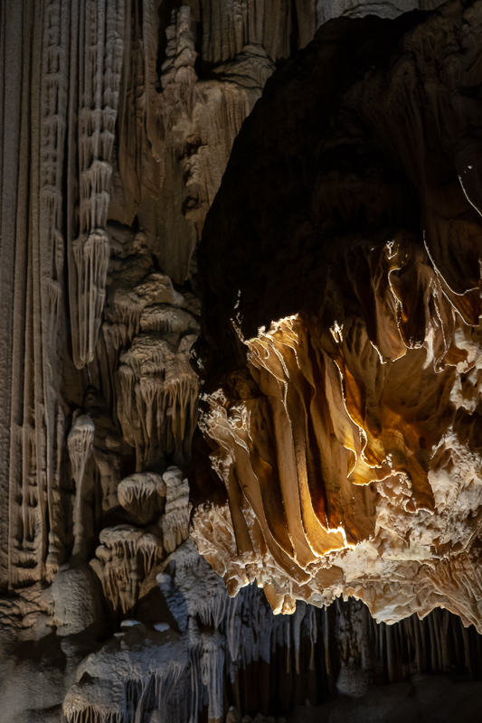 Samedi, 7h00: il est temps d’émerger pour atteindre l’objectif du séjour. Il nous faut à peu près 2h pour tout ranger et être prêt pour cette journée qui s’annonce longue. Damien et Héloïse sont de corvée « gourdes » et font le détour par Ferrières-les-verreries, tandis que le reste de l’équipe attaque la montée. En fait, bonne surprise, elle se fait tout en douceur et nous descendons rapidement sur Saint Bauzille. Ouf! Nous avons gradé des forces pour la dernière montée vers la grotte. Elle aura raison des mollets de Fanny. C’est à pied qie nous terminons pour prendre encore plus le temps d’admirer le paysage. Quel régal de profiter de l’ombre pour déjeuner et de la fraîcheur des grottes en ce début d’après midi brûlant! Un ancien ours des cavernes garde l’entrée. Nous déambulons dans un décor féerique. C’est d’ailleurs là l’origine de ce joli nom: petit Jean, berger des causses, tomba au fond du gouffre pour récupérer une brebis et fut sauvé par des milliers de petites fées scintillantes. Le temps a fait son oeuvre, stalactites et stalagmites se disputent la vedette. Nous laissons libre cours à notre imagination pour apercevoir ici, un dromadaire, là un poulpe géant ou encore une belel salade de chou fleur. La grande salle est majestueuse et impressionnante de par ses dimensions. Elle accueillait encore la messe de minuit, il y a quelques années et reste un lieu privilégié pour des concerts atypiques.