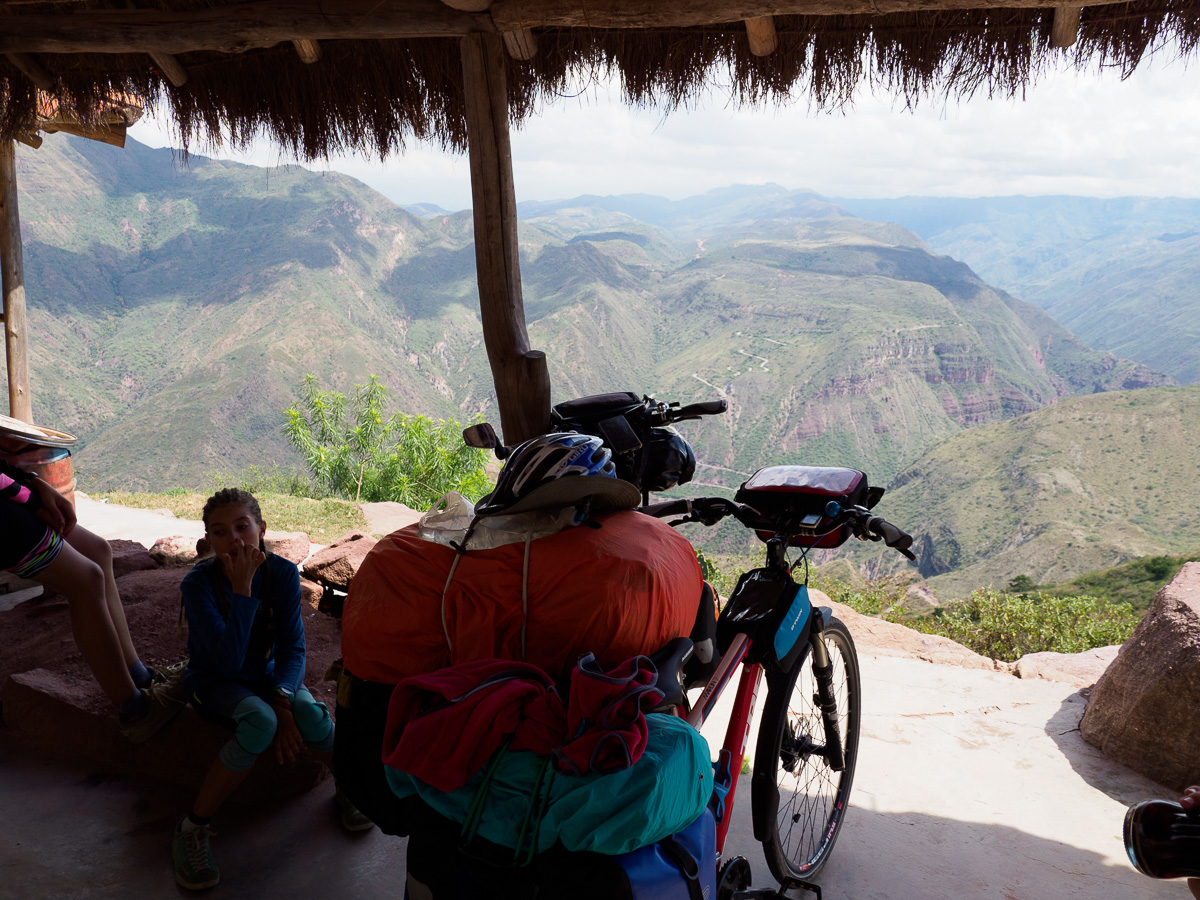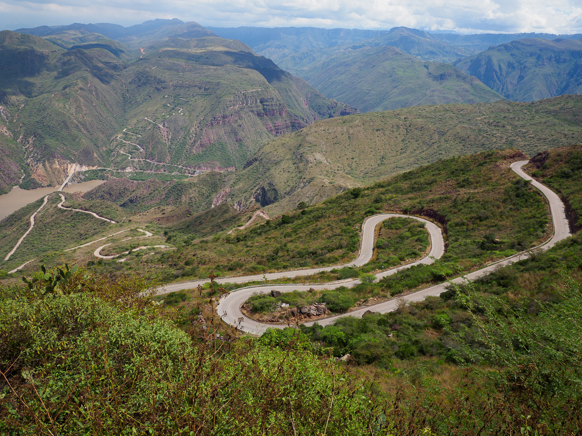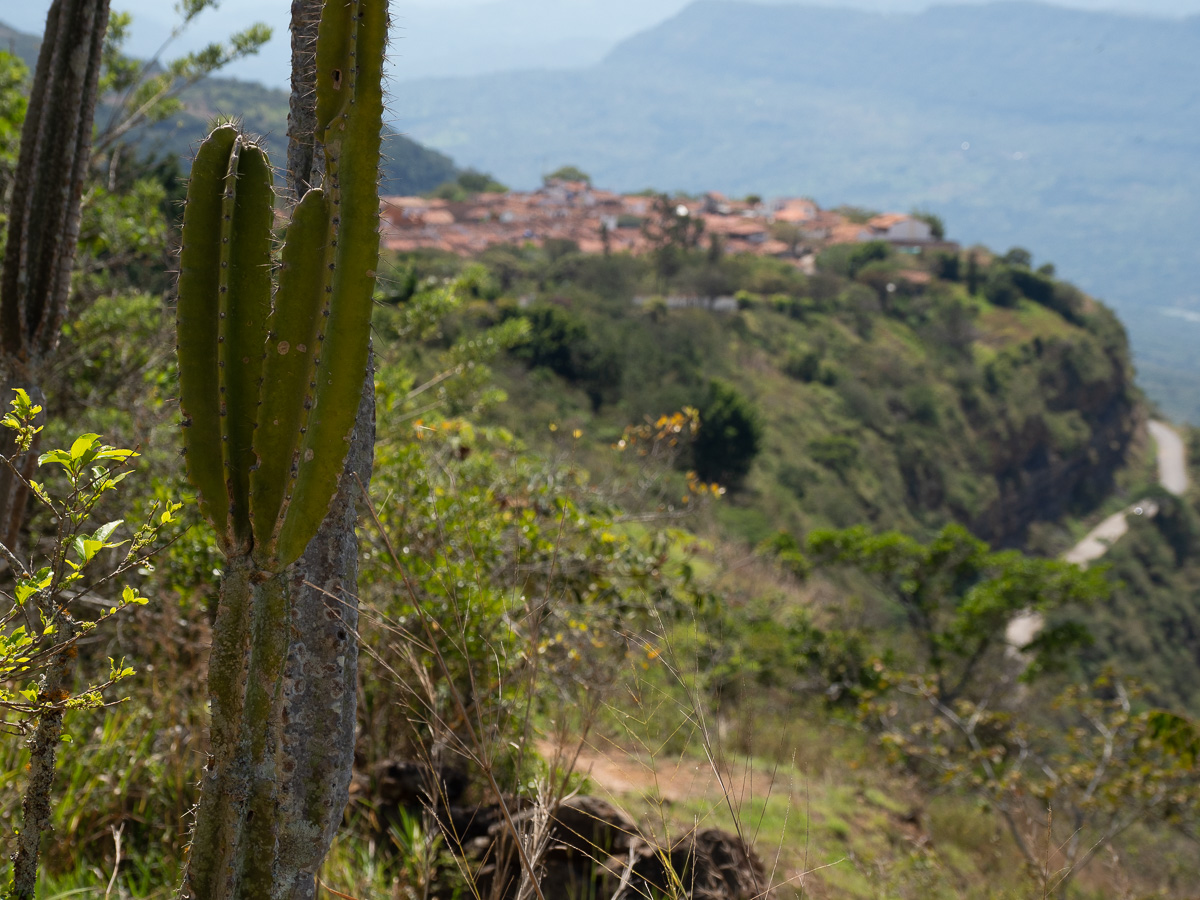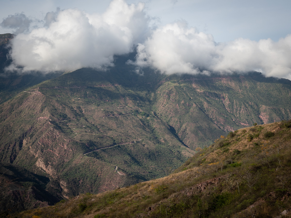 Le lendemain, ça ne rigole pas. On doit franchir le canyon de Sogamoso. La route vue de notre versant est intimidante, on voit clairement les pentes et les lacets pour gravir les 1200 m de dénivelé sur 25 km!! Ça va monter. On profite donc des 7km de descente dans la fraîcheur matinale ! D’immenses falaises ocres surplombent les eaux boueuses du fleuve. Des cactus longilignes émergent au-dessus des acacias sur des pentes abruptes. Notre vitesse avoisine les 4 km/h. Le soleil chauffe… chaque épingle est une victoire. Pause déjeuner au mirador devant une vue à couper le souffle. La route devient de plus en plus vertigineuse. Elle devrait s’applatir mais on le sent a peine.