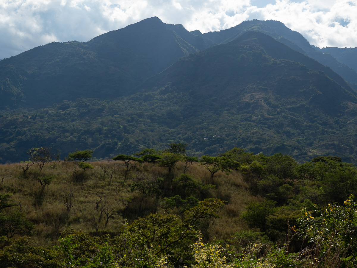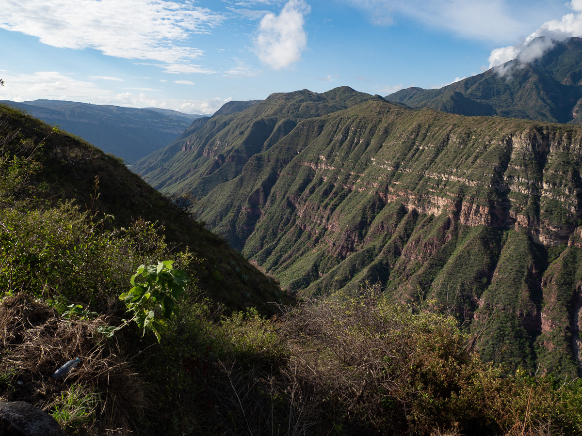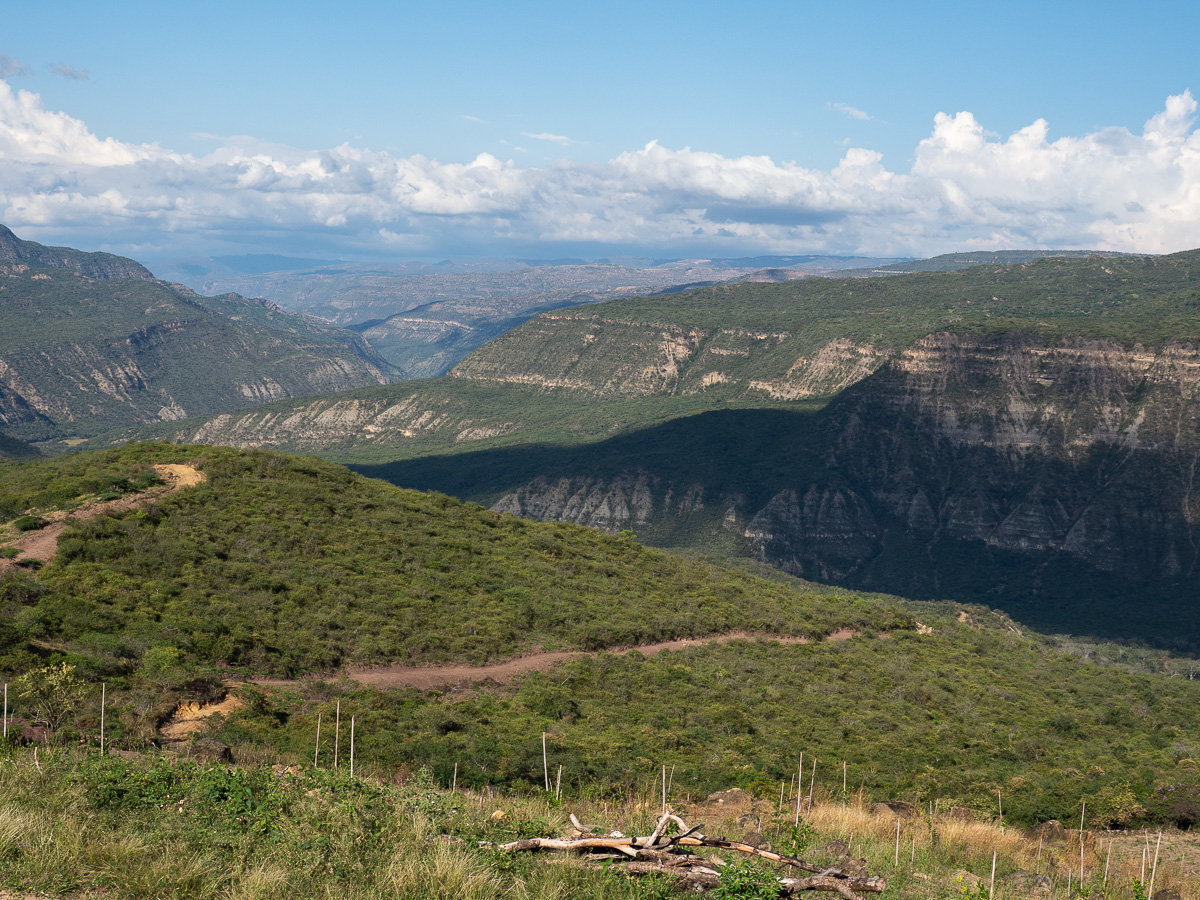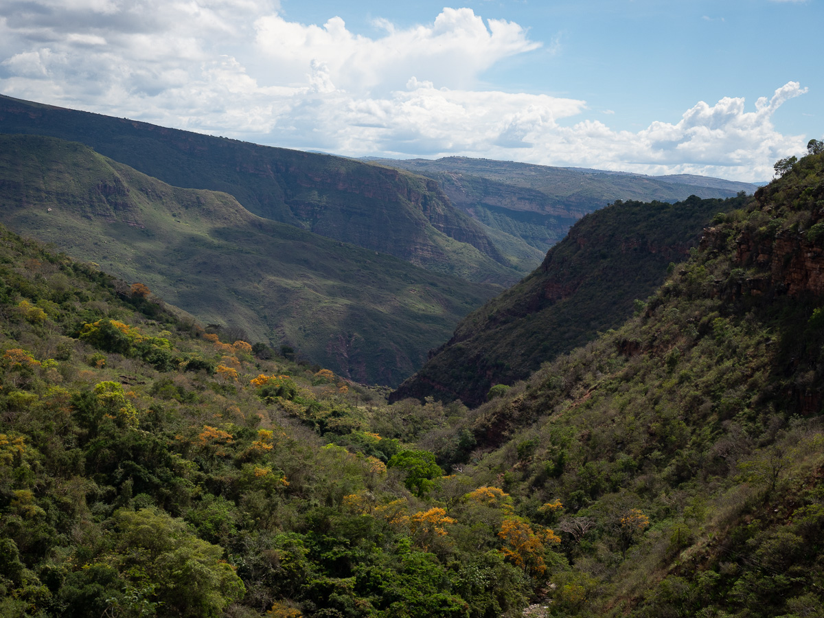 Le lendemain, ça ne rigole pas. On doit franchir le canyon de Sogamoso. La route vue de notre versant est intimidante, on voit clairement les pentes et les lacets pour gravir les 1200 m de dénivelé sur 25 km!! Ça va monter. On profite donc des 7km de descente dans la fraîcheur matinale ! D’immenses falaises ocres surplombent les eaux boueuses du fleuve. Des cactus longilignes émergent au-dessus des acacias sur des pentes abruptes. Notre vitesse avoisine les 4 km/h. Le soleil chauffe… chaque épingle est une victoire. Pause déjeuner au mirador devant une vue à couper le souffle. La route devient de plus en plus vertigineuse. Elle devrait s’applatir mais on le sent a peine.