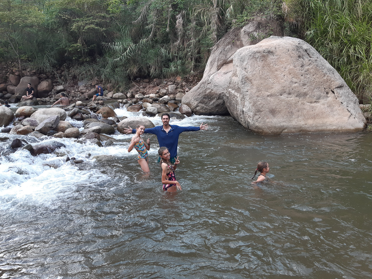 A l’arrivée, on plonge avec soulagement dans les eaux du torrent au gouffre de la Pao. La température est bien sûr inversement proportionnelle à notre altitude et les eaux fraîches nous délassent. On campe sous un kiosque à côté de la rivière et en profitons dès le matin, en remontant les cascades… seuls… mais pas pour longtemps…