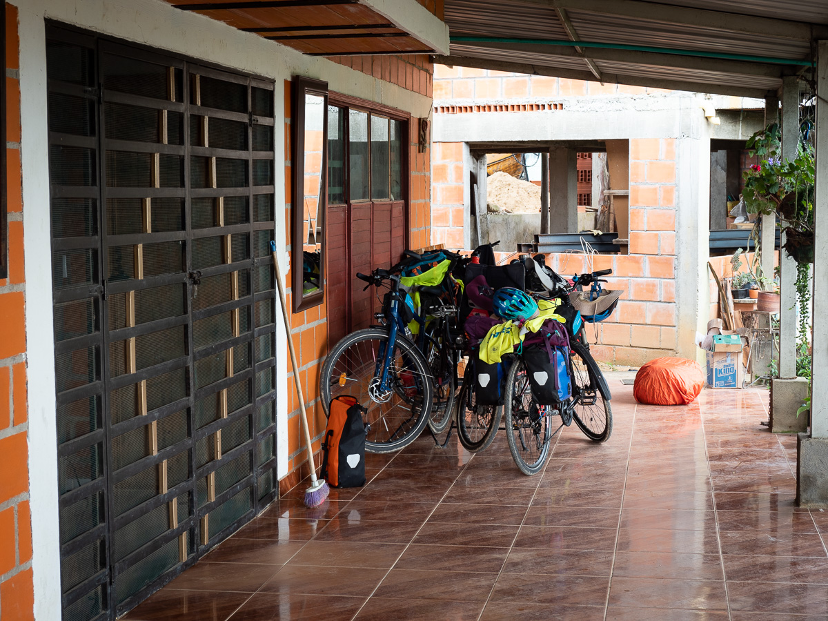 Ils mettent à notre disposition une grande pièce à l’abri en cas de pluie, trouvent naturel de nous accueillir ainsi. On se donne rendez vous pour le tinto du matin, le café… il s’agira en fait d’un petit déjeuner pantagruélique à base de tamales, une pâte de maïs avec viande de porc et de poulet cuits dans une feuille. Nous sommes touchés par cette famille unie, qui s’inquiète de nous voir partir si la piste est mouillée. Ricardo se renseigne et nous donne le feu vert, après la traditionnelle photo souvenir.