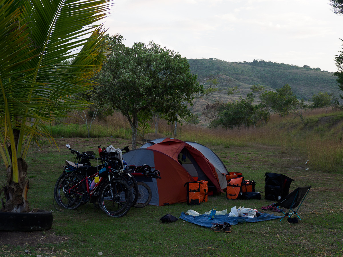 Mine de rien, nous continuons et parvenons vers 16h00 sur une partie plus douce. Une prairie verte abritant une petite chapelle nous tend les bras. On récupère avant d’installer le camp. Un motard s’arrête prier, et nous assure que l’on peut camper tranquillement. Alors que nous dînons dans le noir, une autre moto s’arrête, ce sont Guillermina et Ricardo, le frère du premier motard. Il leur a demandé de nous amener du pain et une boisson. Ils nous invitent à camper chez eux demain à Zapatoca, si le terrain nous convient. Nous sommes toujours étonnés mais reconnaissants de tant de prévenance et de bienveillance. Nous les remercions chaleureusement et nous endormons le sourie aux lèvres dans le calme de la campagne.