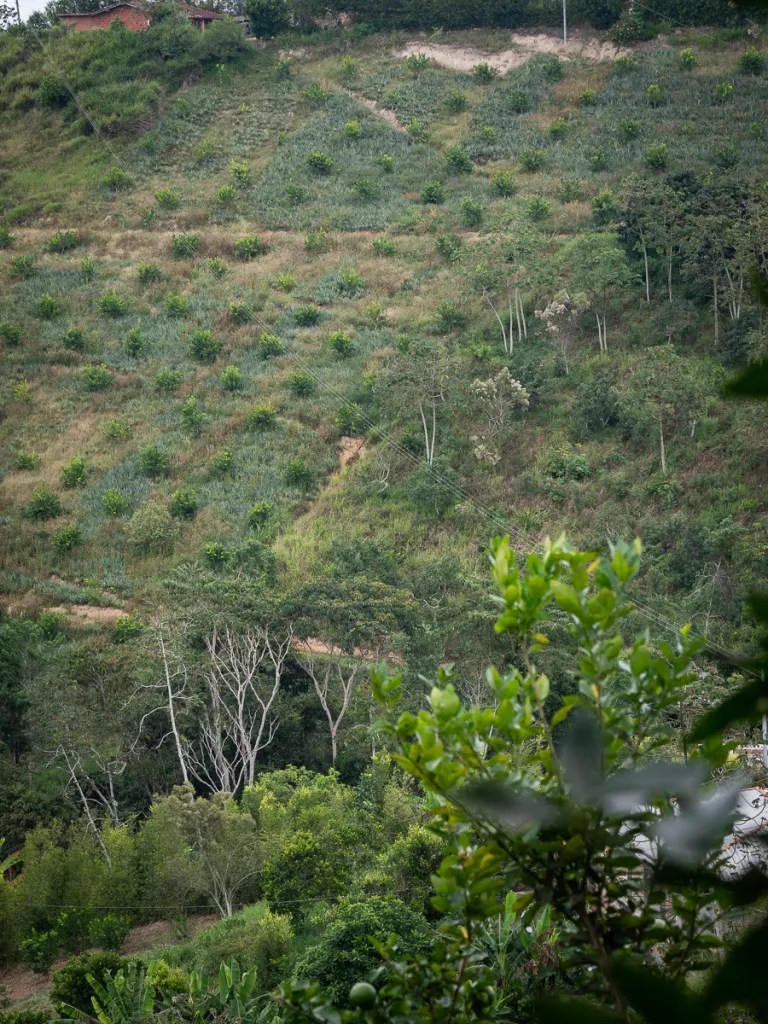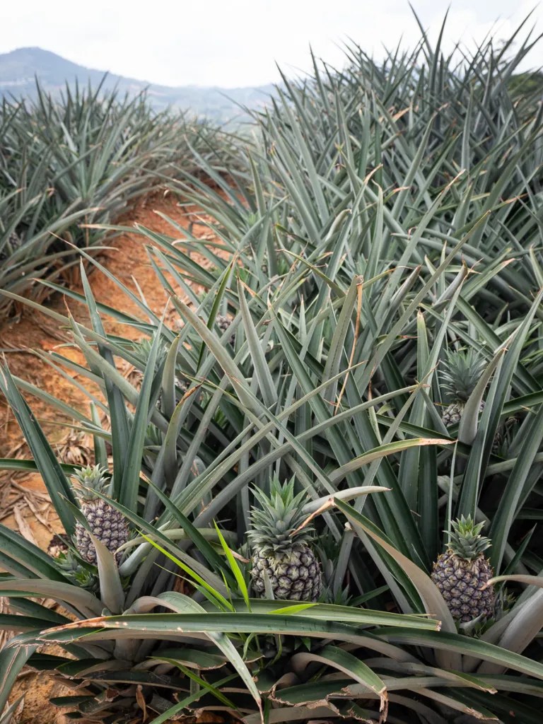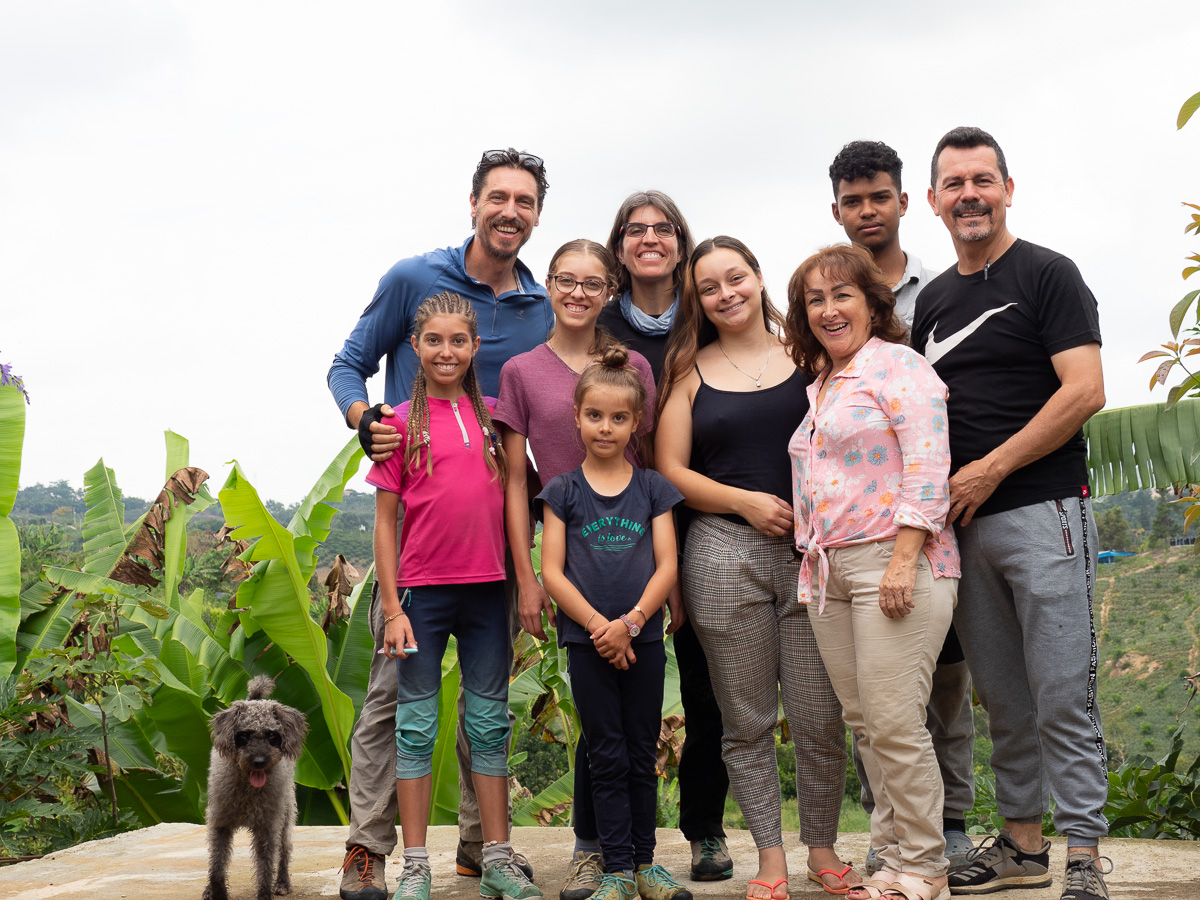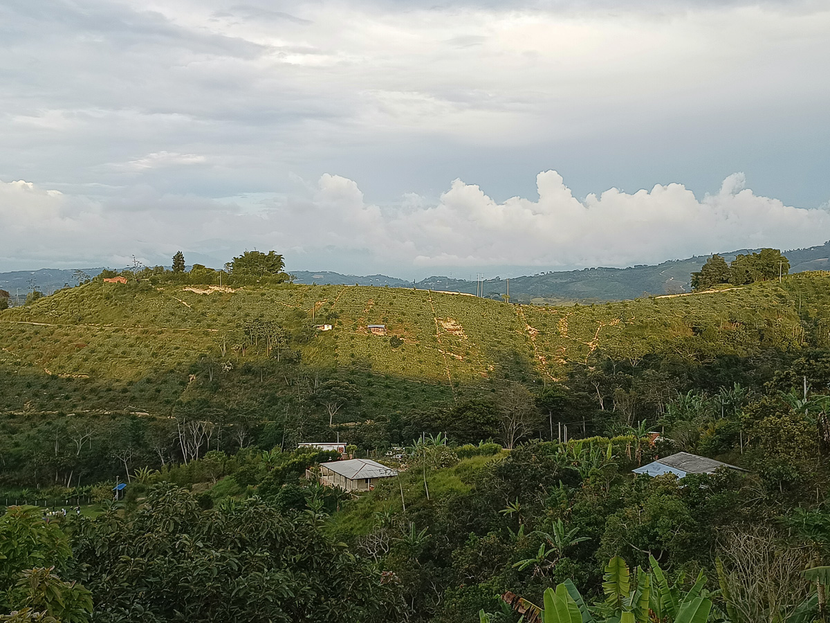 Sur ces entrefaites, Raoul et Maragarita nous rejoignent et nous proposent de venir dans leur finca (ferme) un peu a l’extérieur de la ville, à seulement 10 minutes. Leur fille, Isabel nous ouvre la route en scooter, et eux nous suivent en voiture dont Héloïse profitera!!! Il faut dire que ça monte fort et qu’il nous faudra bien plus de 10 minutes. Vous voyez le massif central et ses douces collines et bien, ici c’est le contraire. La campagne Colombienne est taillée à la machette: flancs verticaux, petites vallées encaissées, pentes à plus de 20%. On transpire et on souffle mais quelle récompense, en arrivant dans leur petit paradis préservé, un havre de paix! Ils construisent leur maison, et veulent devenir auto suffisants. Ils élèvent cochons, poules, poissons, cultivent citronniers, papayers et avocatiers, de vraies délices à portée de mains qu’ils nous feront partager pleinement. On discute, on leur cuisine un crumble, on se délecte de la vue sur les champs bleutés d’ananas. Ils nous accueillent comme des amis. On savoure ces instants uniques où chacun se livre et où on apprend à se connaître en peu de temps. On goûte le vin de corrozo, une spécialité à base de fruits des Caraïbes. Tout comme le père Javier, ils sont généreux et aspirent à une vie simple et sereine. Leur accueil vient du coeur et ce sont toujours des leçons de vie pour nous, qui nous rendent un peu plus humbles. Merci encore !!