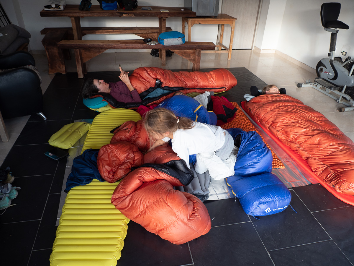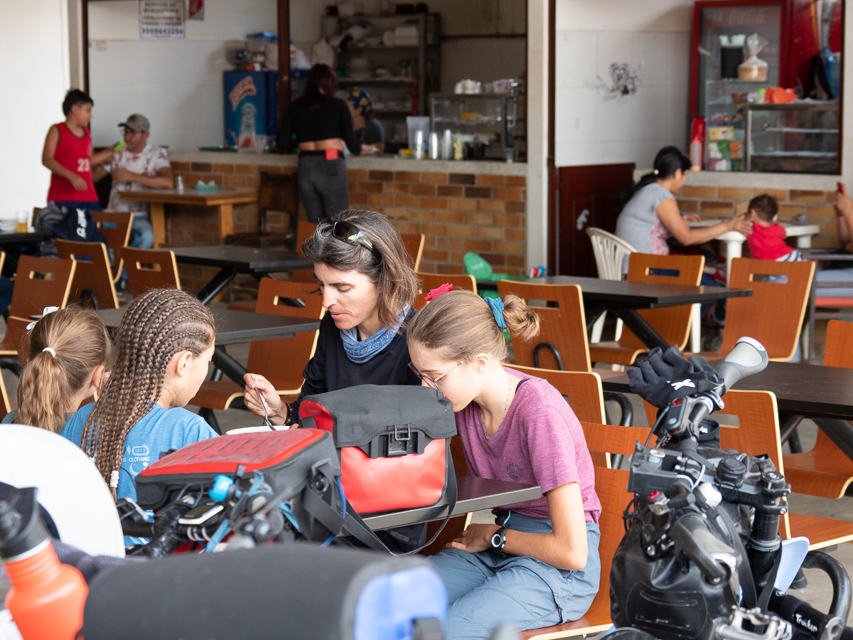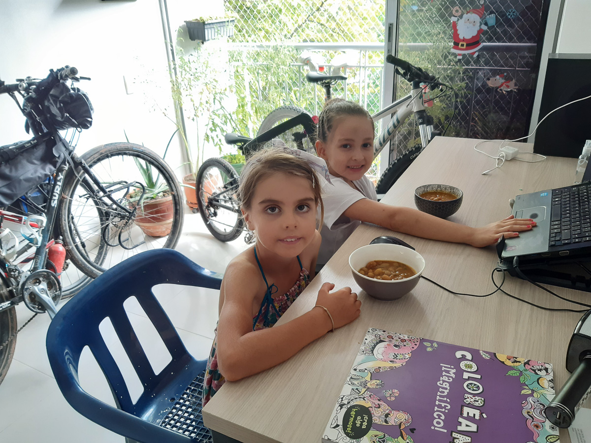 Surtout, nous y rejoignons Leidy, John et Elena, une super famille qui nous accueille via le site warmshowers. Le courant passe tout de suite. Heloïse trouve en Elena la camarade de jeu idéale et arpente les étages de la résidence avec sa nouvelle amie entrant chez les uns et les autres. Manon et Lucie se font aussi de nouvelles amies dans la cour. Et les parents discutent encore et encore. En ce moment, on parle et on mange… entre deux côtes en vélo.
