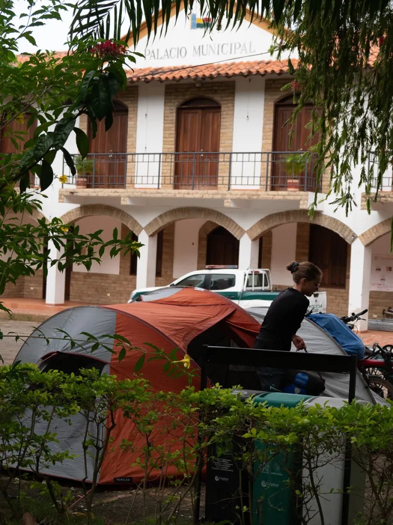 On reprend les vélos en début d’après-midi pour se rapprocher de la destination finale : le célèbre village de Barichara. Avant cela, nous campons à Galan, devant la police sur la place du village, une première pour nous !!Une falaise immense surplombe le hameau d’où s’écoulent trois impressionnantes cascades.