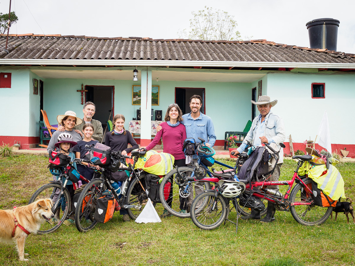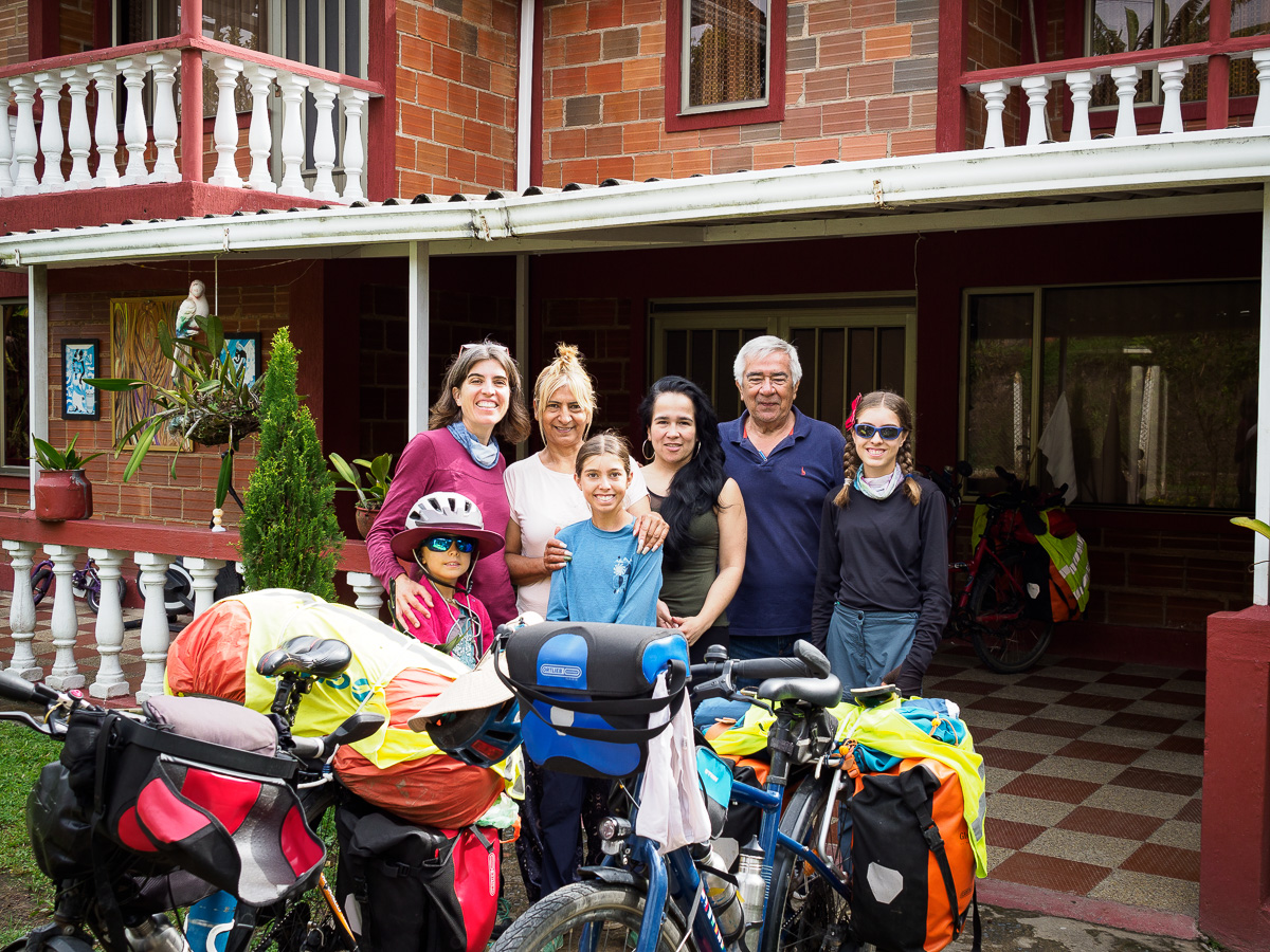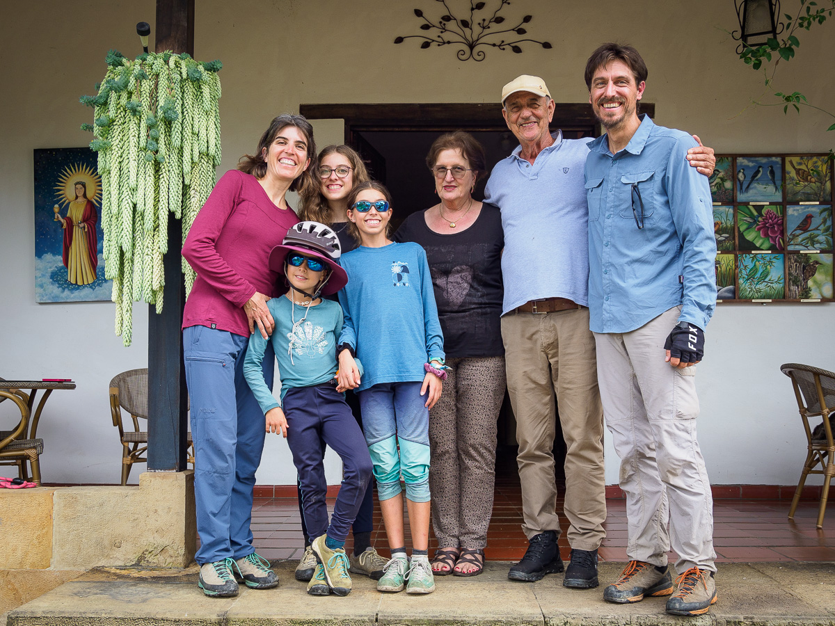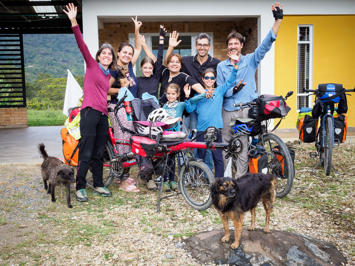 La vue du mirador est encore une fois à couper le souffle. A la nuit tombée, nous nous rendons compte de la quantité de fincas, aux petites lumières qui éclairent la vallée. Nous nous endormons aux sons de la campagne, ici un chien, là un coq… remplacés au petit matin par les chants d’oiseaux que nous ne connaissons pas…. Nous sillonons un environnement moins sec que la veille. La végétation est luxuriante mais les pâturages et les espaces ouverts ne la rendent pas oppressante. A La paz, la police nous interpelle…  » vous êtes la famille française en vélo? » Prévenus par leur collègue d’Aguada, ils nous attendaient. Et c’est parti pour une séance photo. Ce soir, grâce à l’amitié précieuse d’Andres, nous sommes accueillis par Elsa et sa famille alors qu’il se met à pleuvoir, comme souvent depuis quelques jours. Et nous bénéficions encore une fois de la générosité sans limite des colombiens et de cette famille si attachante.