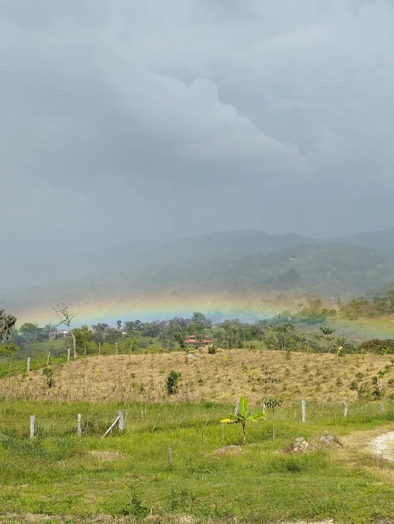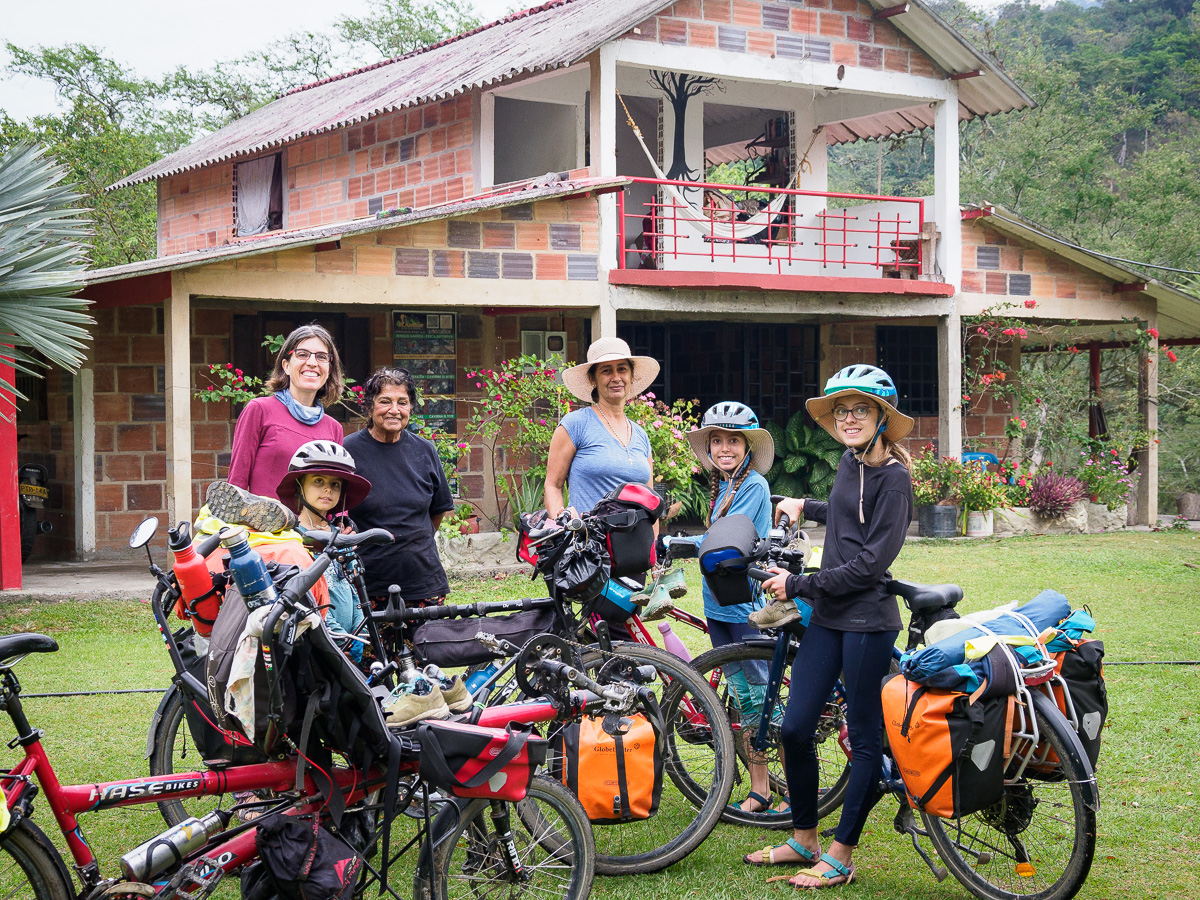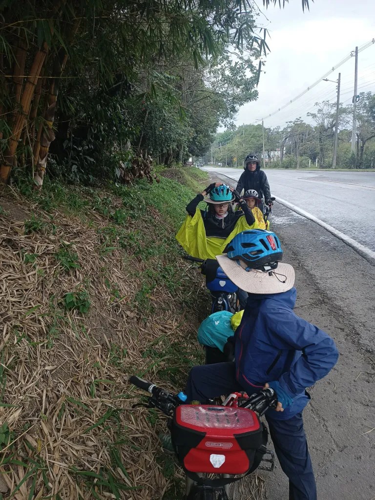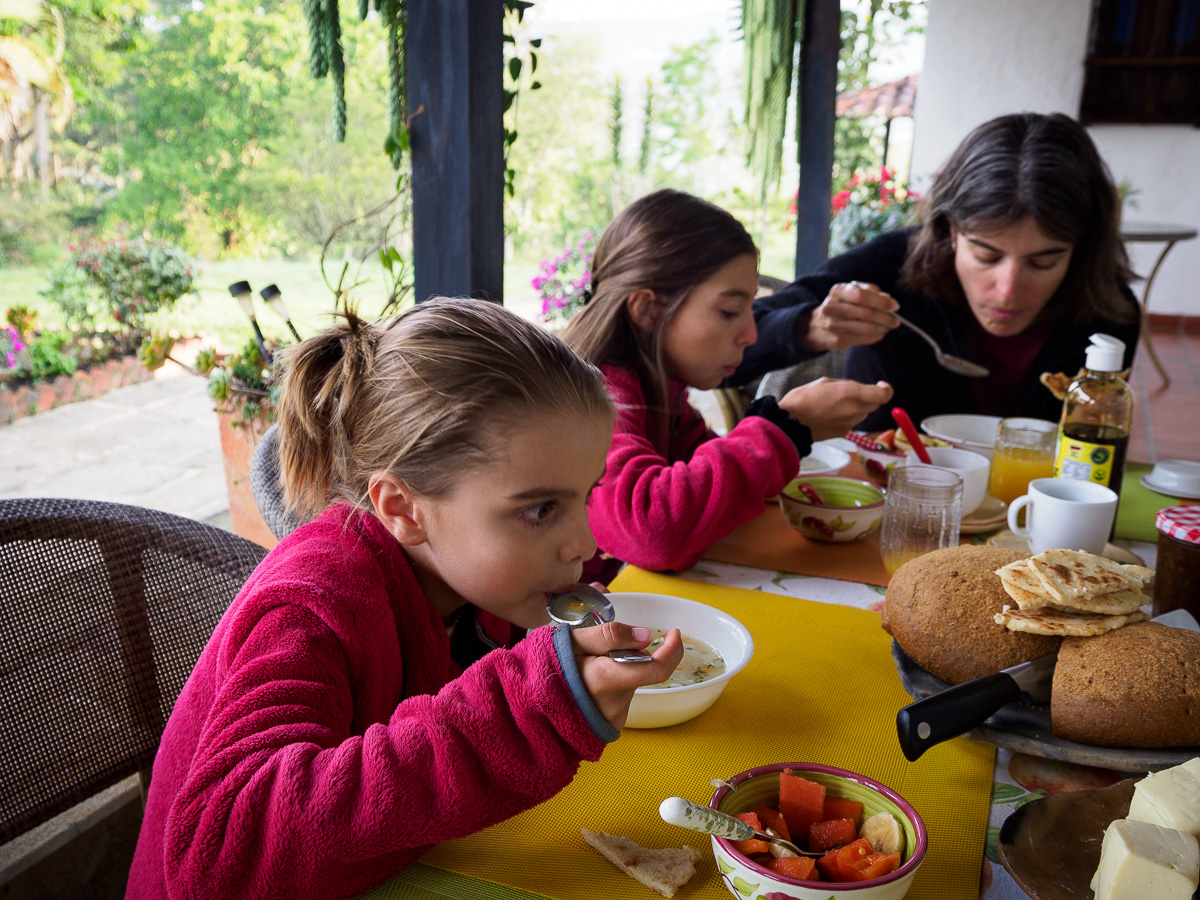 La vue du mirador est encore une fois à couper le souffle. A la nuit tombée, nous nous rendons compte de la quantité de fincas, aux petites lumières qui éclairent la vallée. Nous nous endormons aux sons de la campagne, ici un chien, là un coq… remplacés au petit matin par les chants d’oiseaux que nous ne connaissons pas…. Nous sillonons un environnement moins sec que la veille. La végétation est luxuriante mais les pâturages et les espaces ouverts ne la rendent pas oppressante. A La paz, la police nous interpelle…  » vous êtes la famille française en vélo? » Prévenus par leur collègue d’Aguada, ils nous attendaient. Et c’est parti pour une séance photo. Ce soir, grâce à l’amitié précieuse d’Andres, nous sommes accueillis par Elsa et sa famille alors qu’il se met à pleuvoir, comme souvent depuis quelques jours. Et nous bénéficions encore une fois de la générosité sans limite des colombiens et de cette famille si attachante.