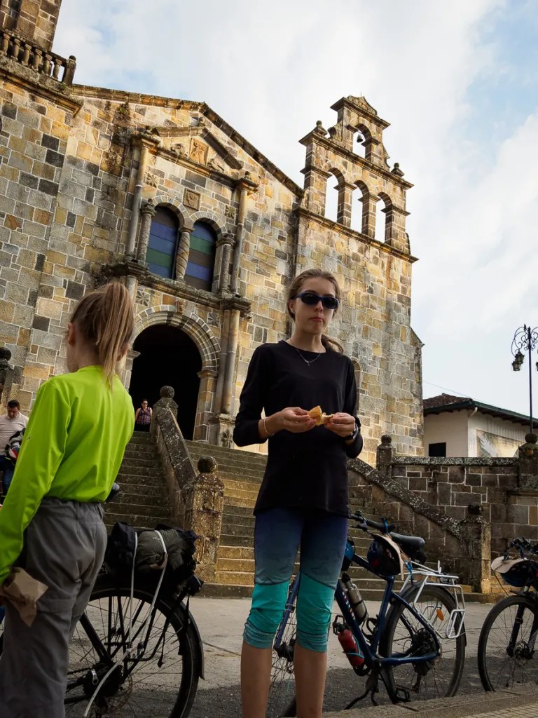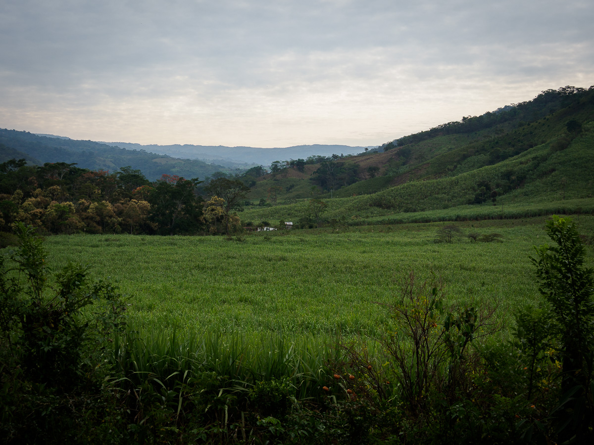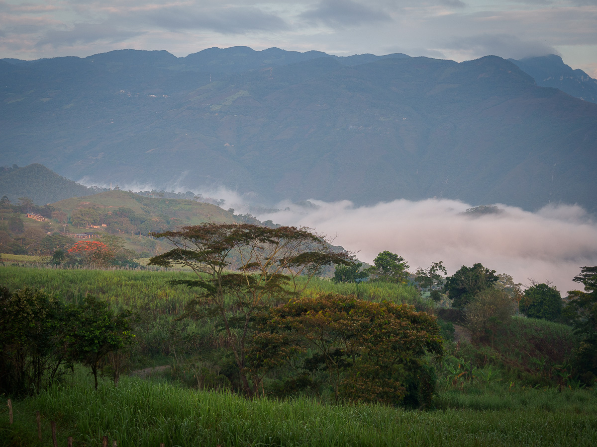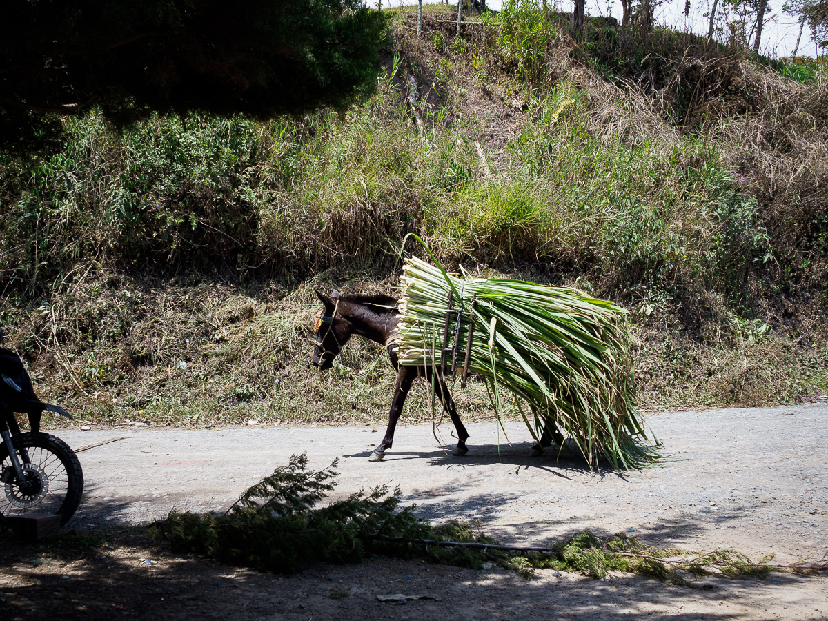 La culture de la canne à sucre est encore très présente ici. Des mules chargées nous doublent et notre odorat est titillé par les effluves sucrées émanant de chaque moulin ou trapiche. Chaque exploitation semble avoir sa propre fabrique. Avec nos références européennes, nous nous demandons pourquoi ils ne créent pas des coopératives. Mais les routes sont tellement mauvaises que les mules ne peuvent pas faire des kilomètres pour atteindre le moulin… Après un bivouac sur le terrain de foot de Chipata viejo, nous atteignons Velez, capitale du bocadillo ou pâte de fruits de goyave, notre carburant. Nous roulons maintenant enveloppés de l’odeur de la goyave caramélisée s’échappant des fabriques locales. Nous ne pourrons pas les visiter pour des raisons d’hygiène mais le contremaître nous offre des blocs de pâte de fruits et nous envoie des vidéos de la chaîne de fabrication!!!
