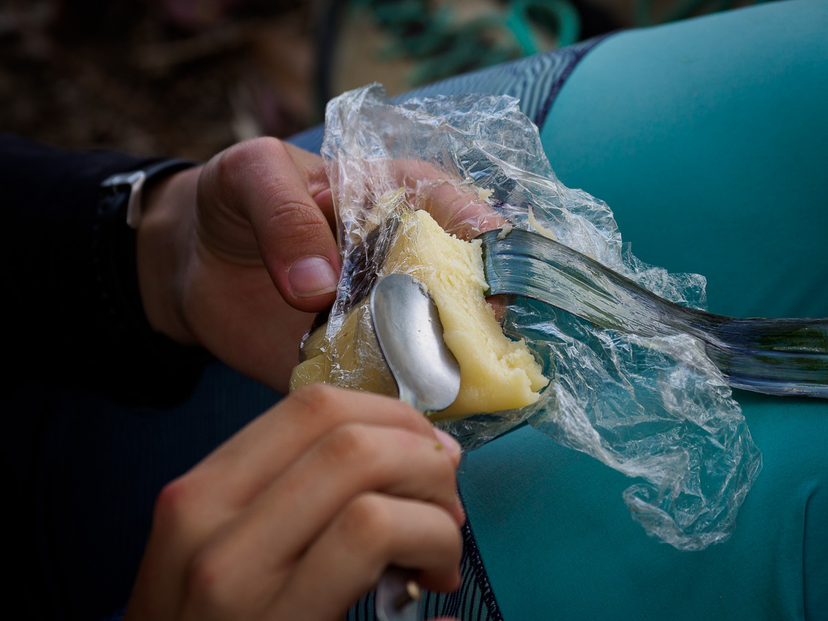 Pour le déjeuner, les hommes de la maison ont préparé un plat typique: des piquetes, mélange de viande, d’oeufs, de yuka, de pommes de terre et de bananes plantain, le tout enveloppé dans des feuilles de banane. Les discussions s’arrêtent… Nous dégustons… Nous leur faisons à notre tour goûter une spécialité francaise: des crêpes… tartinées d’arrequipe et arrosées d’agua panela bien sûr !!