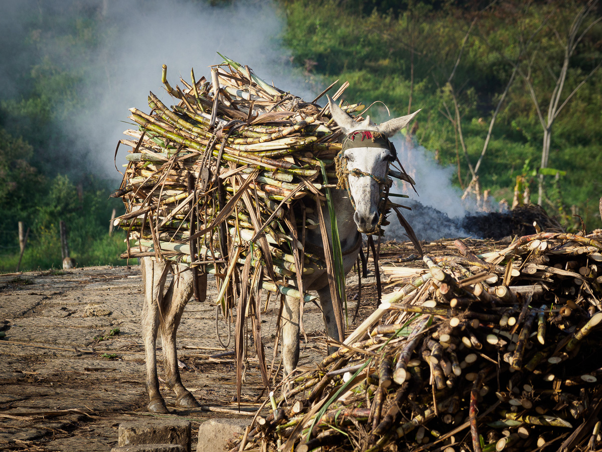 Le lendemain, dans la lumière rosée de l’aube, Hernando nous fait visiter l’usine et le domaine. Nous retrouvons dans l’air l’odeur caractéristique de la panela, mélange de caramel chaud et d’épices. La canne à sucre, débarrassée de ses feuilles utilisées pour le fourrage des vaches, y parvient à dos de mules. Les troncs sont broyés pour extraire leur jus qui après filtration et décantation est chauffé dans plusieurs bassins. Le liquide se concentre en sucre, pour atteindre le degré Brix recherché. Nous goûtons à la mielcocha, cette pâte sucrée à peine refroidie qui va donner la panela, une fois mise en moule. Hernando, à plus de 80 ans, est aussi passionné qu’Andres par son métier et regorge d’idées. Pour lui, la panela fait partie du passé. Il se doit d’imaginer des produits plus exportables et à plus forte valeur ajoutée comme le miel de canne qu’il nous offre et qui améliorera grandement nos petits déjeuners. Nous sommes admiratifs du parcours d’Hernando et de Maryse. Ils gèrent tout un domaine agricole, une cantine d’une petite centaine d’ouvriers et du bétail aussi. Nous nous laissons attendrir par un petit veau, né dans la nuit et encore tout humide du liquide maternel.