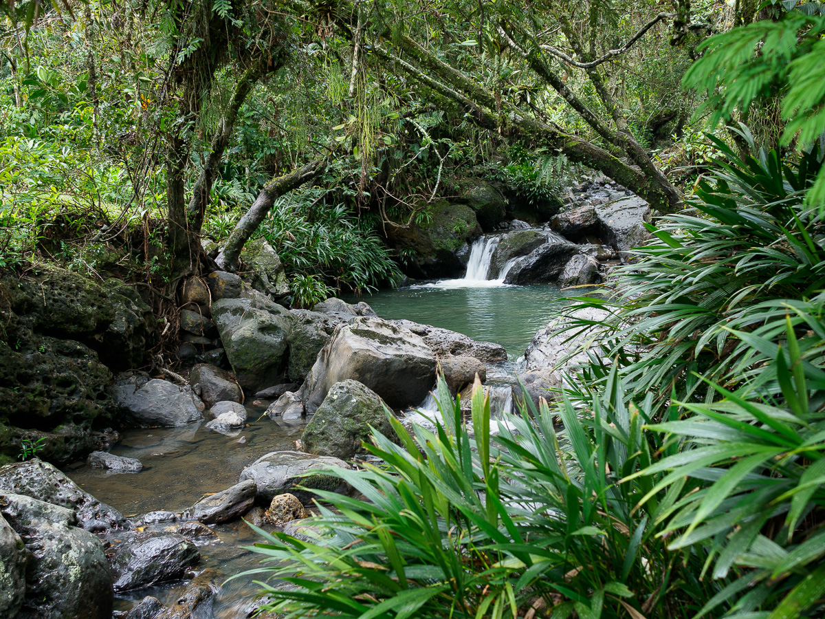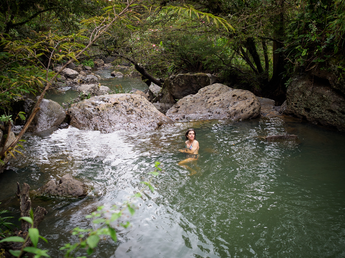 Andres nous montre les plans de cafés toujours à l’ombre de grands arbres pour éviter qu’ils ne brûlent (culture agroforestale avec des arbres de ricin) sur des parcelles extrêmement pentues. Les feuilles d’un vert sombre luisent au soleil. La récolte s’est terminée ici en Décembre même si démeurent ici et là, quelques fleurs et quelques graines. Entre les plants, nous découvrons aussi du maïs et du yuka pour la diversité des plantations. La vue de leur finca est superbe. Face à nous, une campagne luxuriante et paisible. Dans le fond de la vallée, un petit trésor caché, un gouffre aux eaux cristallines dans lequel nous passerons une après midi vivifiante et apaisante.