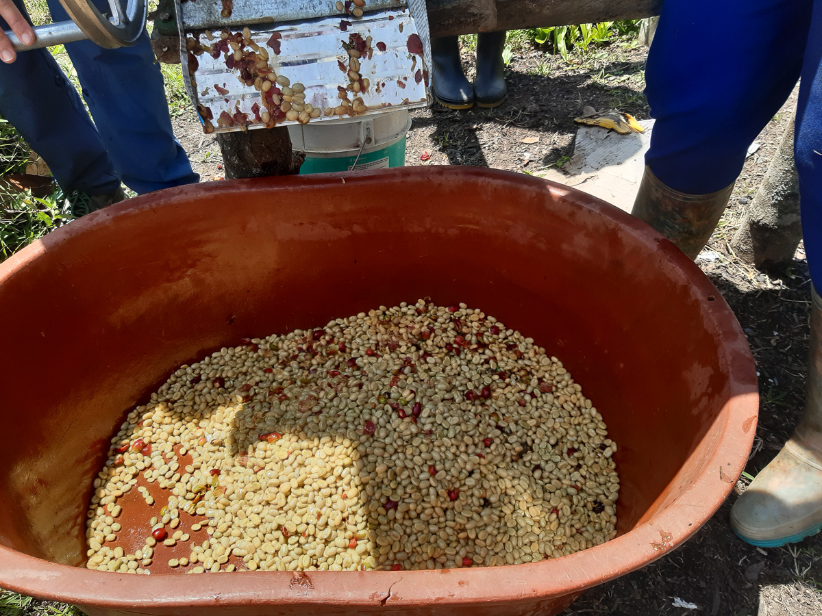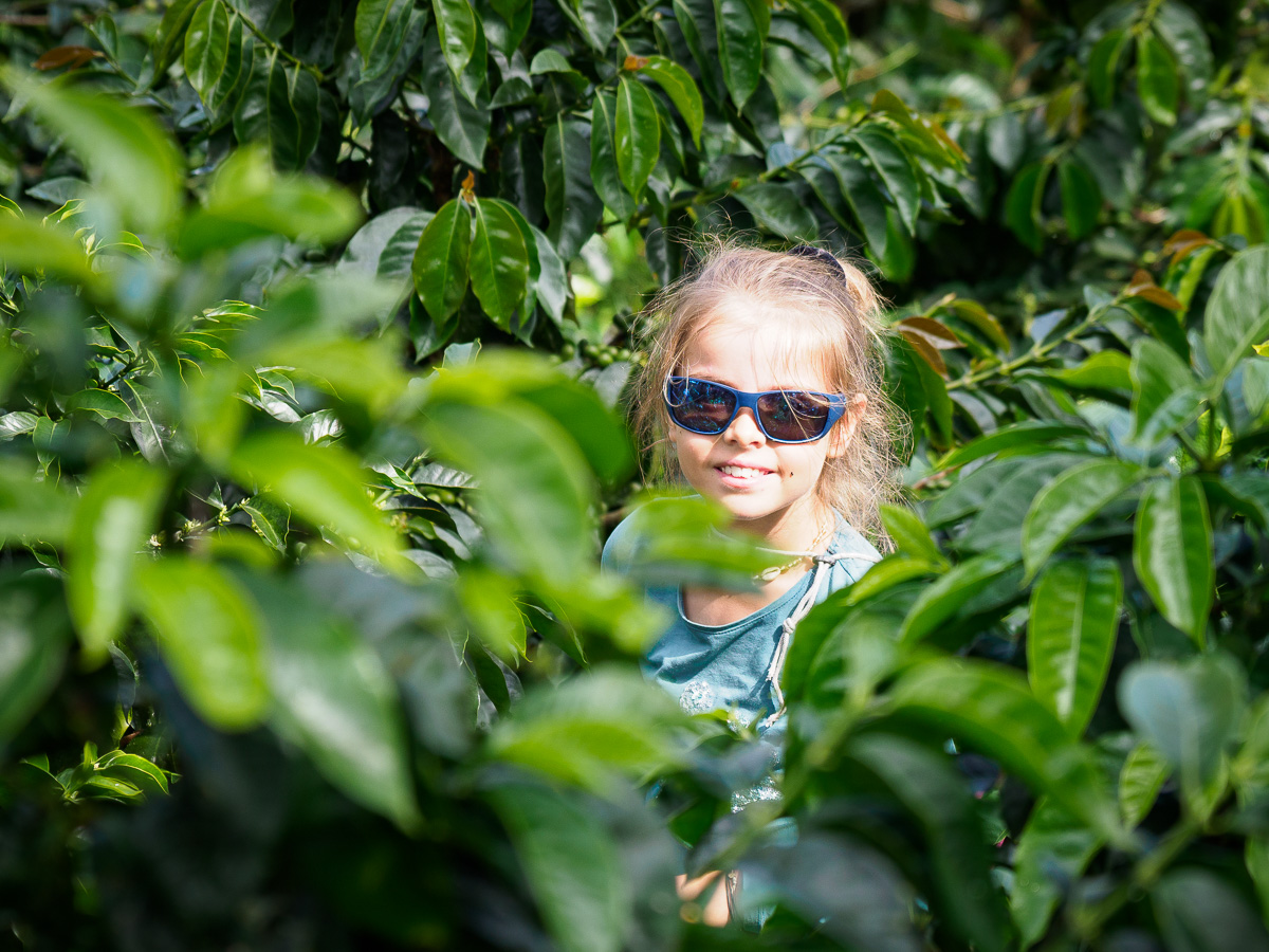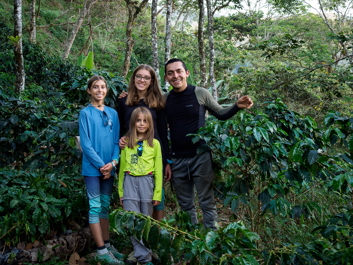 Dès 7h30, équipés de paniers, nous arpentons la plantation à la recherche de pépites de café rouges et mûres. Elsa qui débute dans le métier est heureuse à chaque nouvelle fleur qu’elle découvre et son enthousiasme est contagieux. Nous nous appliquons dans cette nouvelle tâche et les filles prennent leur rôle très à coeur. Nous moulons ensuite la cueillette pour en extraire le grain qui est lavé puis séché. Pendant ce temps, le reste de la famille prépare un bon déjeuner que nous partageons tous ensemble à l’ombre de la cuisine à bois.