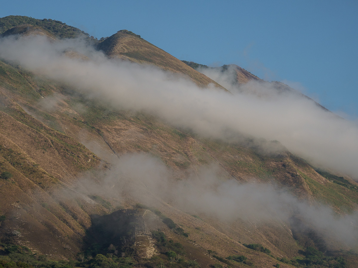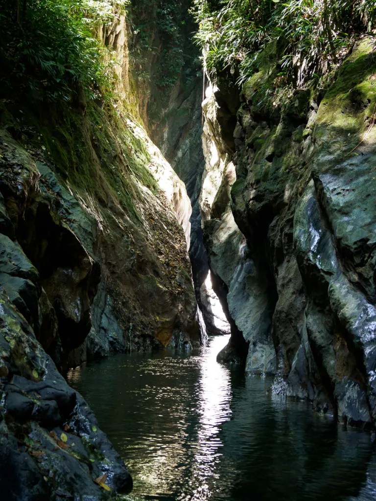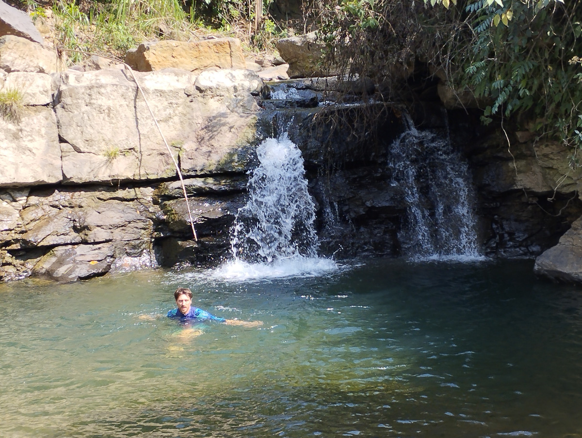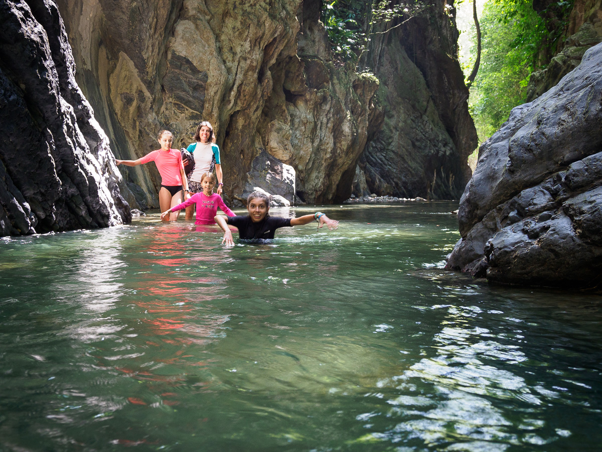 Après un succulent déjeuner et des discussions toujours passionnantes, nous reprenons la route, reposés, pour seulement 8 km. Direction le canyon de Alferez. Un bras de rivière à franchir sans pont, des champs de papayes à traverser et nous trouvons la zone de camping indiquée sur la carte. Térésa et sa famille louent en fait leur beau terrain. Nous y sommes seuls et on adore le lieu calme et retiré. Nous pouvons utiliser leur cuisine au feu de bois et écoutons attentivement les conseils de Teresa sur la cuisson du riz et du yuka. Surtout nous découvrons seuls au monde, le canyon tout proche, une gorge très étroite aux eaux limpides et turquoises, que l’on remonte à pied et en nageant. Au dessus de nous, la roche sculptée par l’eau ruisselante forment un dôme de concrétions calcaires. Plus loin, les parois sont striées par la force du courant. Nous franchissons plusieurs cascades avant d’être arrêtés par une marche plus grande. Le paysage est grandiose. On grelotte mais on adore!!