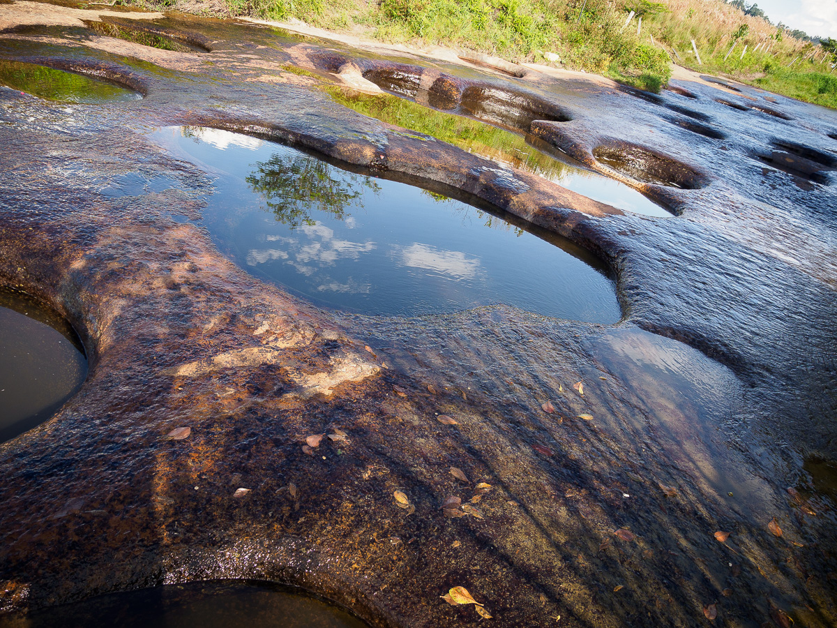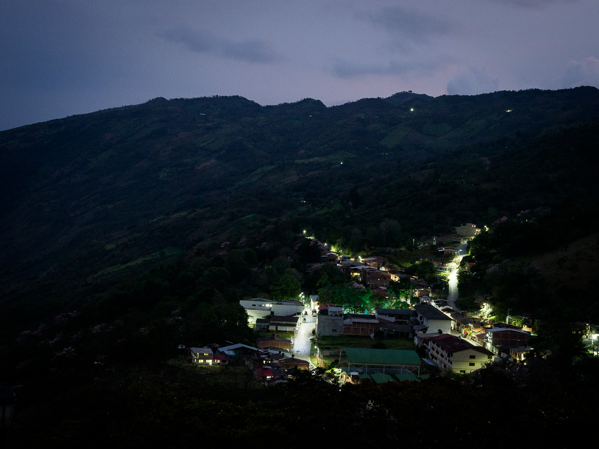 C’est un dur labeur que celui des agriculteurs ici où tout se fait à la main. Levés aux aurores à partir de 4h30, ils prennent un premier repas vers 8 ou 9h et un bon déjeuner à midi. Ils dînent léger et se couchent très tôt. Nous essayons de vivre au rythme de la finca (on fait quand même la grasse matinée jusqu’à 6h00), travaillons le matin, déjeunons avec Andres, discutons longuement et profitons des après midis pour découvrir les alentours, notamment Les Gachas, une rivière dont le lit, une grande dalle rocheuse, est sculpté de marmites naturelles. Peut être la trace de bulles d’air au moment du refroidissement des roches en fusion. Nous rentrons de nuit (pas d’inquiétude, on est sur une piste où il n’y a aucune circulation!). On adore rouler le soir… bon, nous sommes éclairés par d’impressionnants éclairs alors on met le turbo pour rentrer avant la pluie! Ce soir, nous sommes seuls avec Don Pacifico, qui s’inquiétait de nous savoir dehors par ce temps et à cette heure. Nous partageons notre soupe avec lui et il nous montre comment moudre le café de la finca qu’il vient juste de torréfier, sur un moulin certainement aussi âgé que lui!