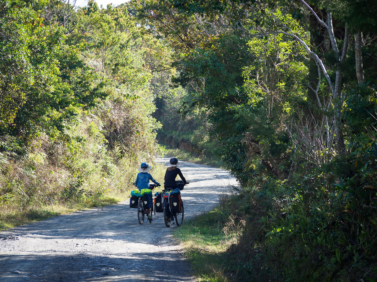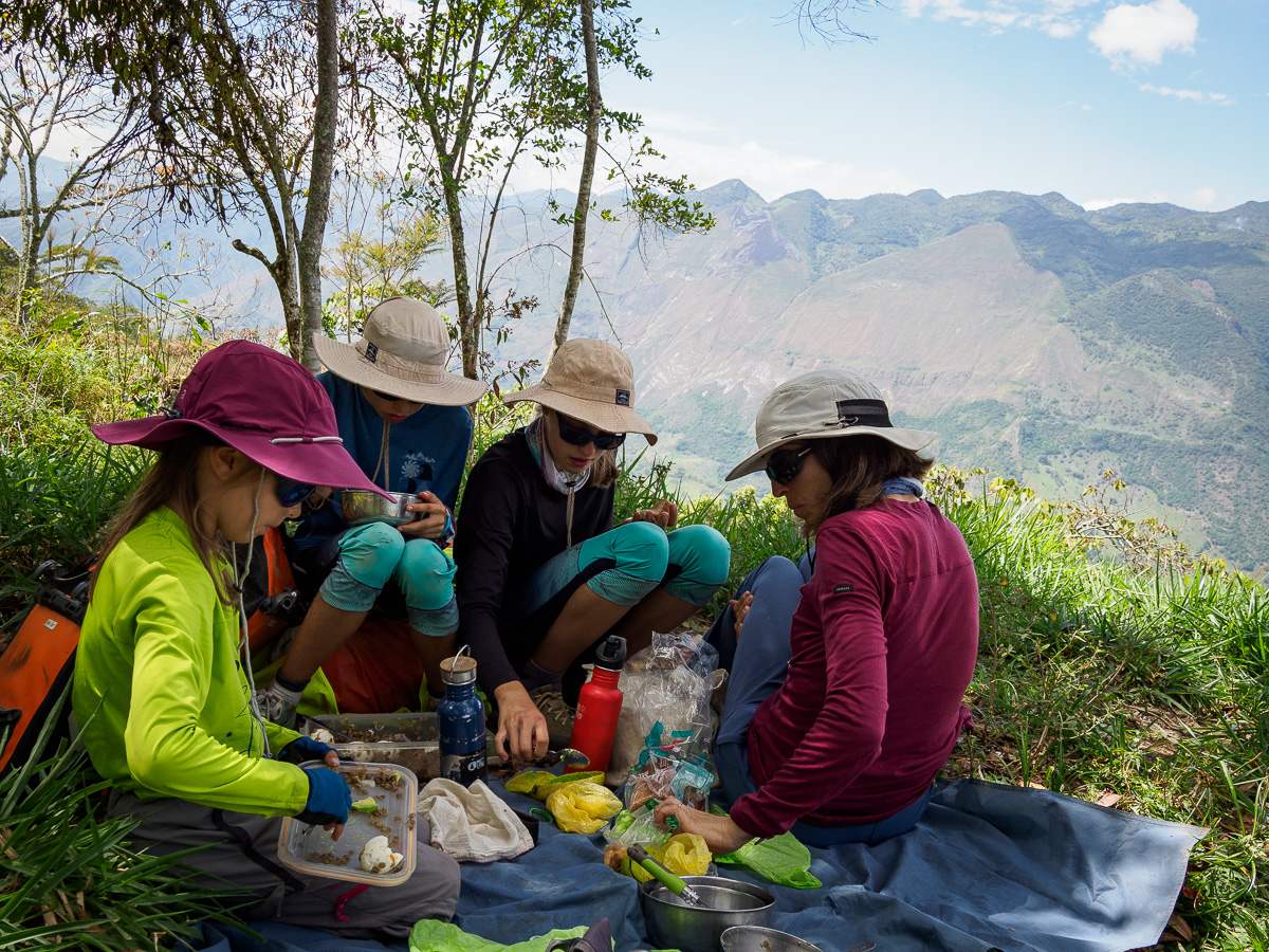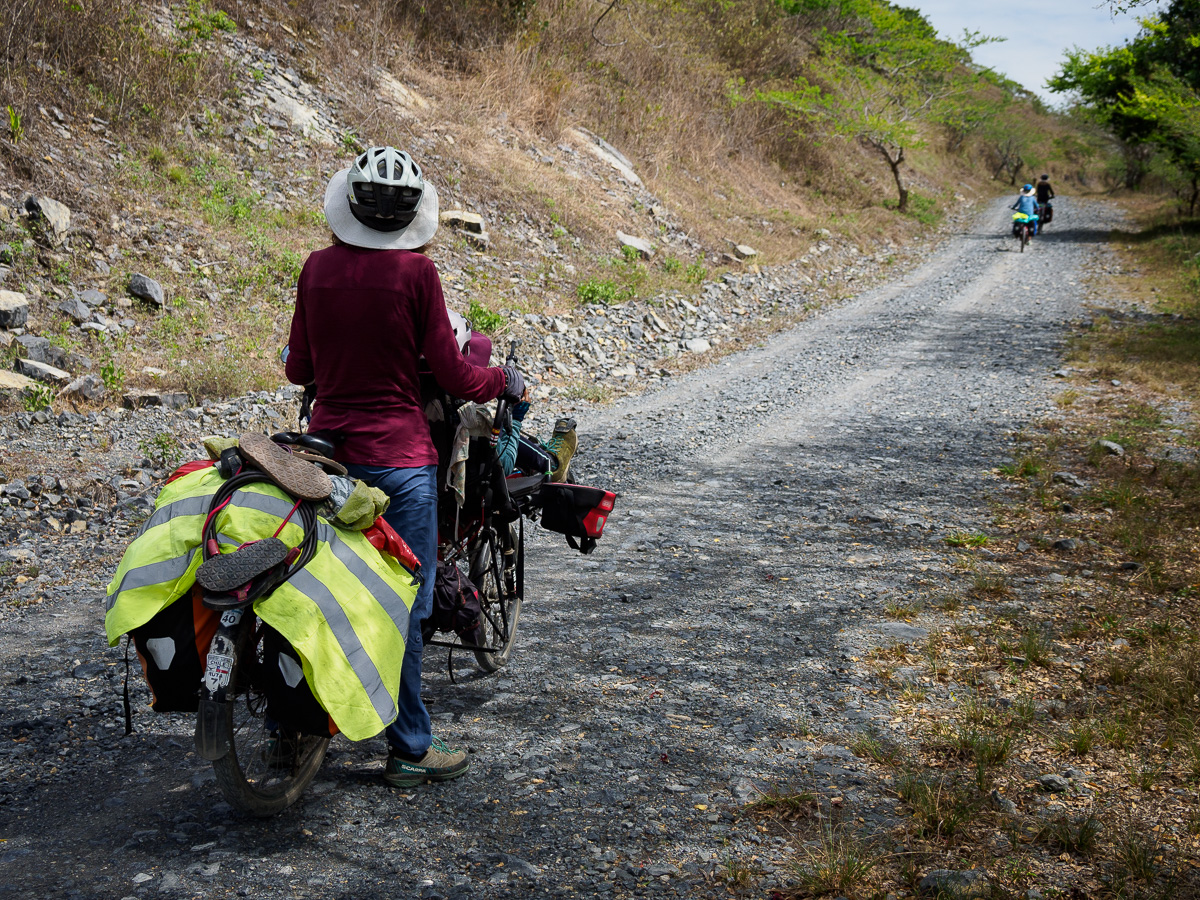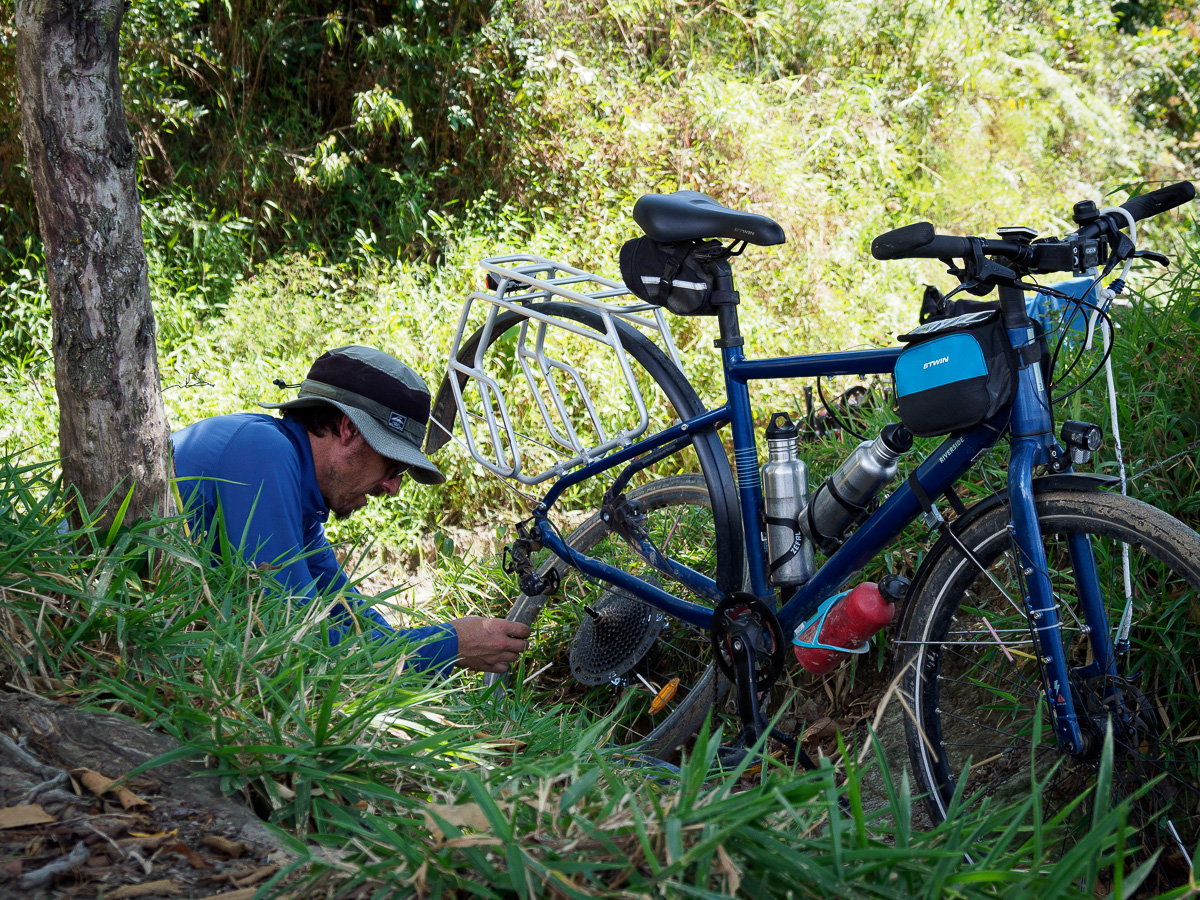 On se remet en selle et c’est une matinée qui commence mal: une piqûre d’abeille pour Damien heureusement sans gravité, un tendeur de Manon mal attaché qui se détache avec les vibrations et s’enroule sans le dérailleur en le tordant méchamment !! C’est la crise, on s’énerve. Une pause s’impose !!! On trouve un mirador spectaculaire pour le déjeuner. Devant la vue des montagnes, en savourant un délicieux avocat, les esprits se calment. Damien parvient à détordre les pièces mais nous craignons une usure prématurée de la chaîne.