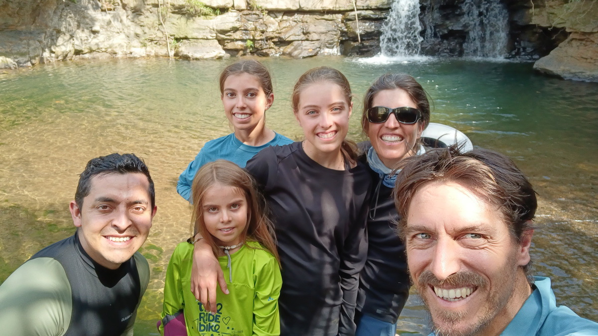 Nous nous dirigeons doucement mais sûrement vers Villa de Leyva, célèbre ville coloniale de Colombie. En fin de matinée, une voiture nous encourage. C’est Carlos, qui nous attend quelques kilomètres plus loin pour discuter… puis nous inviter chez lui pour le déjeuner… nous y resterons jusquau lendemain. Carlos et Nancy se sont installés ici il y a deux ans. Leurs enfants habitent à Bogotá mais leur fille Laura est est vacances chez eux. Ancien policier, Carlos se reconvertit dans l’agriculture. Ils nous font découvrir leur petit gouffre de baignade, préservé et sauvage comme on les aime. Les discussions vont bon train sur tous les sujets notamment politiques et nous nous régalons d’échanger, de rire, de partager simplement et chaleureusement.
