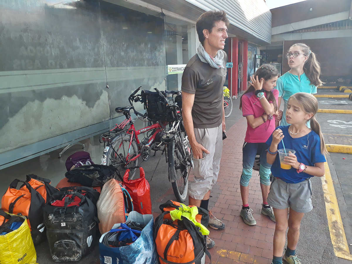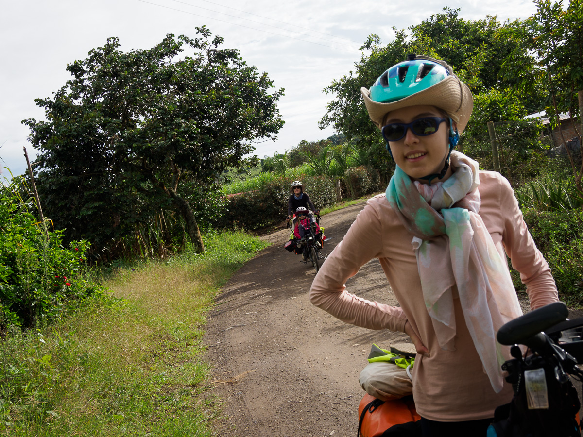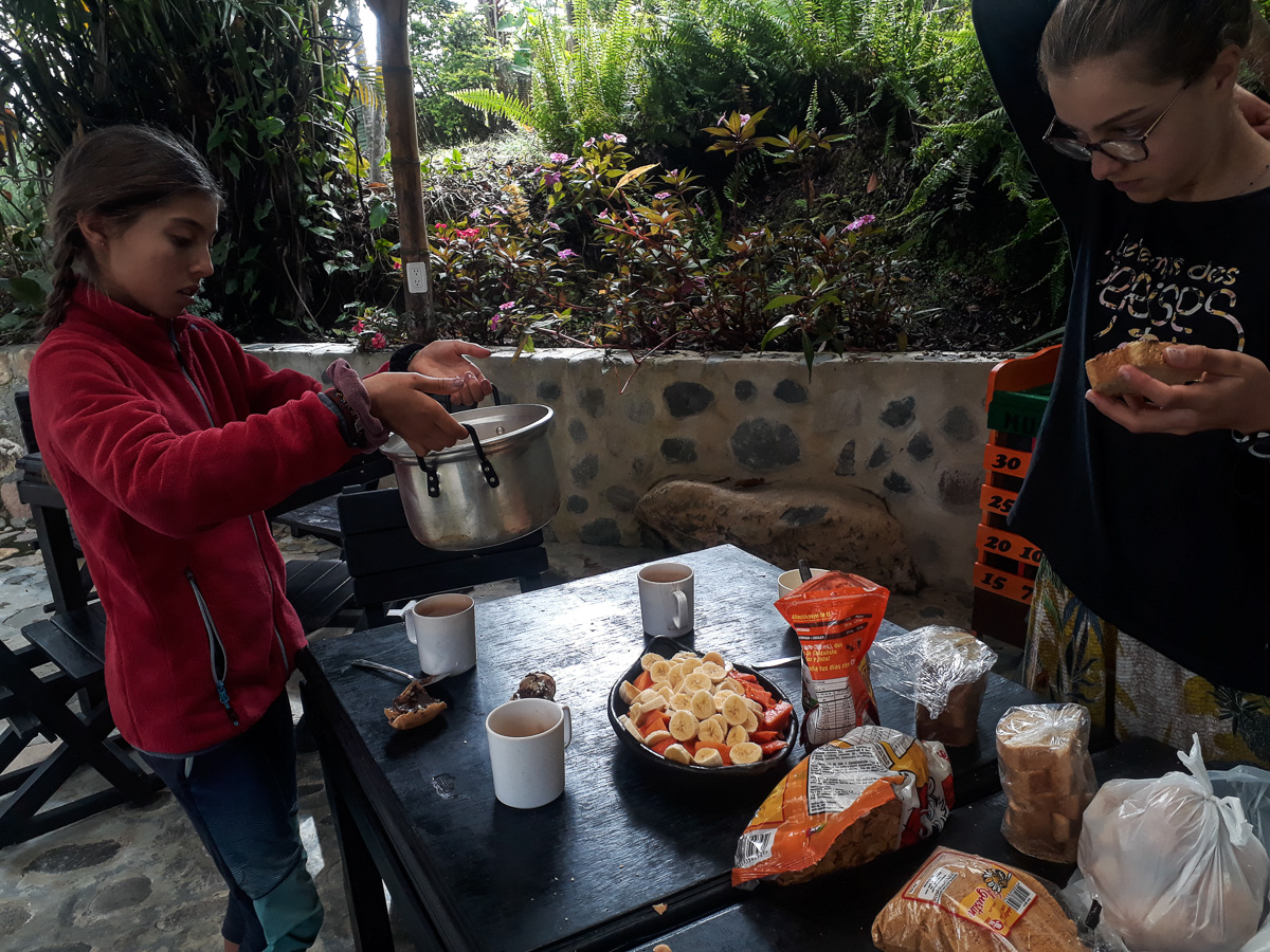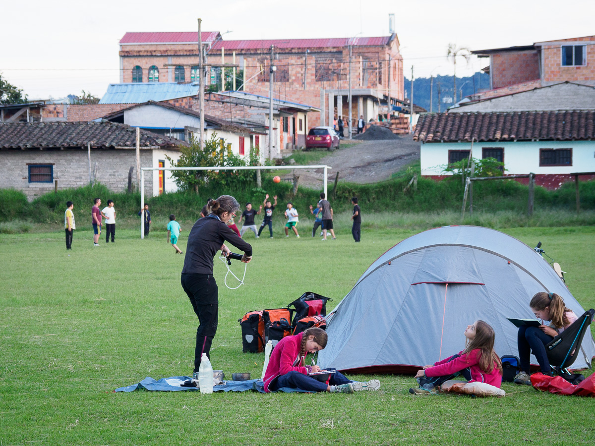 En reprenant les vélos depuis notre cabane enchantée, nous faisons une première halte à la finca de notre guide Umberto. Il nous y a invités pour découvrir toutes ces plantations. Nous y goûtons deux nouveaux fruits, le nispero, sorte de nèfle, et le caïmo, au goût étrange de camembert! Nous longeons l’impressionnant canyon du Magdalena, encore simple torrent de montagne ici. Toujours aussi vertigineux!! Les pentes sont à nouveau couvertes de cafés et de canne à sucre. Cela nous rappelle le Santander. En quelques minutes, nous nous trouvons au fond du canyon, l’estrecho du Magdalena. En quelques heures, nous revoilà au sommet de l’autre côté. La remontée fut courte mais très raide. Des maisons blanches rehaussées de détails colorés, une petite église, des beignets au fromage vendus dans la rue… une vie de village typique de Colombie. Nous campons sur le terrain de football. Les filles y jouent avec Scarlett et son amie. La famille de Scarlett nous fait goûter la gourmandise locale, du collagène extrait des pattes de vaches sucré à la panela. Ils nous prêtent aussi leur salle de bain et remplissent nos gourdes. Ils nous conseillent de bien faire bouillir l’eau car elle semble polluée par les pesticides utilisés dans les champs d’avocats. Pas sur que ce soit bien efficace.