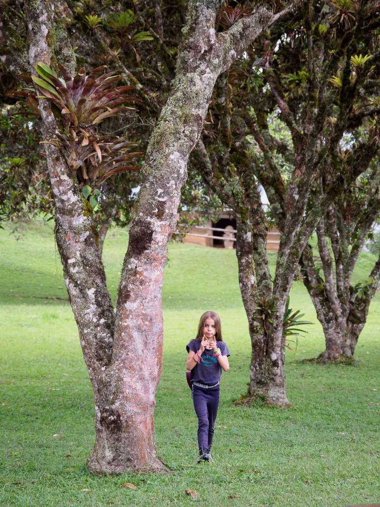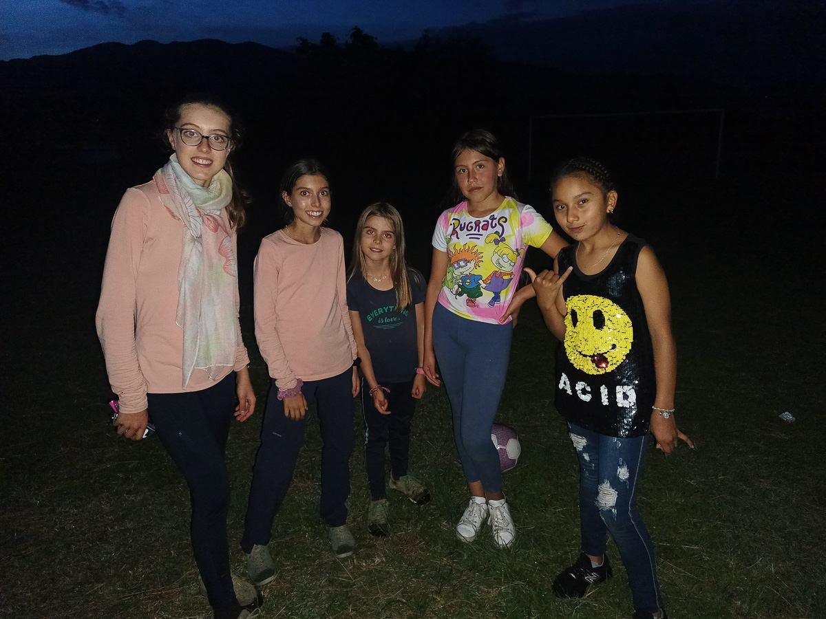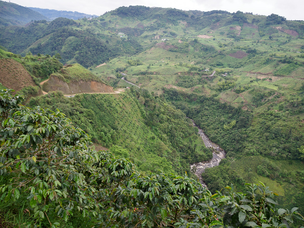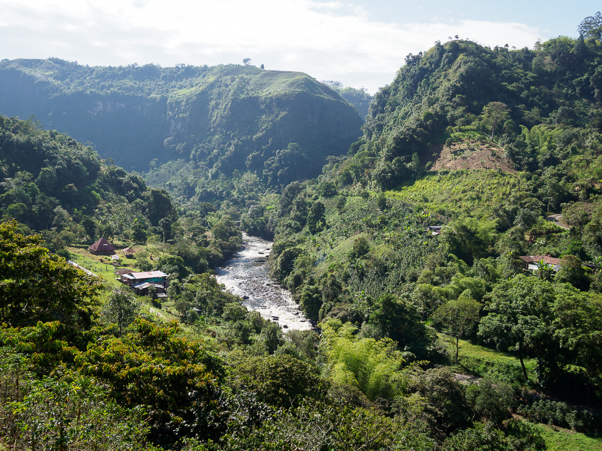 En reprenant les vélos depuis notre cabane enchantée, nous faisons une première halte à la finca de notre guide Umberto. Il nous y a invités pour découvrir toutes ces plantations. Nous y goûtons deux nouveaux fruits, le nispero, sorte de nèfle, et le caïmo, au goût étrange de camembert! Nous longeons l’impressionnant canyon du Magdalena, encore simple torrent de montagne ici. Toujours aussi vertigineux!! Les pentes sont à nouveau couvertes de cafés et de canne à sucre. Cela nous rappelle le Santander. En quelques minutes, nous nous trouvons au fond du canyon, l’estrecho du Magdalena. En quelques heures, nous revoilà au sommet de l’autre côté. La remontée fut courte mais très raide. Des maisons blanches rehaussées de détails colorés, une petite église, des beignets au fromage vendus dans la rue… une vie de village typique de Colombie. Nous campons sur le terrain de football. Les filles y jouent avec Scarlett et son amie. La famille de Scarlett nous fait goûter la gourmandise locale, du collagène extrait des pattes de vaches sucré à la panela. Ils nous prêtent aussi leur salle de bain et remplissent nos gourdes. Ils nous conseillent de bien faire bouillir l’eau car elle semble polluée par les pesticides utilisés dans les champs d’avocats. Pas sur que ce soit bien efficace.