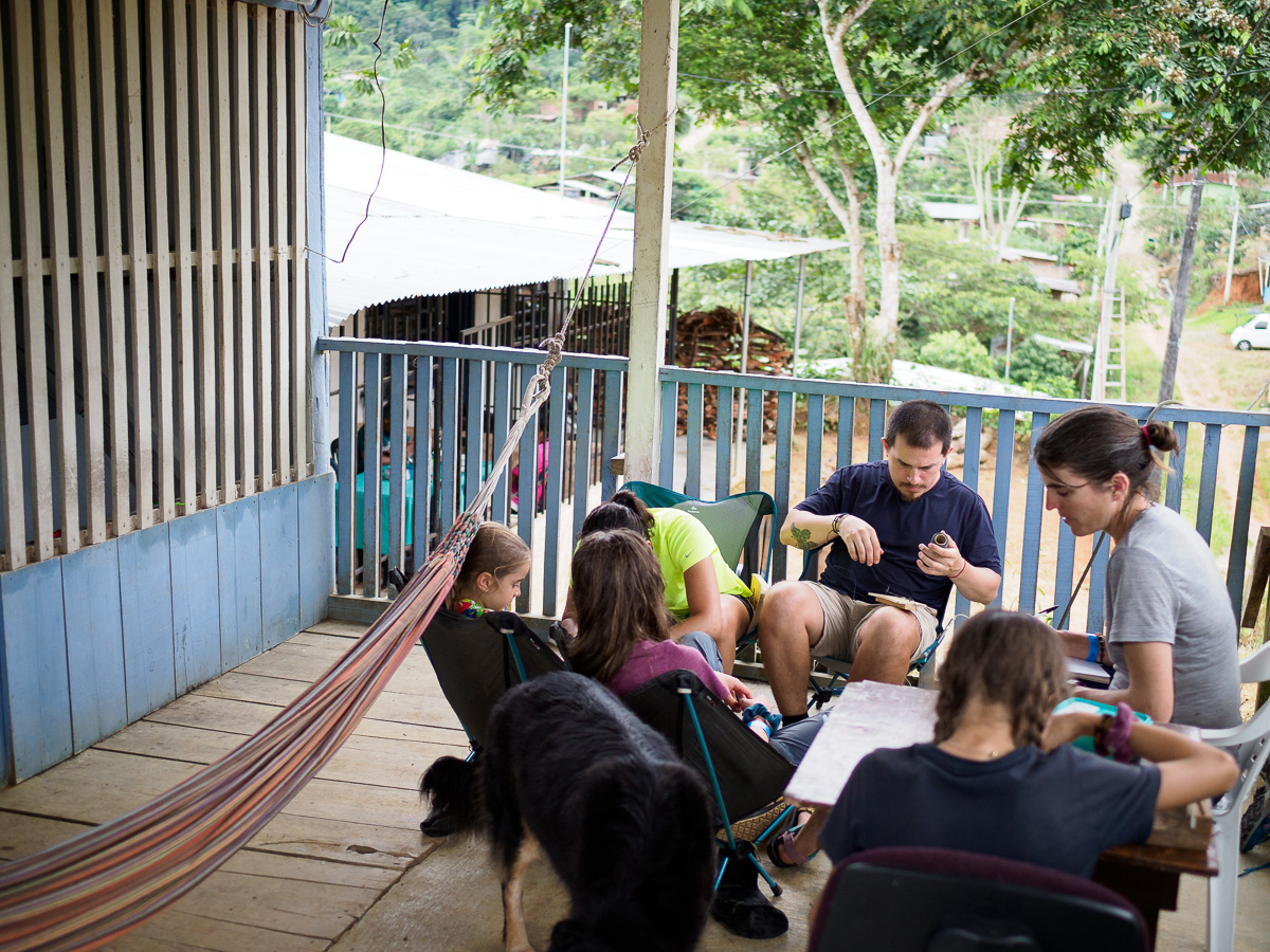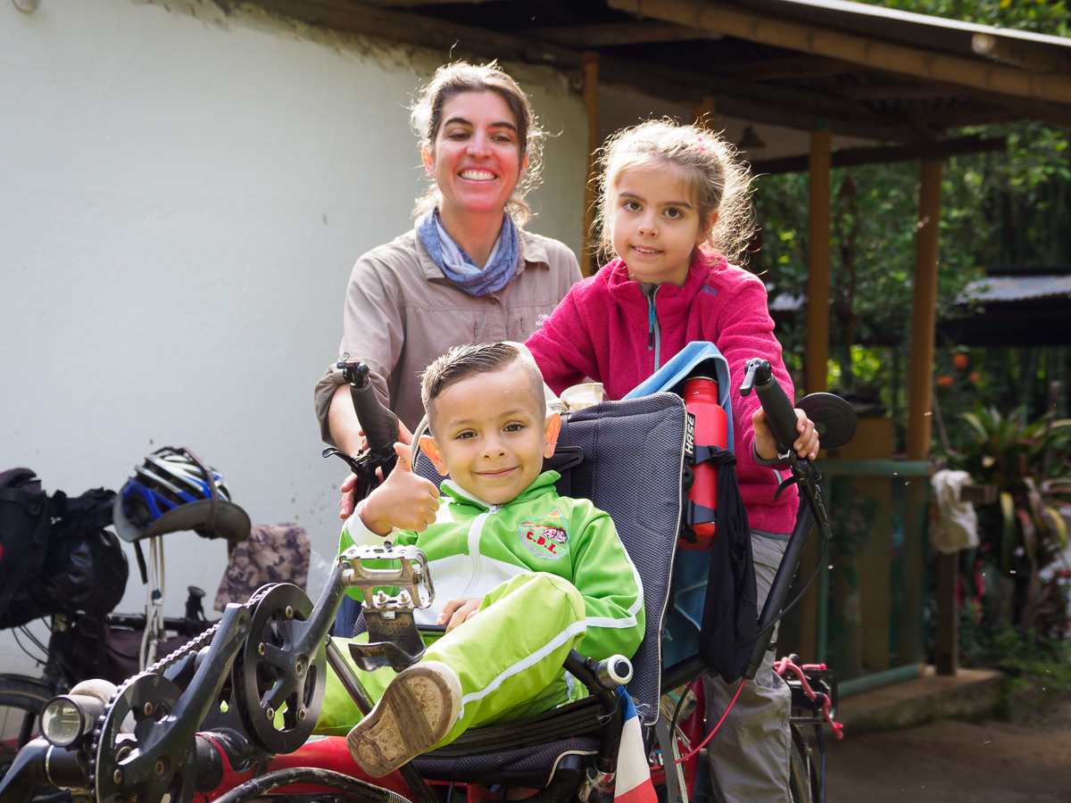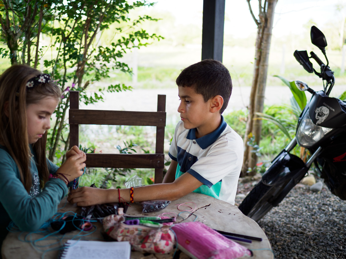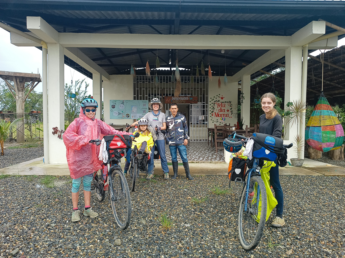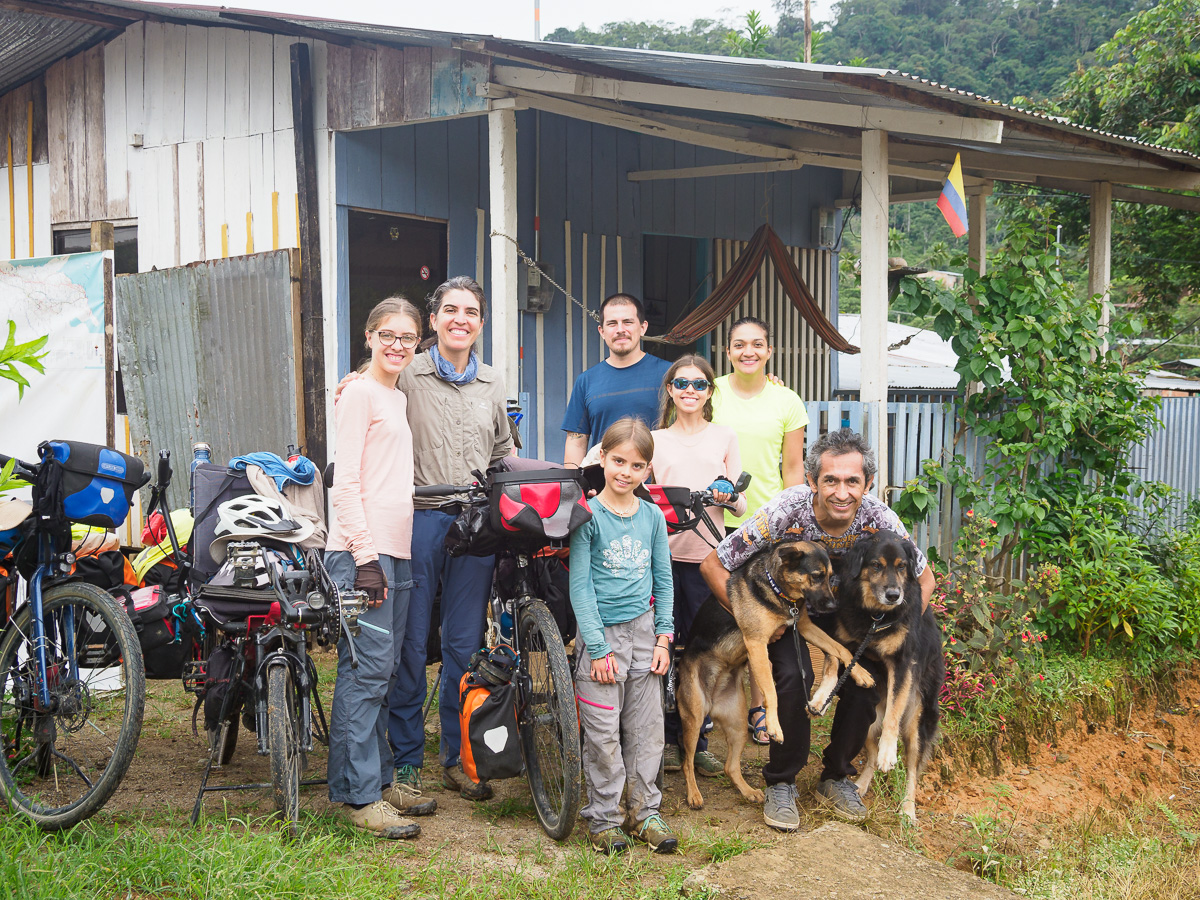 Le lendemain, même scénario que la veille: c’est une succession de montagnes russes qui nous amènent à Mocoa. Après un tour en ville et au marché, nous nous dirigeons vers la Casa de Ciclista de Ferney. Il a arpenté les routes de Colombie avec son chien Jager pendant trois ans et s’est installé depuis ici pour recevoir des voyageurs. Sa maison, toute en bois, est située dans un petit hameau à 6 km de Mocoa. Nous occupons la deuxième chambre de la maisonnette. C’est simple et chaleureux a l’image de Ferney. Nous y passerons 5 jours, dont 3 de pluie incessante. C’est la saison humide et certains orages sont diluviens. Nous sommes encore un peu en altitude et la chaleur, bien que moite est agréable. Nous cuisinons, lisons, dessinons. Nous apprenons à faire des bracelets. Ferney est très inspirant et nous aimons qu’il nous raconte son histoire. Nous partageaons nos « madeleines de Proust ». Héloïse passe ses après-midis à jouer avec les petites voisines, allant d’une maison à l’autre tout à fait à l’aise. Les deux derniers jours, 4 autres cyclistes dont Carlos, qui nous avait hébergés à Neiva, nous rejoignent et la maison prend des airs d’auberge espagnole.