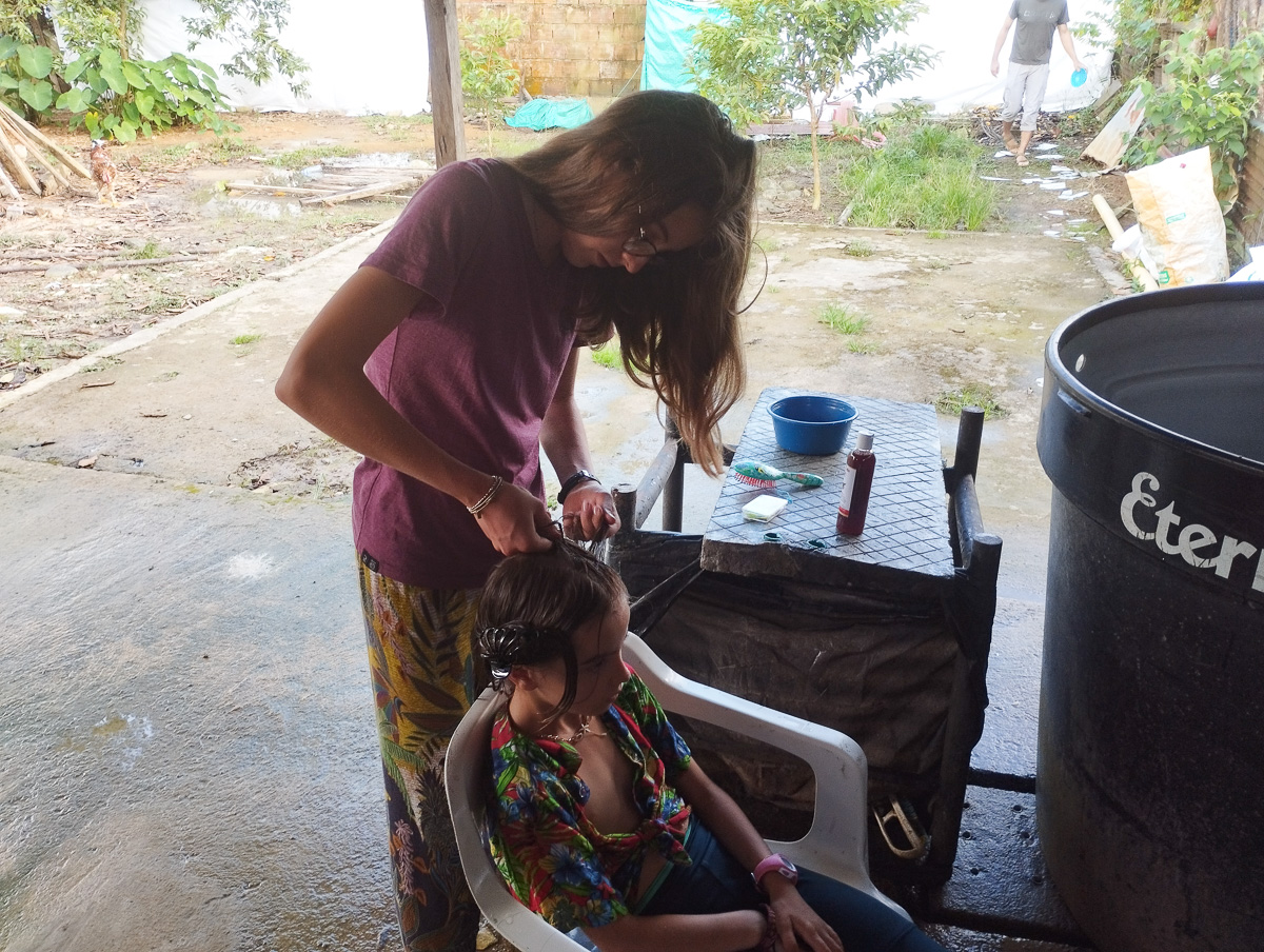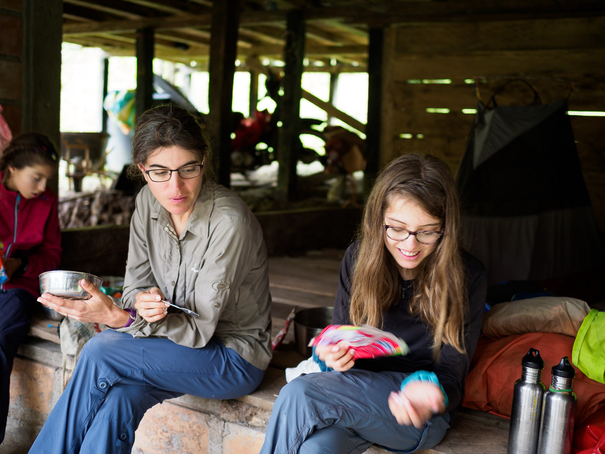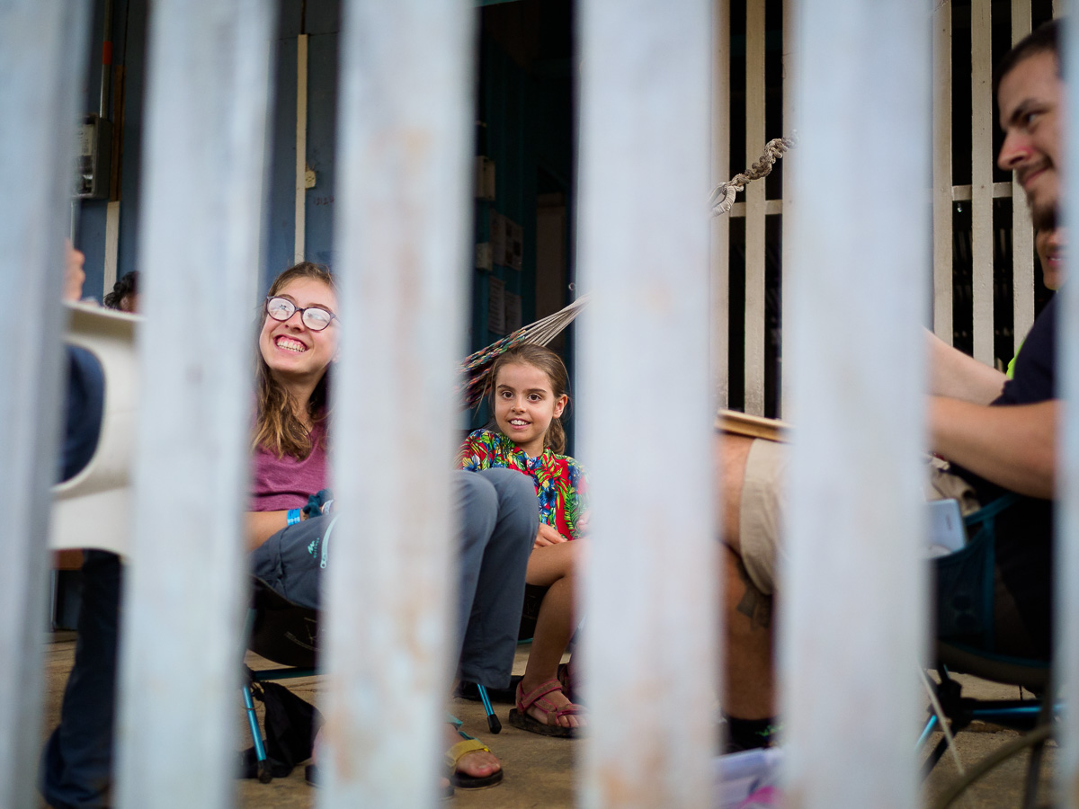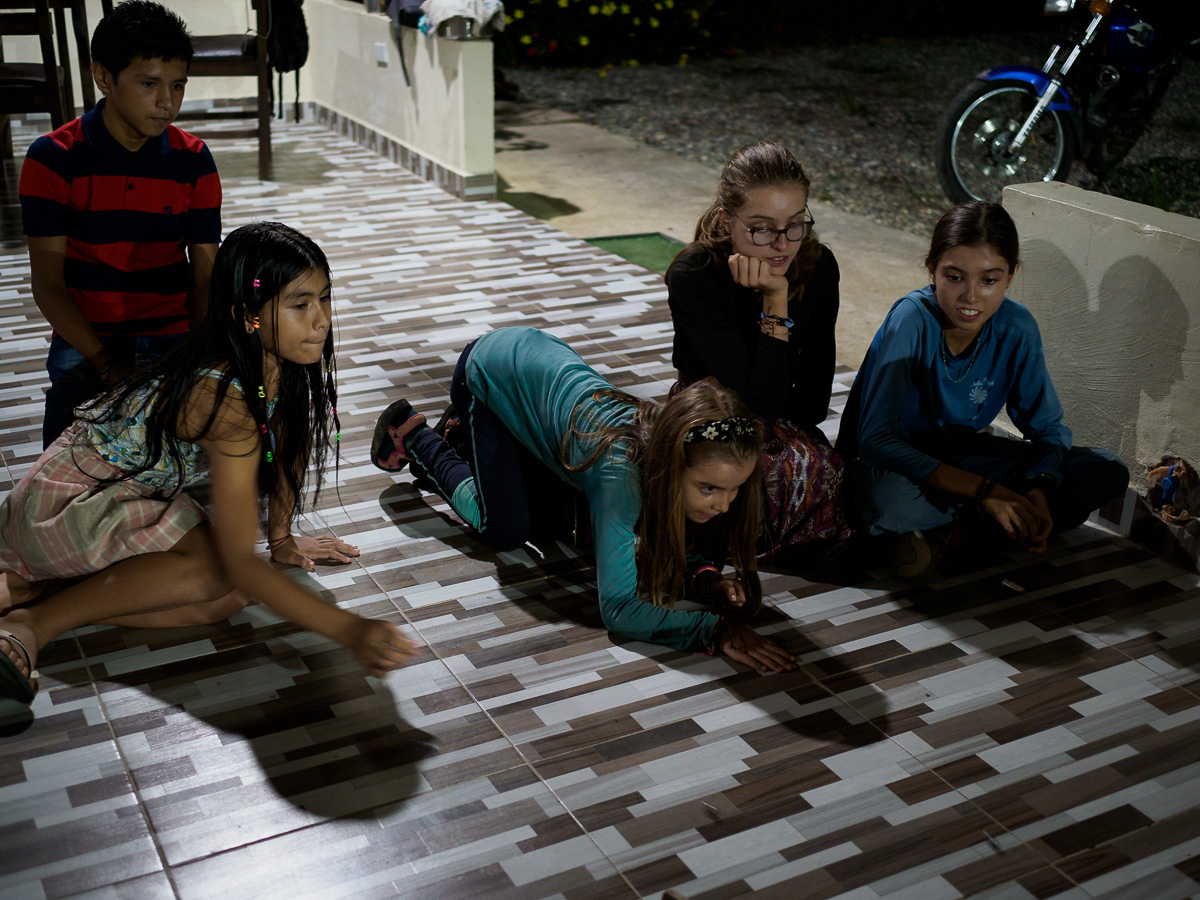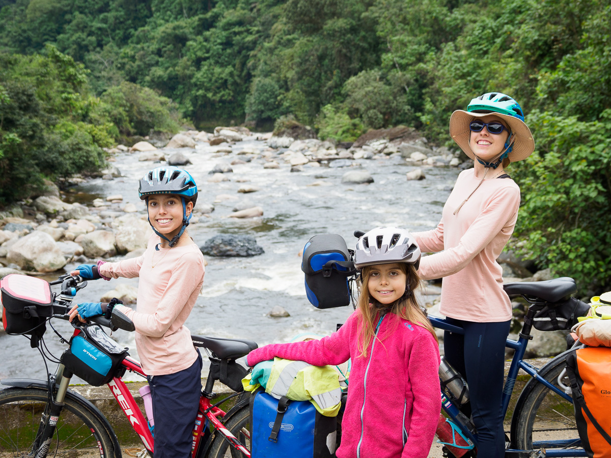 Le lendemain, même scénario que la veille: c’est une succession de montagnes russes qui nous amènent à Mocoa. Après un tour en ville et au marché, nous nous dirigeons vers la Casa de Ciclista de Ferney. Il a arpenté les routes de Colombie avec son chien Jager pendant trois ans et s’est installé depuis ici pour recevoir des voyageurs. Sa maison, toute en bois, est située dans un petit hameau à 6 km de Mocoa. Nous occupons la deuxième chambre de la maisonnette. C’est simple et chaleureux a l’image de Ferney. Nous y passerons 5 jours, dont 3 de pluie incessante. C’est la saison humide et certains orages sont diluviens. Nous sommes encore un peu en altitude et la chaleur, bien que moite est agréable. Nous cuisinons, lisons, dessinons. Nous apprenons à faire des bracelets. Ferney est très inspirant et nous aimons qu’il nous raconte son histoire. Nous partageaons nos « madeleines de Proust ». Héloïse passe ses après-midis à jouer avec les petites voisines, allant d’une maison à l’autre tout à fait à l’aise. Les deux derniers jours, 4 autres cyclistes dont Carlos, qui nous avait hébergés à Neiva, nous rejoignent et la maison prend des airs d’auberge espagnole.