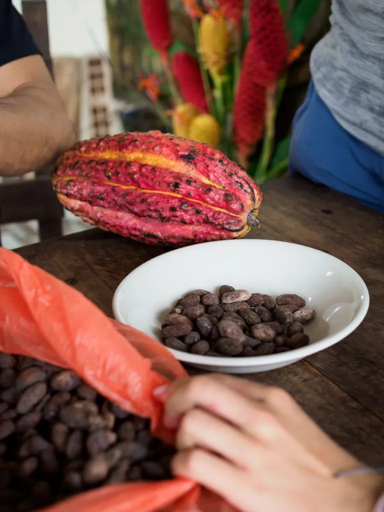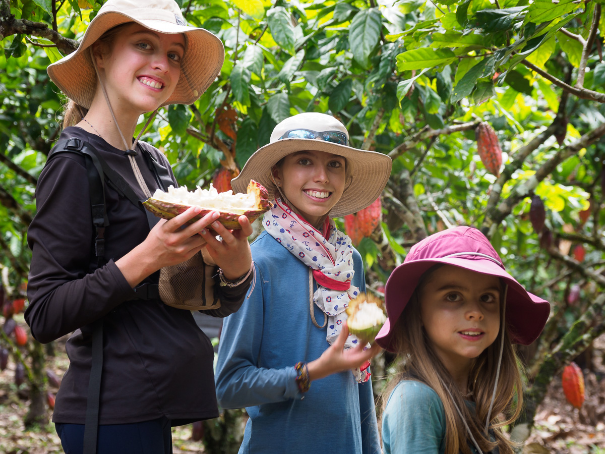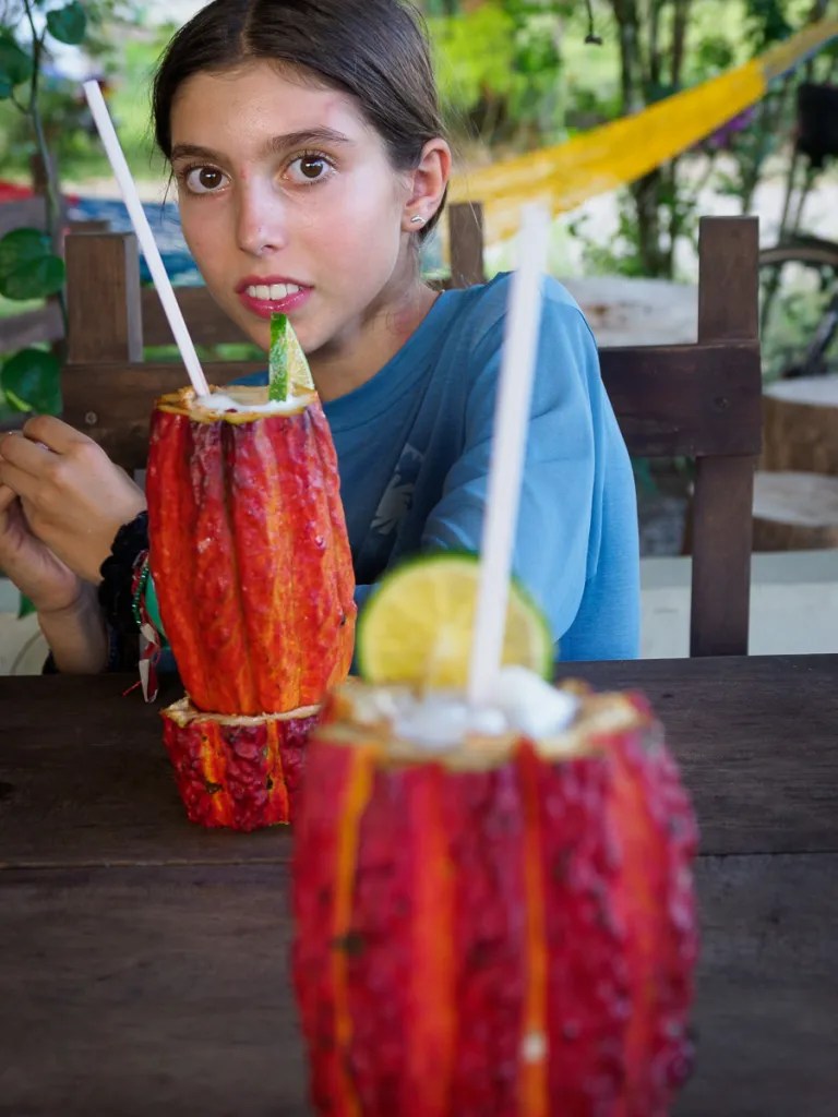 La visite de la finca de cacao est très instructive. Nous dégustons le fruit du cacao, le mucilage qui entoure la pépite qui est ensuite séchée pour faire le chocolat. C’est un délice pour les sens, une texture blanche et sucrée, fondante et légèrement acidulée. Nous goûtons les différentes variétés et notons les nuances que l’on retrouve ensuite dans le chocolat. Un bruit dans les grands arbres bordant la finca… une boule de poils volant de branches en branches: les titis rouges, une espèce de primates, nous épient depuis leur tour de contrôle !! quel spectacle quand un vol de toucans vient compléter le tableau. Nous nous arrêtons chez Nancy pour nous régaler du miel de son mari directement prélevé dans les ruches. Nos papilles gustatives reconnaissent cette saveur oubliée depuis 6 mois et en redemandent !