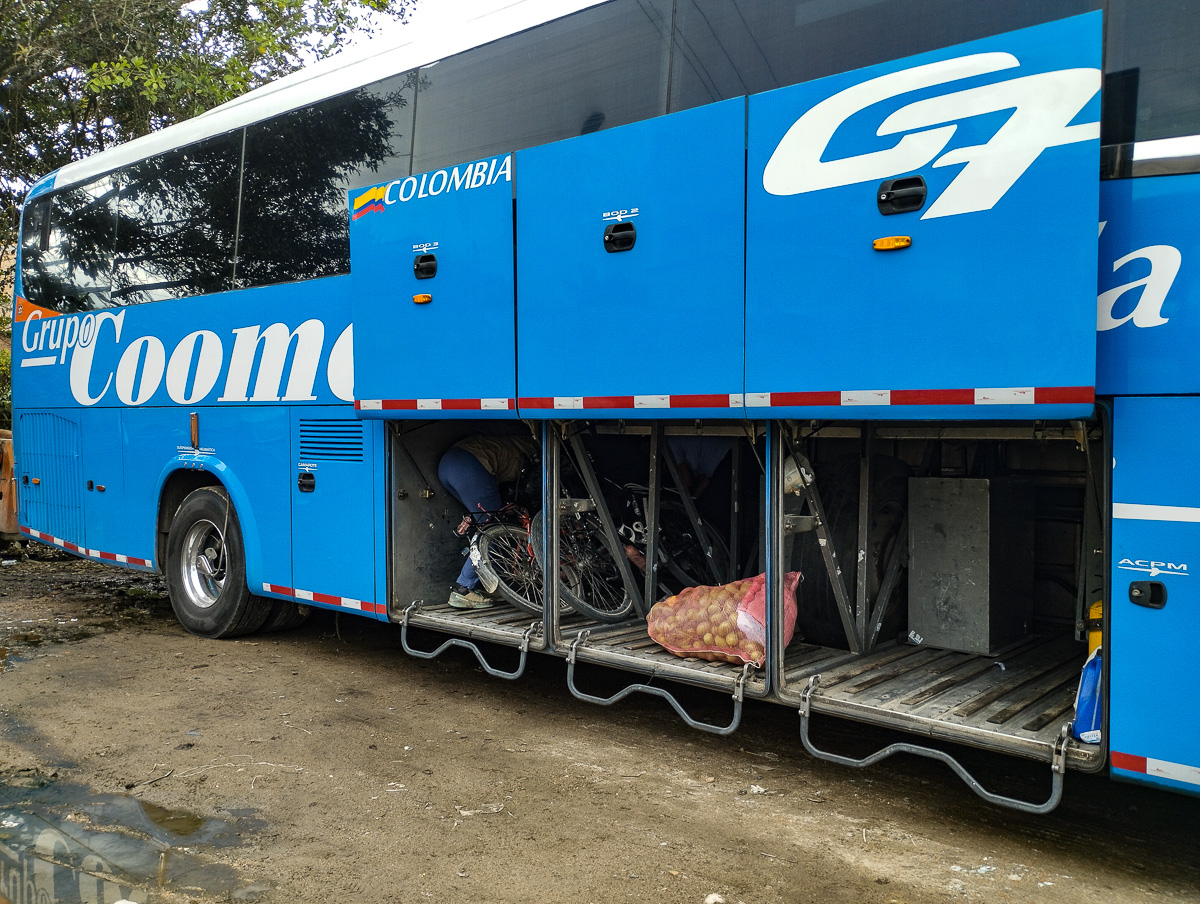 De Neiva, nous décidons de prendre un bus pour San Augustin 250 km plus au sud. Sur le papier, les compagnies nous confirment la faisabilité de notre projet. Lever à 4h00 pour tenter d’attraper le bus de 6h30… premier échec. La soute de ce bus à 2 étages est déjà pleine. À 10h00, mission accomplie. Nous sommes presque seuls et nos vélos sont chargés « délicatement » par le chauffeur.