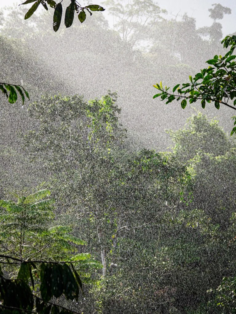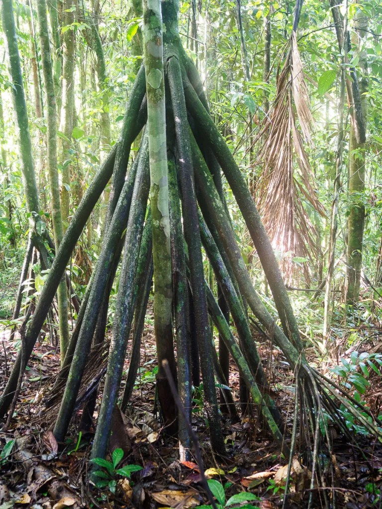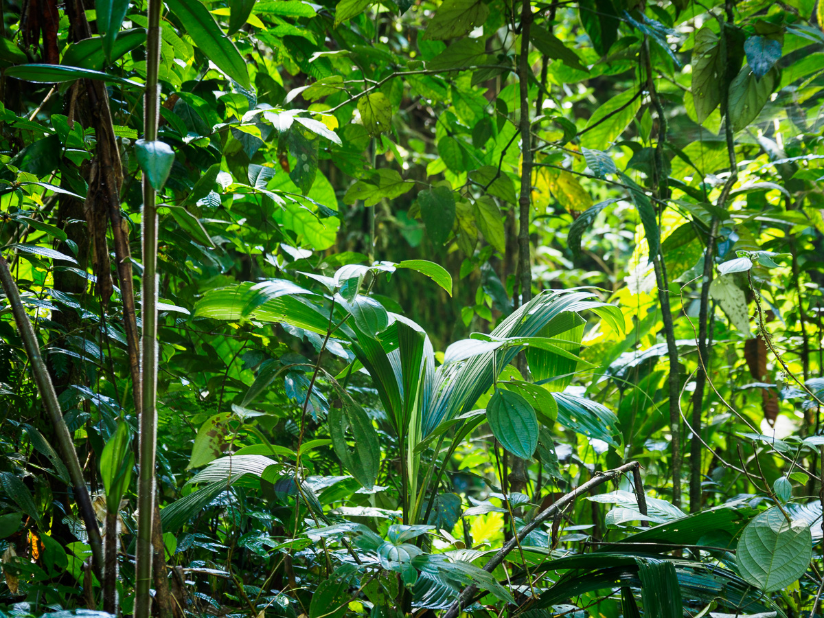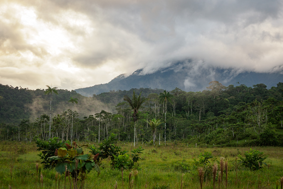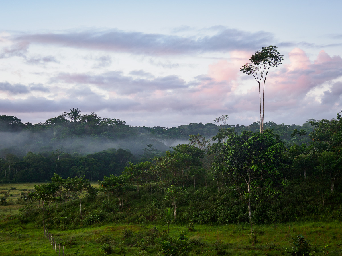 Alors que nous disuctons, leur chauffeur les avertit de la présence d’un serpent corail. Tels des enfants passionnés, ils courrent le récupérer pour le photographier. Je vous invite à voir le compte Instagram de Memo Gomez pour admirer leurs photos (@memogomez). Le serpent, petit, n’en est pas moins impressionnant. D’ailleurs, nous leur montrons la photo du serpent sur lequel j’avais failli marcher il y a quelques mois dans le parc de Tayrona: un fer de lance, l’un des plus mortels… Après ces rencontres reptiliennes, la nuit sera dure pour Héloïse ! Le lendemain, nous arpentons dans un silence solennel la forêt amazonienne à la recherche de primates. Plus nous nous enfonçons, plus il fait sombre et nous sommes à l’affût du moindre bruit. Pas de chance, nous ne les verrons pas mais avons apprécié cette approche du monde amazonien intimidant, cette bouffée de chlorophylle et d’humidité. Humidité qu’il n’est pass facile de supporter quand même. Herureusement, il y a peu de moustiques,. seuls des moucherons quasi-invisibles nous laissent après coup de vilaines marques sur les chevilles. Nous admirons les couleurs du soir sur les contreforts des Andes. Nappes de brouillards fugaces et cris des oiseaux nocturnes transforment cet océan de verdure en un lieu mystique et encore plus hostile quil ne peut l’être.