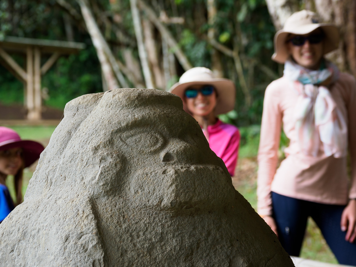 Surtout, nous faisons un voyage dans le temps, entre 1500 ans avant JC et 900 après, au coeur d’une civilisation pré-colombienne aussi mystérieuse que fascinante. Il s’agit d’une des plus grandes nécropoles au monde. Aucune trace d’écriture n’a été trouvée et les hypothèses vont bon train au sein de la communauté archéologique. Cette civilisation disparue a profité de la topographie des lieux pour créer des tumulus, recouvrant de gigantesques tombes. Des statues en pierres volcaniques mi humaines mi animales, ont été découvertes au fil des siècles par les paysans. Ils les utilisaient comme piliers avant que deux archéologues s’intéressent à ces oeuvres d’art. Elles sont la preuve d’une societe hierarchisée et socialement très avancée, dont nous ne savons que peu de choses. Les tombes étaient gardées par ces sculptures représentant le défunt. Toutes symétriques, elles arborent des artifices spécifiques comme les dents de jaguar, symbole de la terre, les yeux d’aigles, représentant les cieux, et tiennent souvent des serpents pour illustrer le monde souterrain. Notre guide, Umberto, est passionnant, il nous fait voyager au son de sa flûte traditionnelle la kuna, et nous initie aussi à la méditation. Nous nous laissons envoûter par la magie des lieux que nous découvrons seuls. Une chose nous fascine surtout: les tombes sont des dolmens comme ceux trouvés en France ou dans le nord de l’Europe. Comment finalement des peuples si éloignés en temps et en kilomètres ont adopté des coutumes similaires? À creuser….