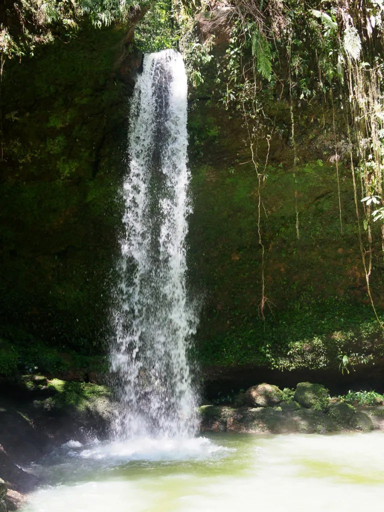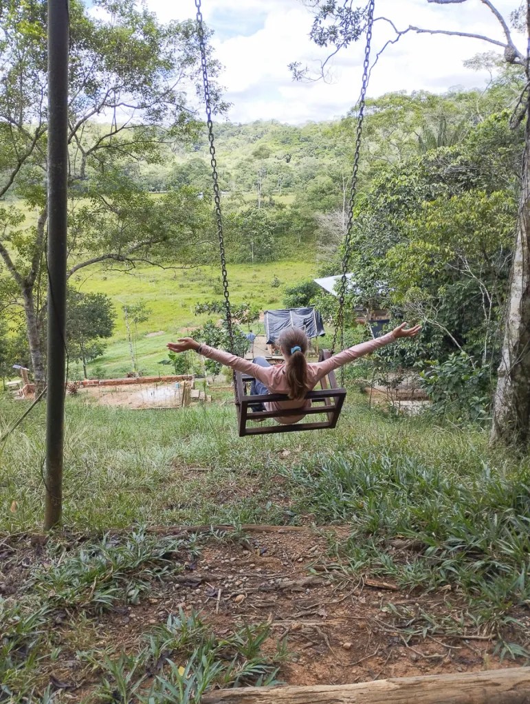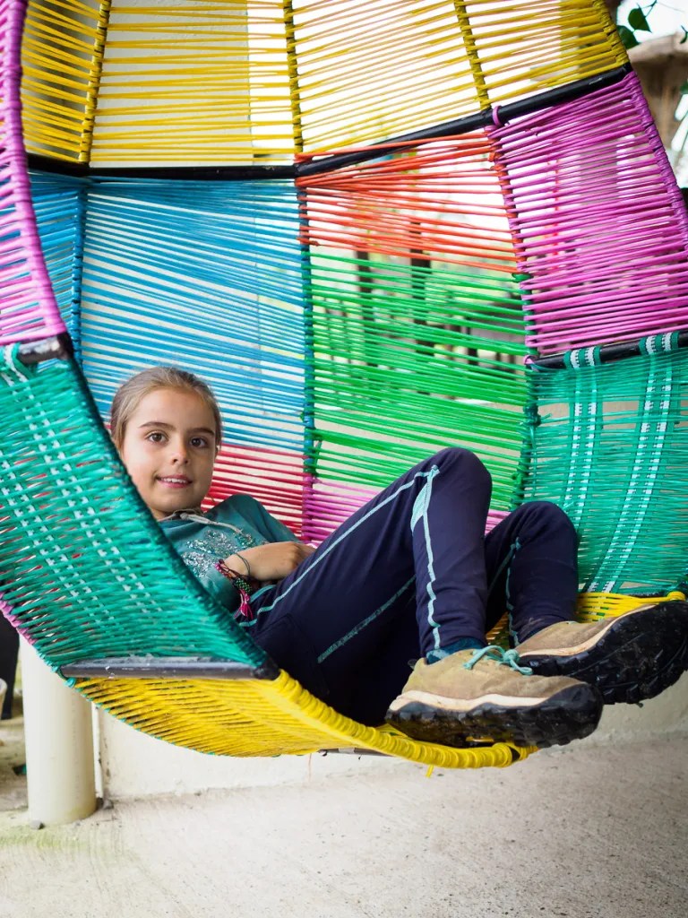 Et c’est un grand soleil qui nous réveille le matin. On choisit une belle piste entre des petites fincas toutes bien entretenues et fleuries. En ce dimanche matin, les familles discutent paisblement devant leur porte. Alors que nous rejoignons l’axe principal, nous décidons de faire une halte à la cascade de Mortino. Le site naturel a été aménagé en parc d’attractions, avec piscine, tyroliennes et balançoires. Sensation garantie quand nous survolons la cascade et son cirque de 130 mètres. On se demande surtout comment les parois en argile complètement depourvues de végétation ne se sont pas encore effondrées sous l’effet des pluies.