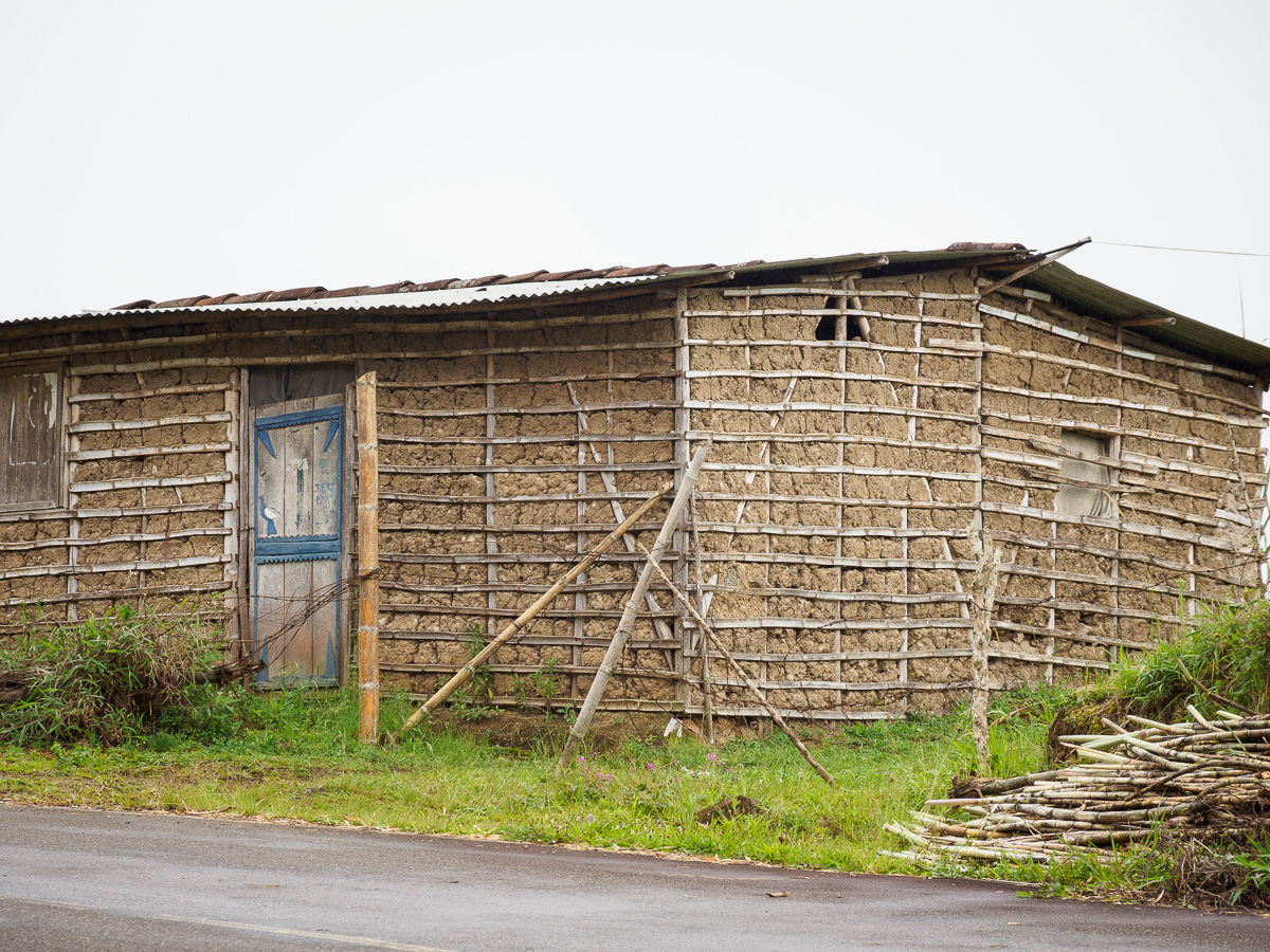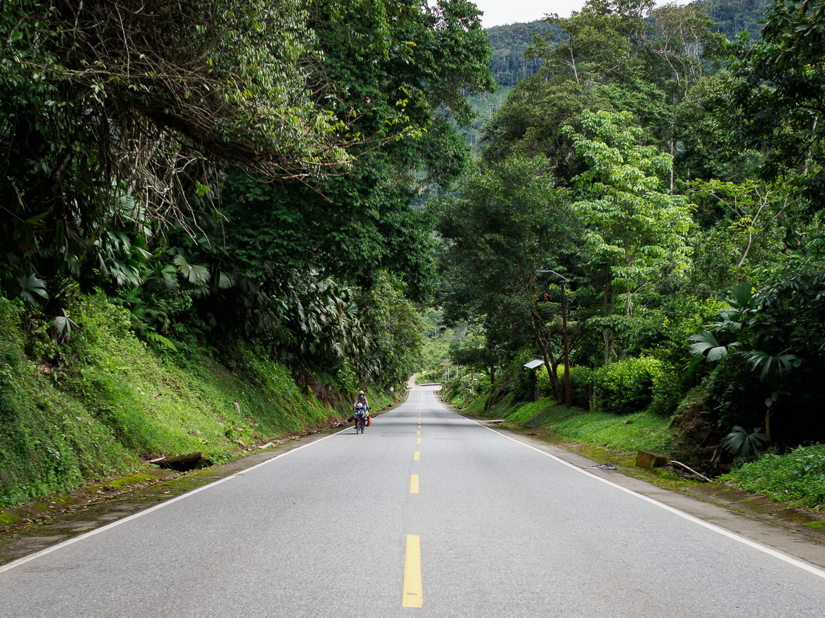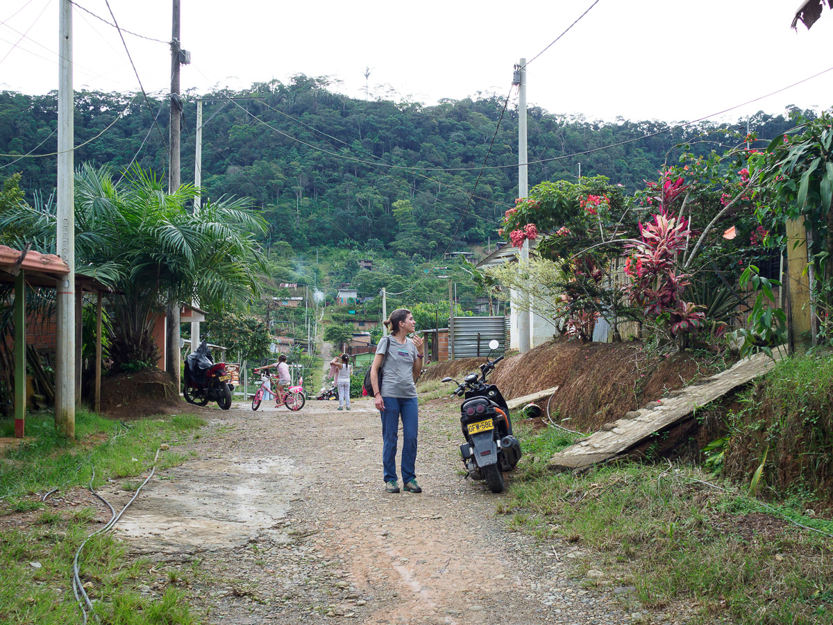 La même bruine nous accompagne sur les premiers kilomètres du lendemain, mais au fur et à mesure que nous descendons, la chaleur la rend bien plus supportable. Nous nous enfonçons de plus en plus dans la forêt. Plus de pâturâges en vue, seules quelques maisons bordent la route, toutes en bois elles aussi. En roulant, nous suivons le vol hypnothique des papillons, compagnons de voyage éphémères aux teintes satinées. Ca monte et ça descend, et c’est dur pour les jambes et le moral, cette sensation – que l’on connait bien en Colombie – de ne faire que monter dans une descente !