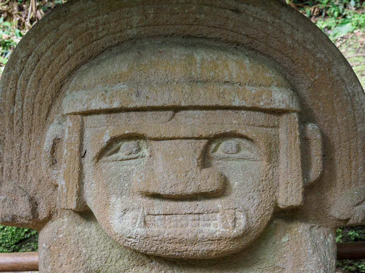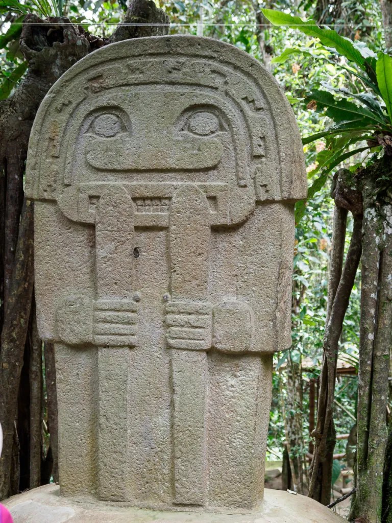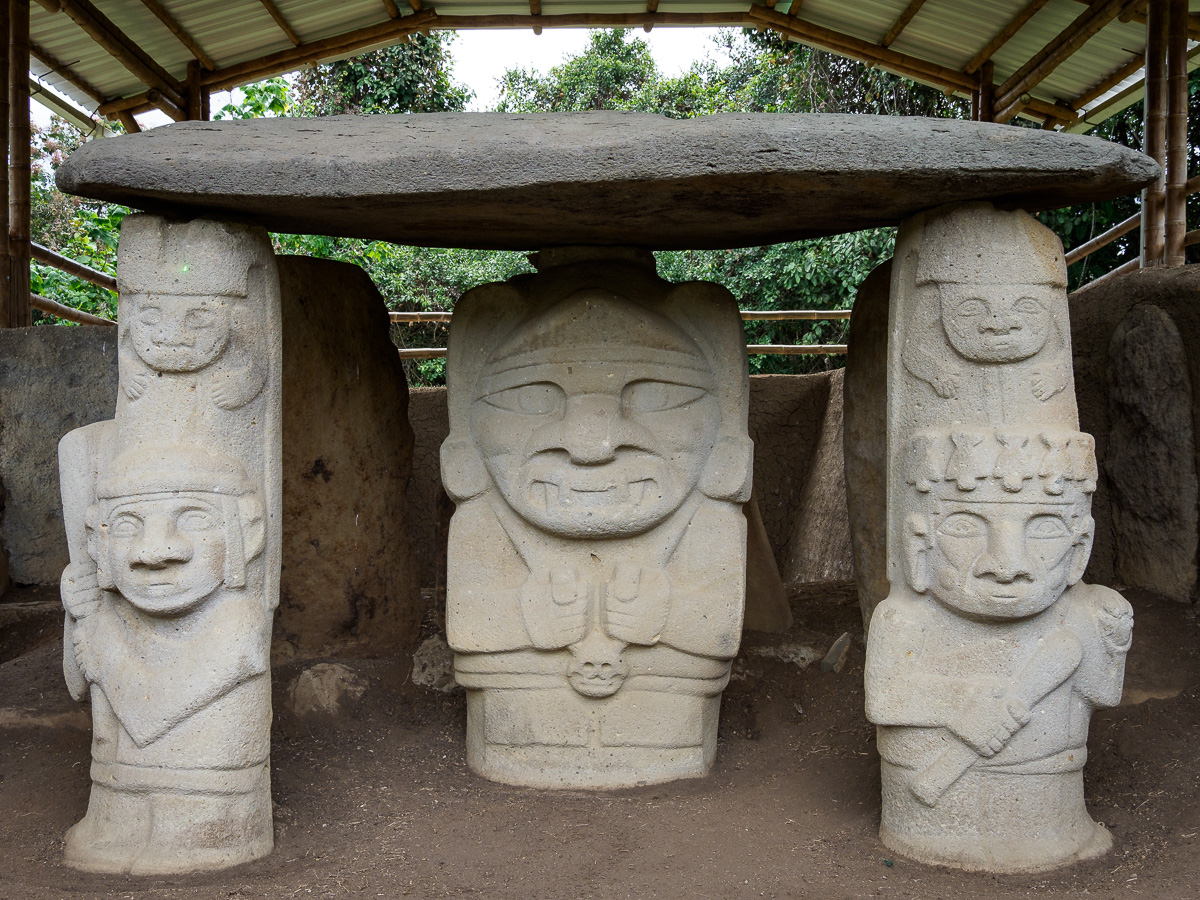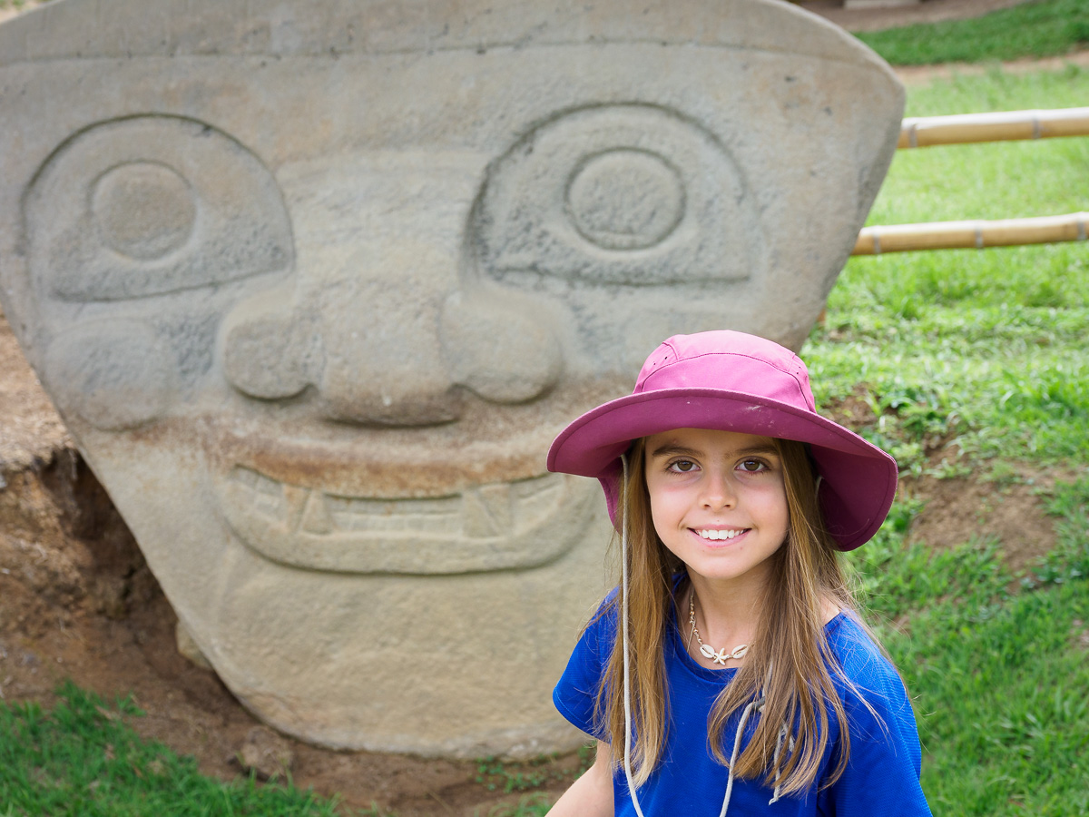Après une grasse matinée dans la tente sous un petit crachin désagréable, nous sillonons champs de café et de canne à sucre, franchissons un barrage de cultivateurs en grève et en colère mais souriants et amicaux avec nous. Encore un profond canyon bien pentu, une montée qui a raison de notre souffle et de nos jambes. Une pause » papas rellenas » s’impose. La grand mère a un sourire charmant et maternel. Elle nous offre les cafés et veut garder Heloise. Nous atteignons le second site archéologique l’alto de los idolos. Nous nous laissons encore une fois porter par la magie et la solennité des lieux, seuls entre statues et tombes. Nous notons quelques petites différences, avec le site précédent, ce qui rajoute encore un peu de mystère. Nous demandons à camper sous le preau du restaurant voisin pour passer une fin d’après midi tranquille au vu de la météo. Pas facile de trouver la bonne place pour notre grande tente mais on y arrive toujours !