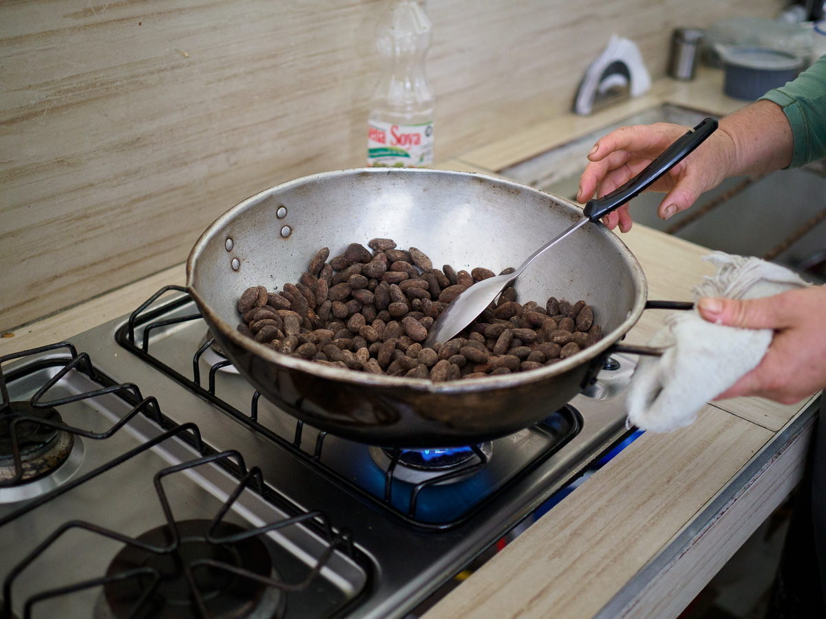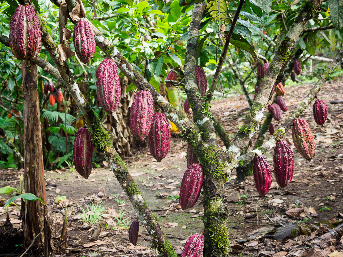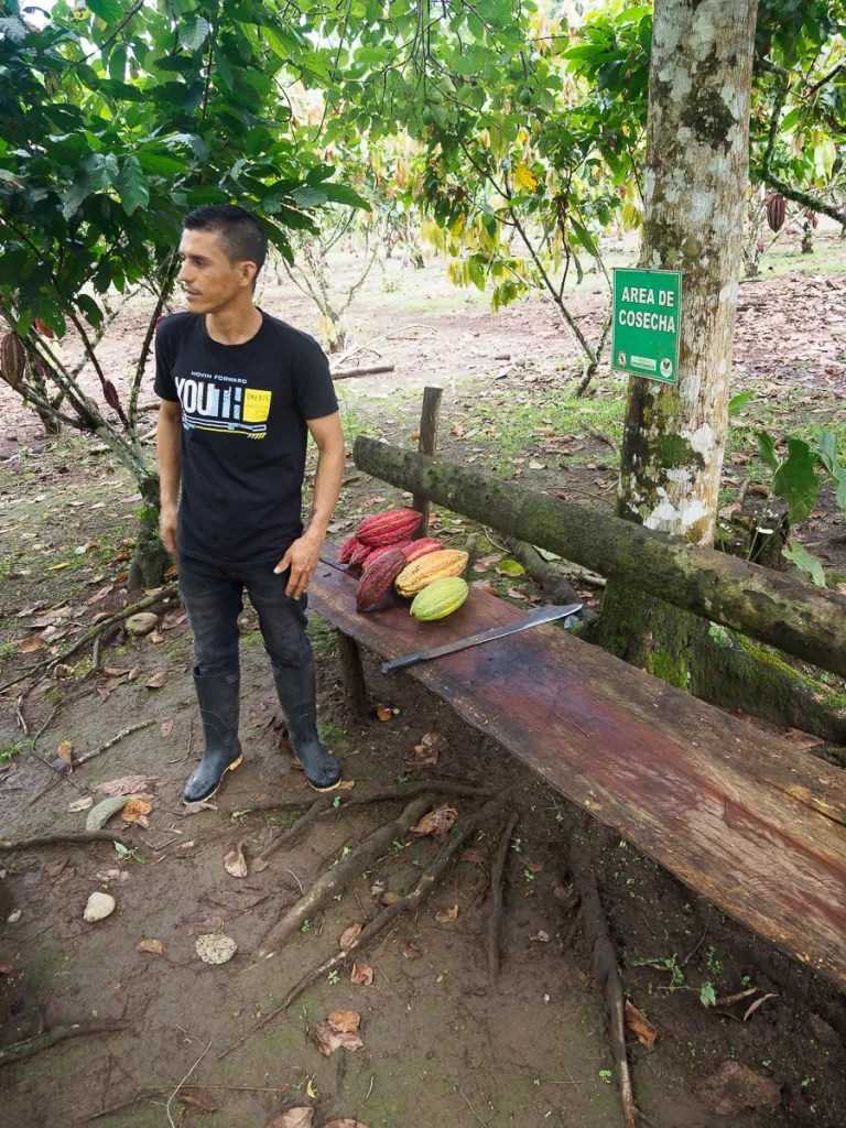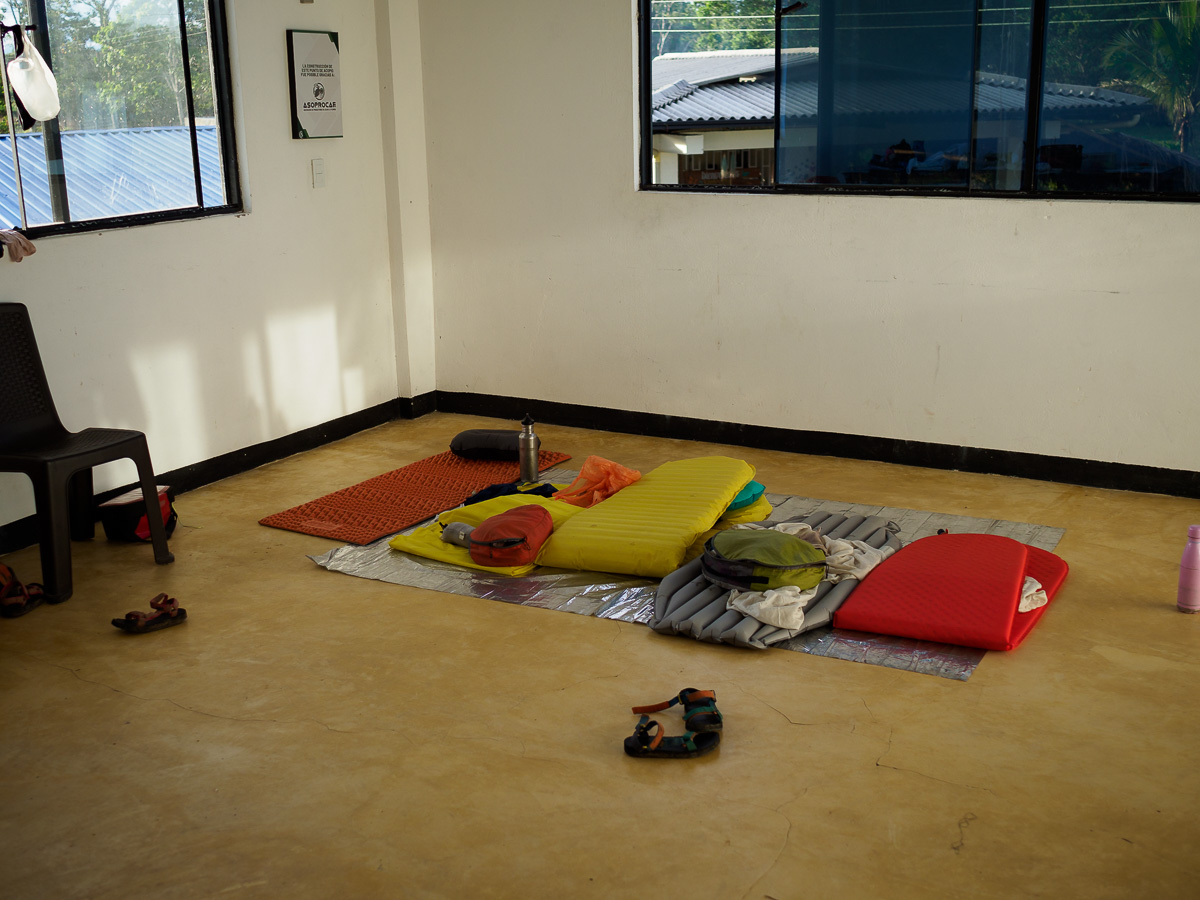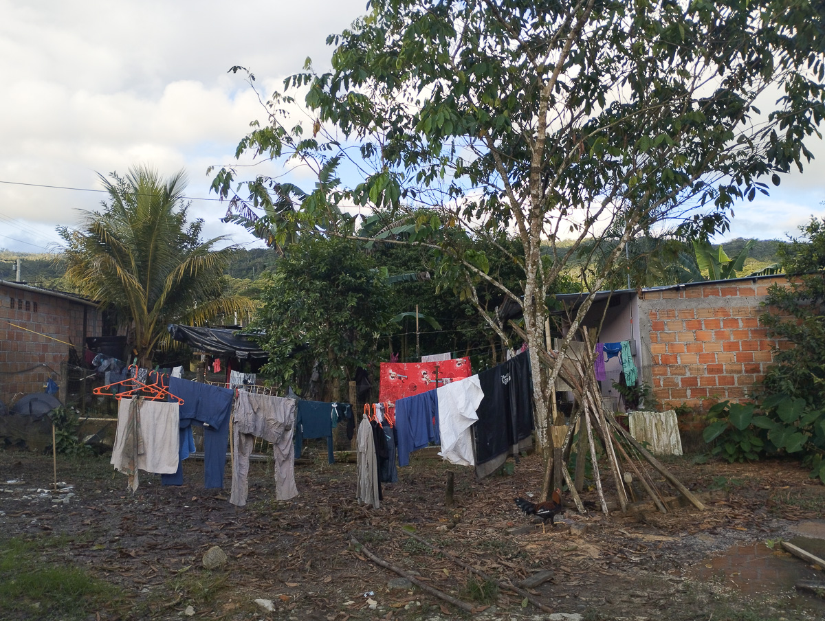 Les couleurs dorées de l’aube effacent les derniers vestiges de la nuit et donnent une nouvelle realite aux environs. Nous continuons en camionette jusquà la Hormiga pour nous laisser le temps de découvrir la plantation de cacao, Theobamba. Il s’agit d’une structure familiale qui a décidé d’abandonner la culture de la coca au profit du cacao plus vertueux. Bel exemple de reconversion, inspirant et porteur d’espoir pour la région Putumayo, encore stigmatisée pour ses violences et ses trafics. Nous y sommes accueillis par Nancy, Lili et Jaime. Nous devions camper mais il nous prête plutôt une grande salle pour être plus à l’aise.