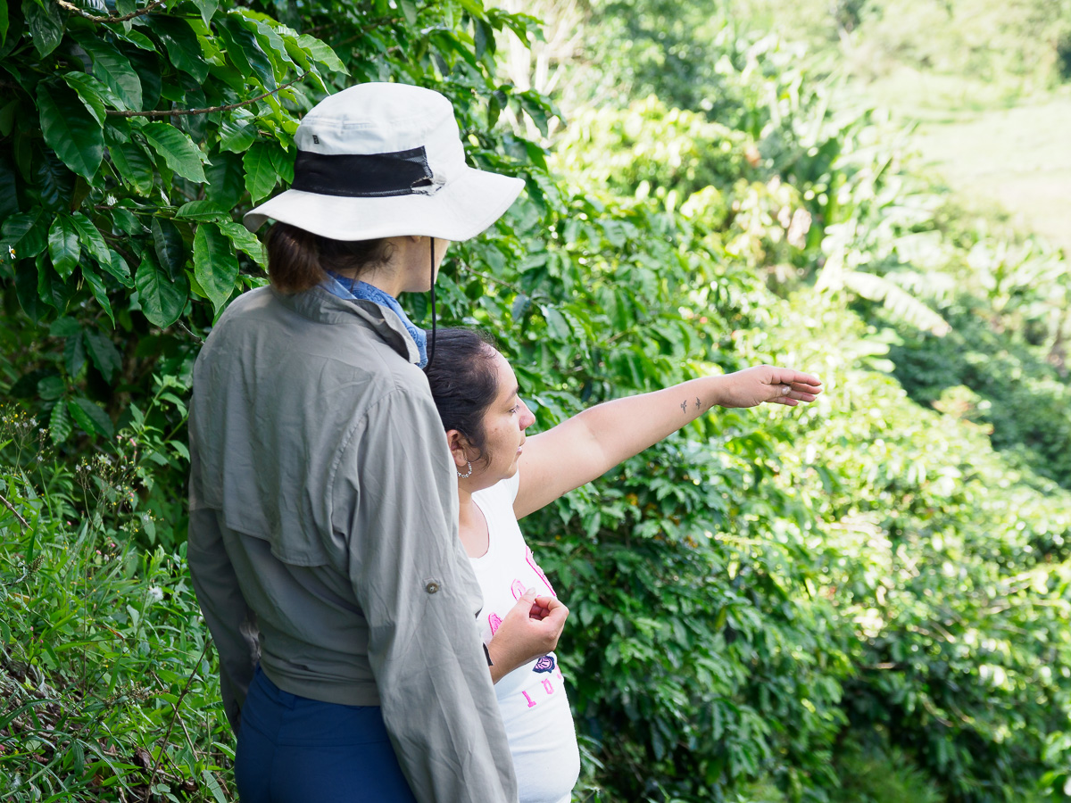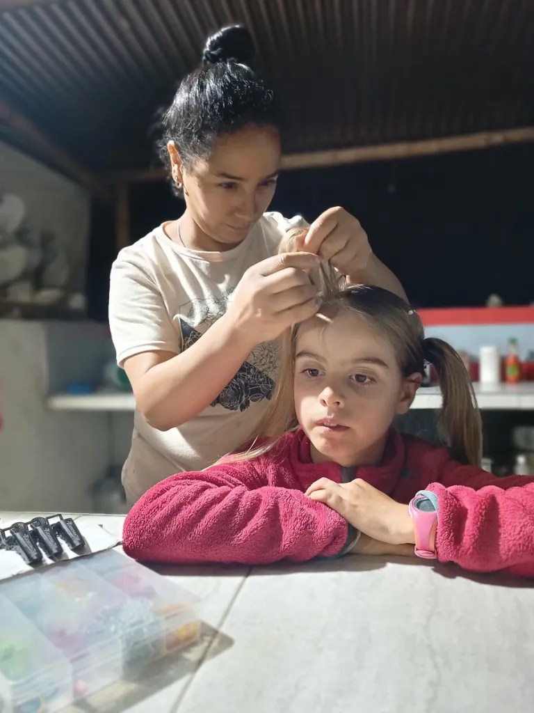 On est content de quitter l’axe principal (après un premier essai qui se termine devant un portail fermé! on est bon pour un demi-tour, ça ne marche pas à tous les coups!). Les montagnes couvertes de plants de café sont superbes sous le bleu éclatant du ciel. Dans le hameau de Cerritos, nous demandons à camper sur le terrain de foot de l’école. Edwin, le président et sa soeur Soraida, nous invitent plutôt chez eux. Nous découvrons leur finca de café dans la lumière du soir. Une maison traditionnelle avec ses pièces distribuées autour d’une galerie couverte, et une cuisine extérieure au feu de bois. Trois générations se partagent l’espace. Nous passons une superbe soirée. Yuli et Soraida tressent les cheveux des filles pour leur plus grand bonheur. Ophelia, la grand-mère qui s’est prise d’affection pour Heloise, nous propose de rester une journée de plus, ce que nous acceptons avec joie. Nous nous installons dans leur salon. Nous profitons de la sérénité des lieux et de la générosié de nos hôtes. Yuli nous fait une manucure, une institution en Colombie où les femmes, toute classe sociale confondue, ont les ongles peints de motifs élégants et complexes. Nous leur faisons un repas de crêpes salées et sucrées et discutons longuement de leur projet de finca eco touristique tournée vers la decouverte des oiseaux.
