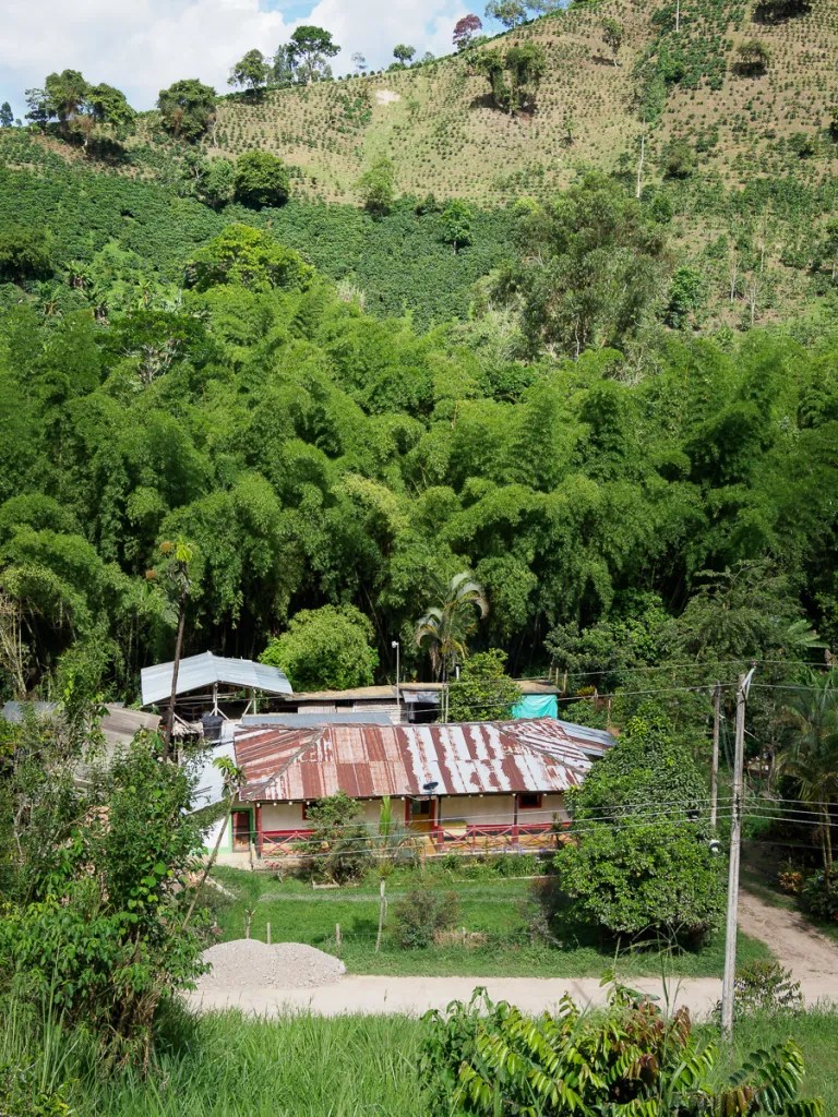 Apres un copieux petit déjeuner, le calentado (on mélange les restes de riz et de haricots du soir et on réchauffe), nous nous attaquons à la dernière grosse montée de la Colombie. On remonte une petite vallée verdoyante, plus de café mais des pâturages et une forêt de plus en plus dense. Un pique nique en bord de route et nous passons le col du Cable dans la brume. De l’autre côte, une couverture dense à perte de vue : la forêt amazonienne !! Dans la descente, une bruine froide nous contraint à nous arrêter pour nous réchauffer autour d’un café au Parador 45. Mary nous sert un excellent café, exactement ce qu’il nous fallait. En parlant, nous apprenons que son fils, leur belle fille française et leur petit fils viennent de repartir pour la France. C’est tout naturellement que Hernando et Mary nous invitent à rester dormir dans la chambre que la famille vient de quitter. Hernando a contrsuit sa maison en bois de ses propres mains. Elle est douillette à souhait et nous dormirons bien au chaud alors que la pluie n’a pas vraiment cessé.