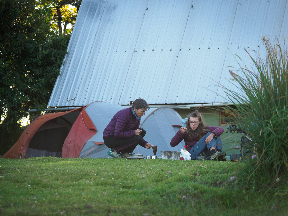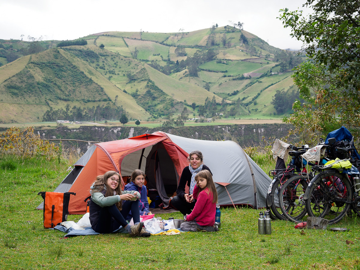 Nous pique niquons dans un petit parc au bord du rio Pita. Freddy, venus avec sa famille pour un « asado » dominical, entame la discussion (promis, ce n’est pas moi qui ai commencé) et nous offre deux bières artisanales pour le soir. Il nous conseille de camper plus au coeur de la campagne, plus tranquille et sûre. Nous continuons la montée, souvent si raide qu’elle nous oblige à pousser les vélos même si la route est goudronnée. A ce rythme nous n’atteindrons pas le coin de bivouac repéré avec Papy et Mamie. A l’entrée de Rumipamba, nous demandons à une famille s’il y aurait dans le village un endroit pour camper. Diego nous propose spontanément son jardin, regrettant de ne pouvoir mieux nous accueillir car ils rentrent tous sur Quito. Ils nous ouvrent meme une maisonnette au cas où le temps se gâte. Quelle générosité encore une fois! De leur jardin, la vue sur le volcan est idyllique dans les lumières du soir. Le vent est fort et froid. Après un dîner à l’abri, nous nous réfugions dans la chaleur de nos duvets, heureux de cette reprise du vélo dans de si bonnes conditions.