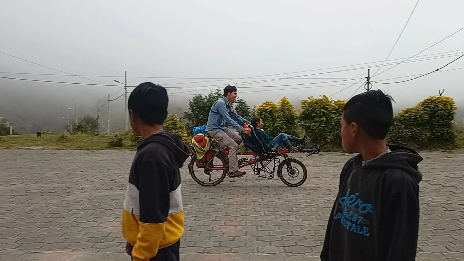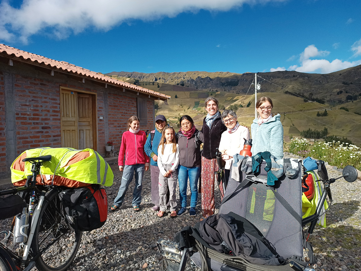 A la petite école San Ernesto, c’est au foot que nous nous mettons avec Cathy et ses frères, qui viennent de ramener leur brebis à l’enclos. Nous sommes bientôt rejoints par tous les enfants du hameau et leurs parents. Luis et Dora nous conduisent voir leur vache, Damien répare la chaine du vélo de Manuelo dont le sourire rayonnant est le plus beau des mercis. Nous enchaînons les tours de tandems dans la cour. Ils adorent et nous aussi, chanceux de partager ces moments. Tous parlent Quechua autour de nous. Quel dépaysement! Ils nous ouvrent finalement la salle communale, qui sert aussi d’entrepôt agricole. Nous les en remercions vivement!! Nous dormons bien à l’abri ce soir.