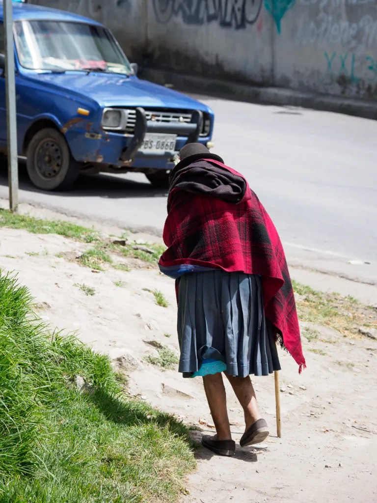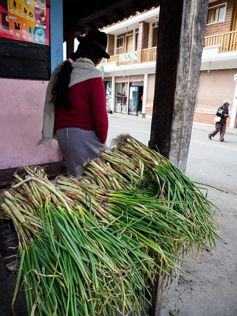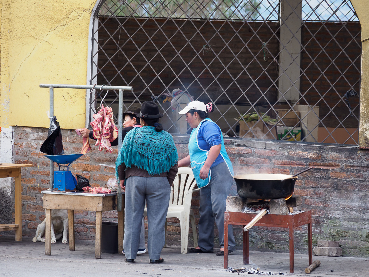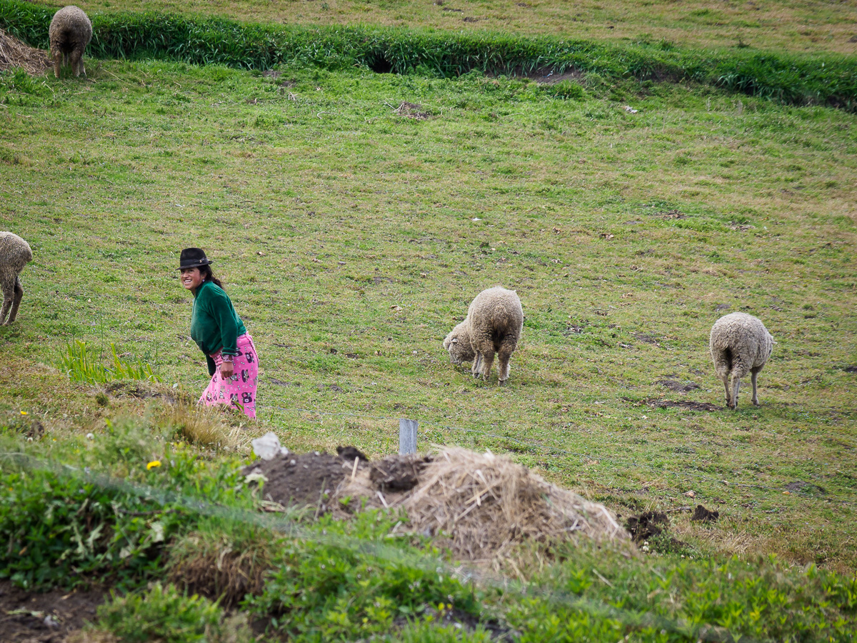 La route se poursuit toujours aussi belle et paisible. Nous entendons arriver de loin les camions vendant des glaces, avec leur musique et leur discours entêtants. Des dames nous interpellent pour prendre Heloise en photo. Ici toutes portent le costume traditionnel : jupe courte à volants, châle coloré à franges et chapeau de feutre avec plume de paon sur une longue tresse enroulée de tissu noir…. et sortent de sous leur blouse un téléphone portable ! Notre pause ravitaillement à Chugchillan est l’occasion d’une immersion dans cet univers andin et quechua.
