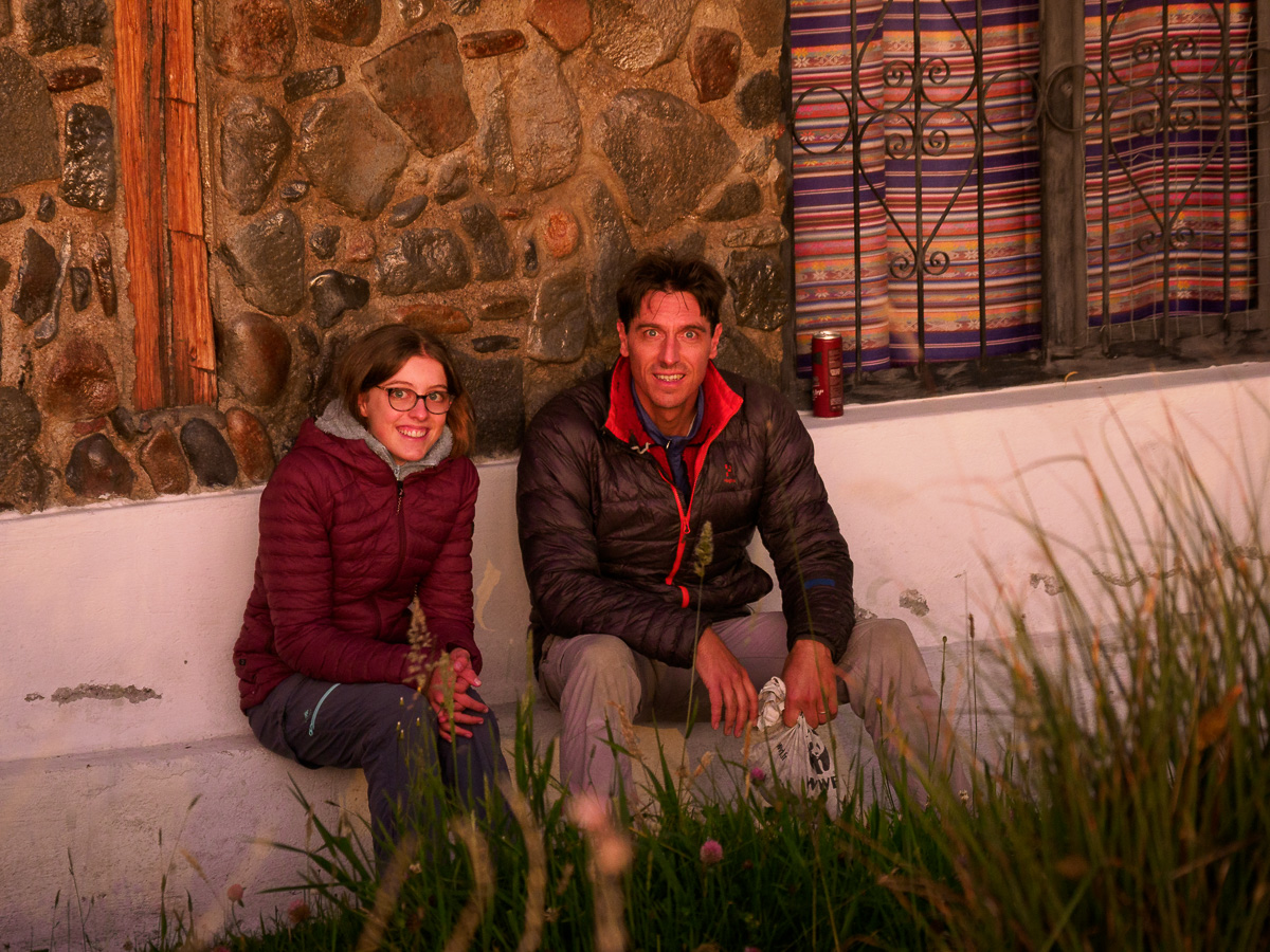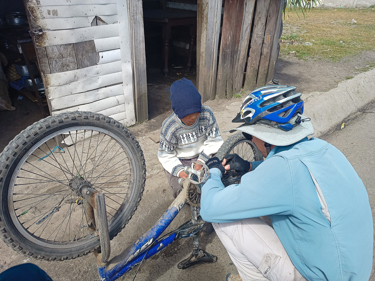 Nous poursuivons notre montée dans des paysages toujours aussi magnifiques et andins. Au hameau de Casa Quemada, un petit garçon, Anthony, 10 ans, tient d’une main son vélo et de l’autre sa chaîne. Nous nous arrêtons pour l’aider à réparer. Il faudra plus d’une heure à Damien pour venir à bout des maillons déjà fortement usés, mais le sourire reconnaissant de ce petit bonhomme est encore une fois notre récompense.