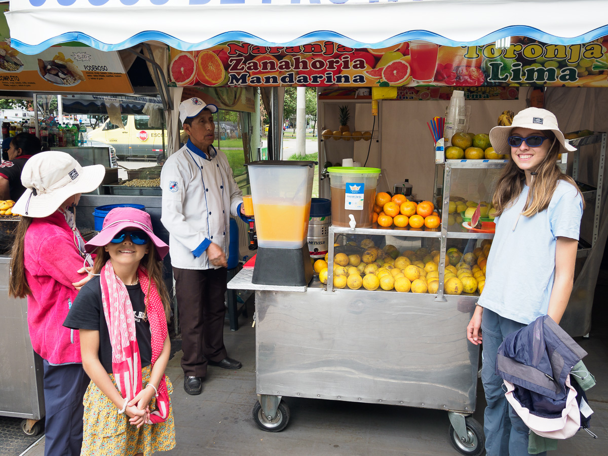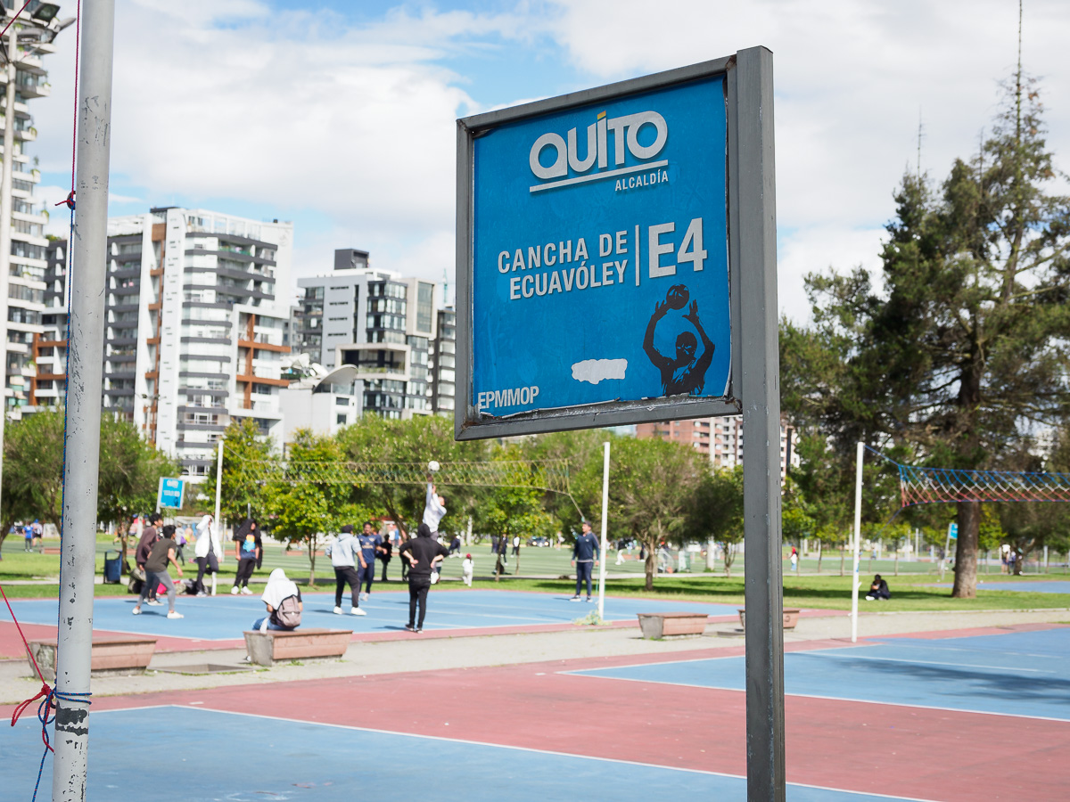 Nous avons rendez vous avec une famille originaire d’Assas, notre village, expatriée depuis 1 an à Quito. Camille, Stéphane, dont la maman habitant Assas et suivant notre périple dans le Midilibre nous a mis en contact (Merci à vous, Nicole), et leurs trois enfants, Léon, Suzanne et Antoine nous accueillent comme des amis. Eux aussi ont parcouru L’Amérique à velo et nous passons deux excellentes soirées à échanger et à jouer selon l’âge. Nous découvrons l’école franco-équatorienne très colorée dans laquelle ils enseignent et leur quartier qui nous laisse voir une autre facette de Quito, moderne et sportive.  Nous arpentons les sentiers du parc métropolitain, forêt d’eucalyptus sauvage dominant la ville, avant de nous diriger vers le parc de la Carolina. Il est aménagé de terrains de foot et d’ecuavolley. Comme son nom l’indique, il s’agit du sport national, une sorte de volley 3 contre 3. L’ambiance est détendue et sportive. Nous adorons ce quartier et comprenons que nos nouveaux amis s’y sentent aussi bien. Nous allons les chercher à la sortie de l’école pour une partie de foot et de basket. Merci les amis pour ces bons moments et votre accueil spontané et chaleureux!