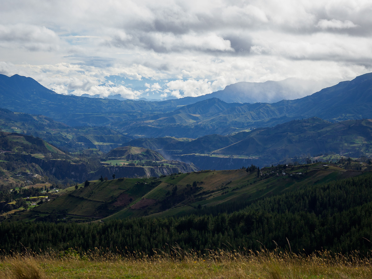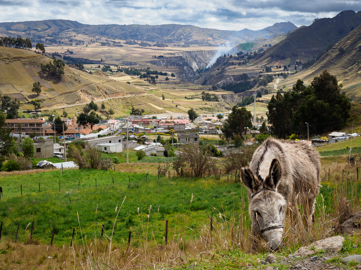 La route se poursuit au coeur d’un paysage vallonné et doux. De plus en plus champêtre et propre, entre culture de fèves et de céréales. Nous apprécions ! Et soudain, sans signes préalables, de vertigineux canyons froissent le paysage de pentes abruptes, de rivières profondes et de routes en lacets. C’est à la fois superbe, inquiétants et exigeants pour les jambes, ces denivelés successifs. A la petite école qui nous abrite pour la pause de midi, nous rencontrons le maître, Herminando, que nous recroisons plus tard sur la place du village de Sigchos. Il nous offre un bon goûter et l’occasion d’une discussion sur le système scolaire équatorien. Ca y est, les élèves équatoriens sont en grandes vacances!!!