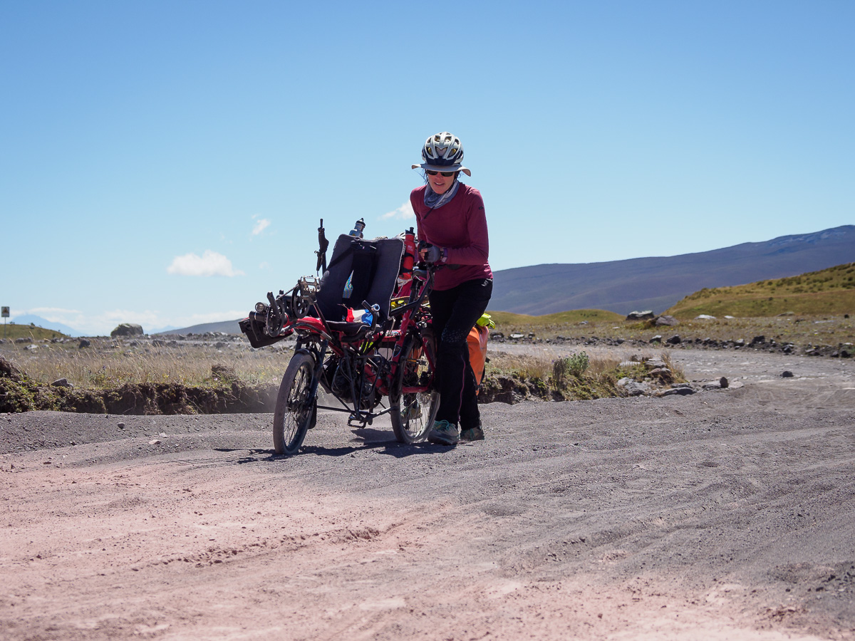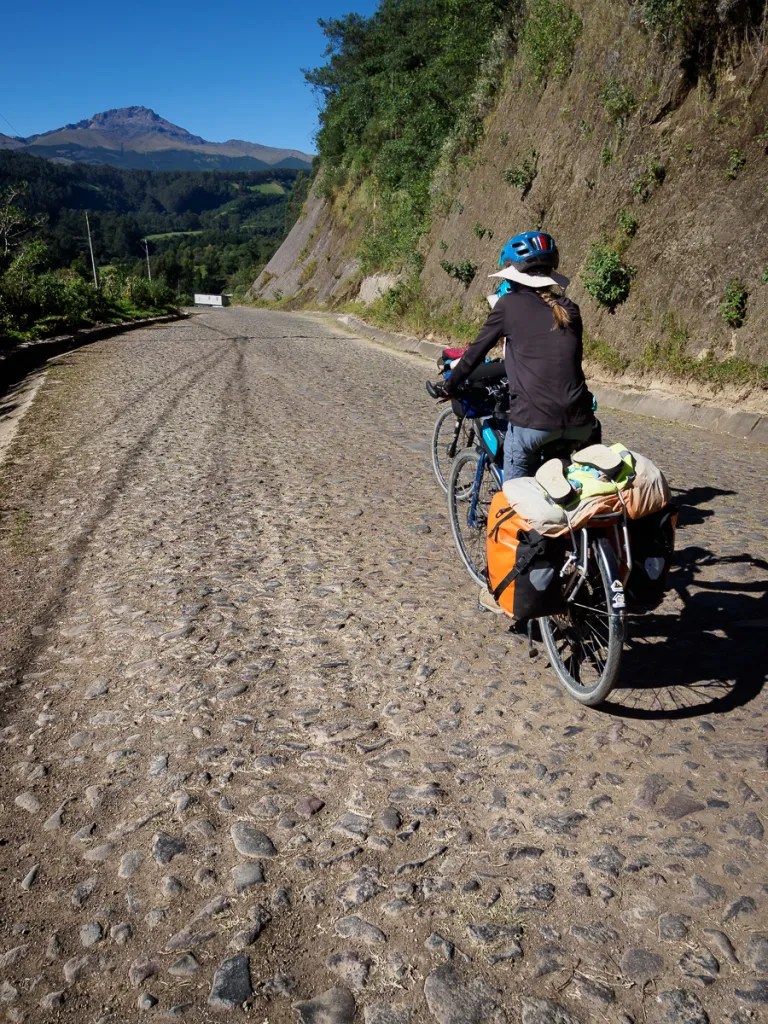 Au petit matin, le Cotopaxi est toujours aussi majestueux. Le plus dur reste à faire. La route se transforme en une voie romaine pavée de roches volcaniques. L’enfer à vélo ! Surtout que la pente est raide, que certains pavés arrachés laissent la place à des trous béants et que les effets de l’altitude se font sentir. Je ne me sens pas bien, et ai du mal à avancer. Je m’allége en laissant la tente à Manon… Heloïse est très inquiète pour moi, réminiscence de sa peur suite à ma perte de connaissance en Colombie. Je ne compte pas le nombre de fois où elle m’interpelle: « il est beau le volcan, hein? Et ça va, tu es sûre ? «