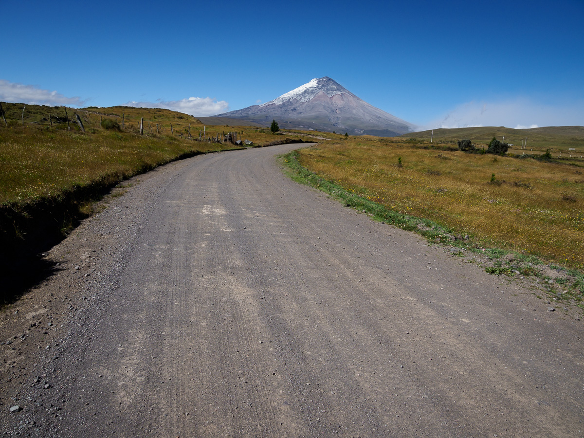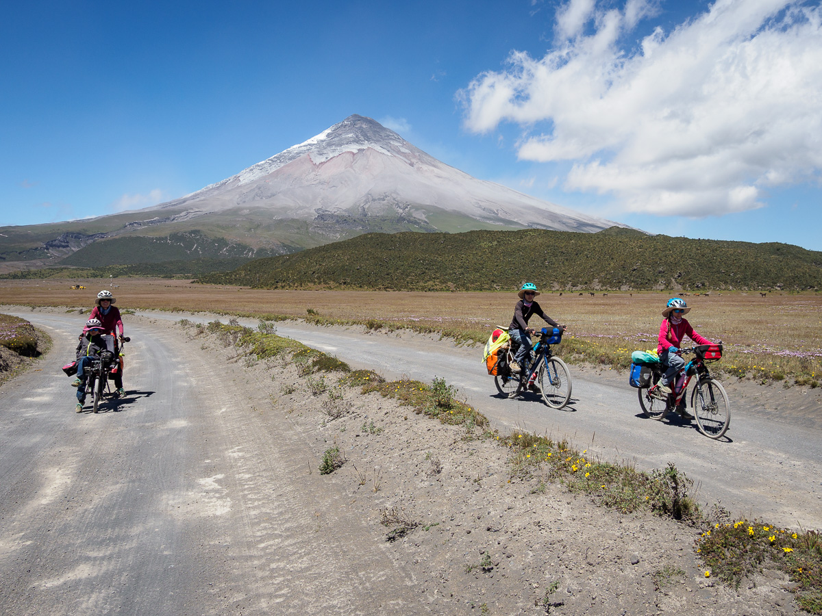 Il est temps pour nous de retrouver nos vélos. Nous sommes encore une fois accueillis à bras ouverts par Santiago à Tumbaco. Un peu d’école, d’écriture et de mécanique et nous sommes fin prêts, partagés entre le plaisir de retrouver la liberté de rouler et l’appréhension de ce qui nous attend. Car nous connaissons la route et sa difficulté!! Une fois dépassés la banlieue et son trafic intense, les doutes s’envolent et ne demeure que le plaisir du voyage lent. Alors que nous contournons l’Ilalo, gravi avec mes parents, le Cotopaxi nous apparaît dans toute sa splendeur! On savoure le spectacle.