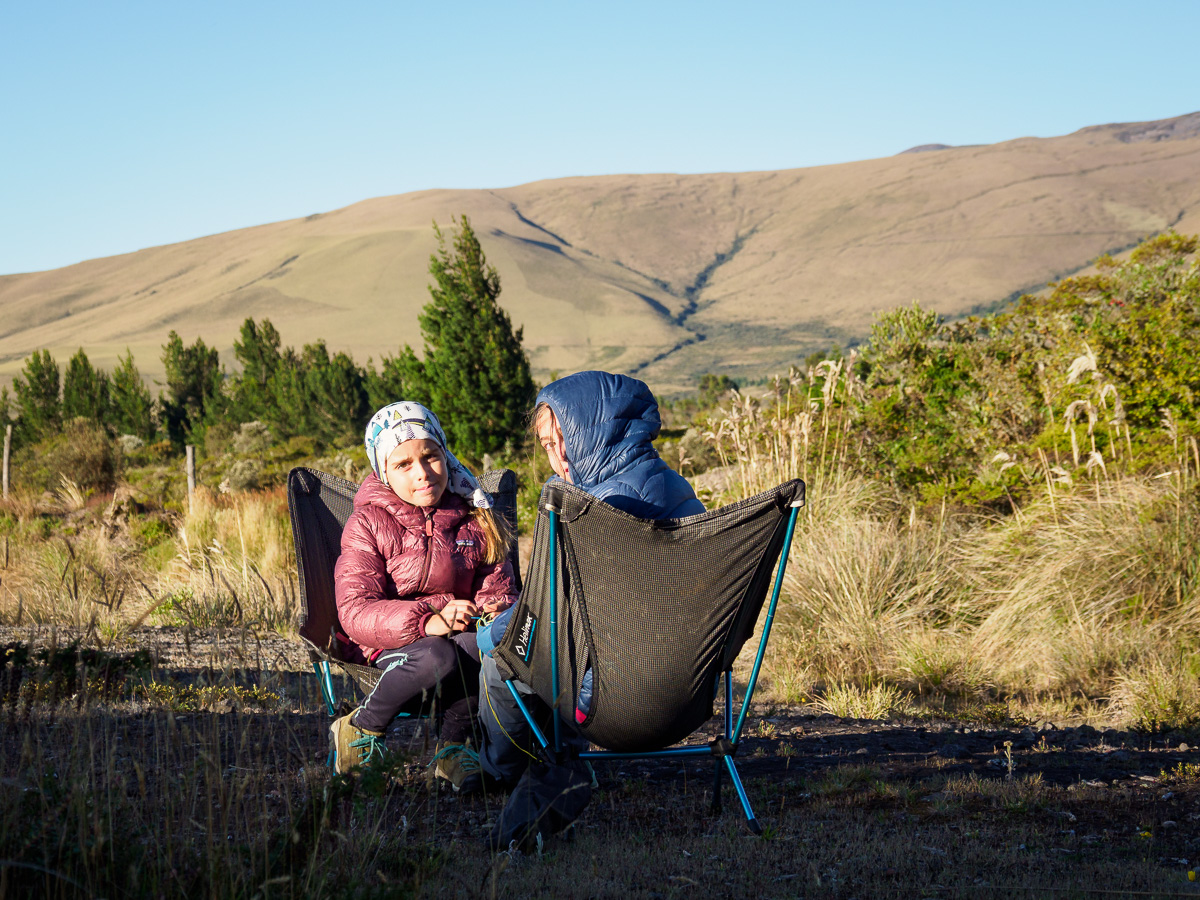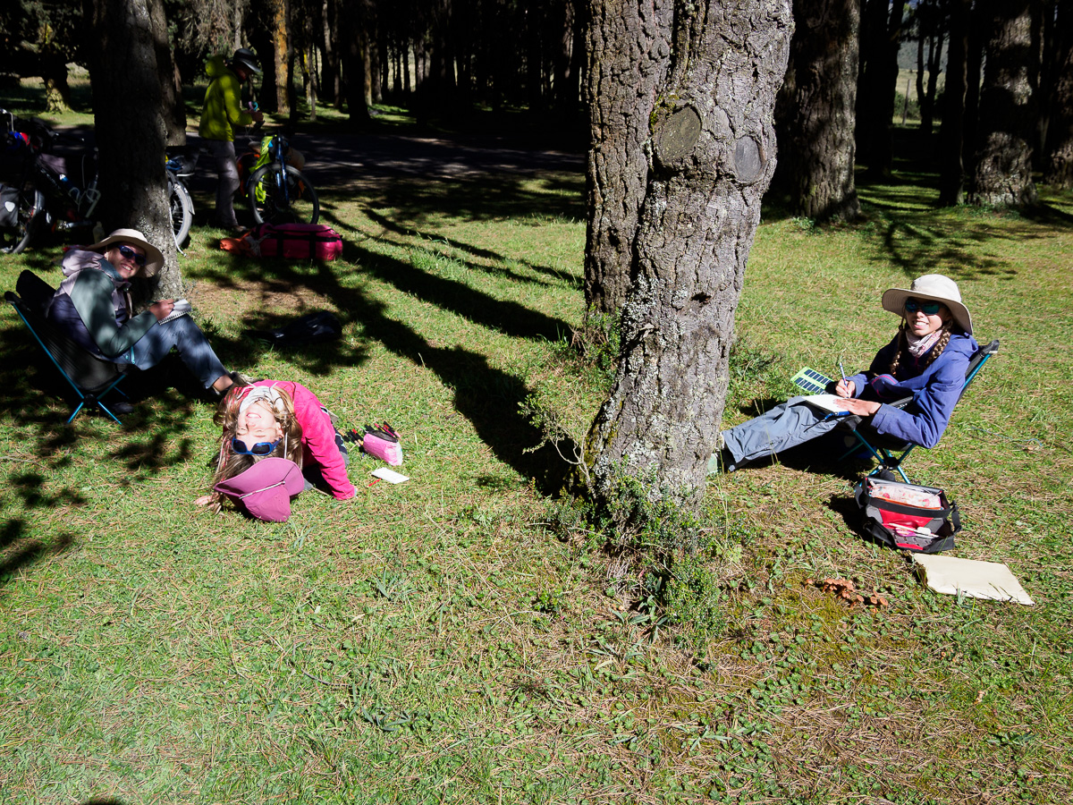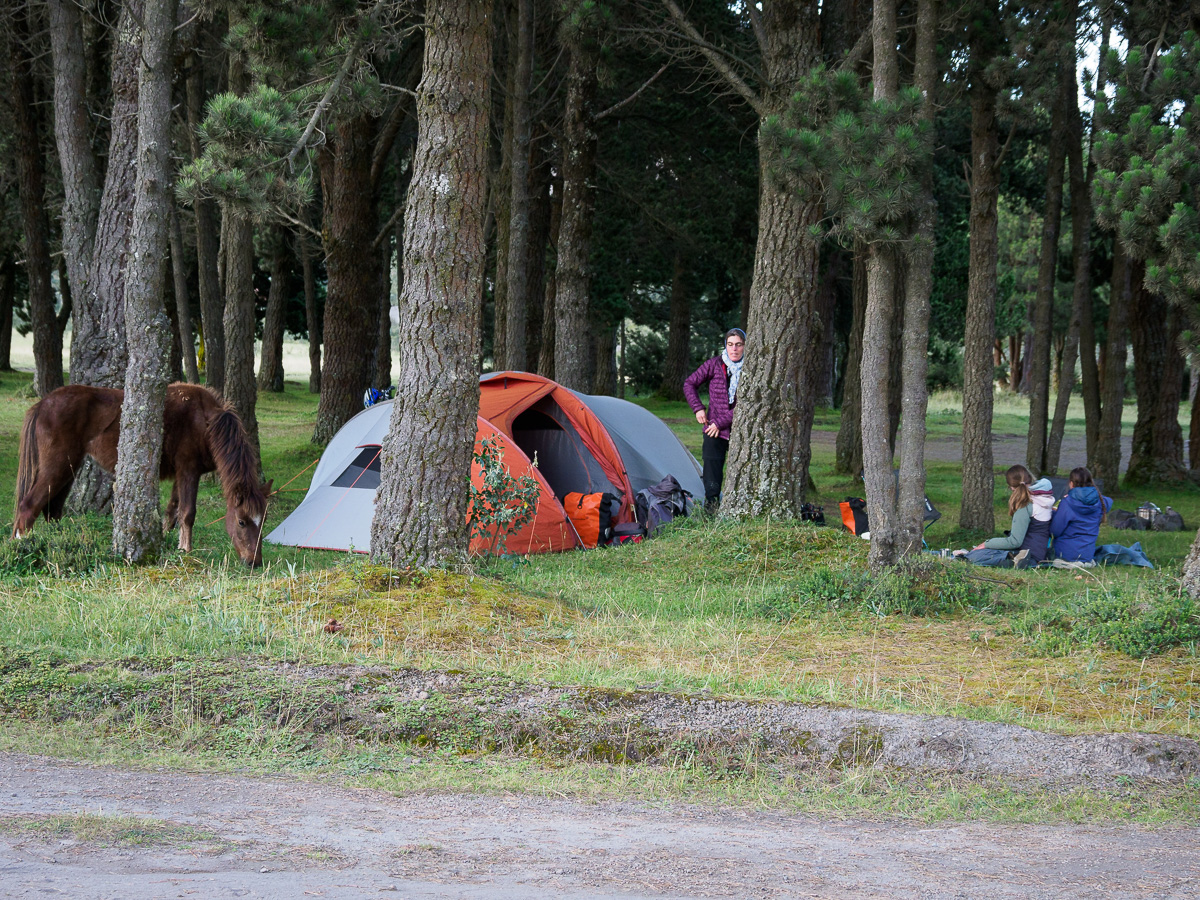 Nous nous dirigeons, toujours sous l’oeil du Cotopaxi, vers l’aire de Camping de la Rinconada. Un véritable paradis sous les pins avec vue directe sur le volcan! Bivouac de rêve, où nous resterons deux nuits. Pour le moment, nous installons chaises et hamac pour profiter de la fin d’après midi ensoleillée.