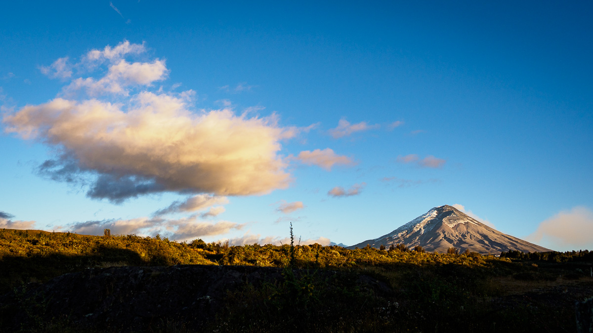 Peu à peu, la végétation se fait moins dense, les arbres se raréfient. Le sable volcanique remplace les pavés, la pente s’adoucit et les corps se réhabituent à l’effort et à l’altitude. Mais quel vent!!! Finalement, à 5km de l’entrée du parc, nous retrouvons Miguel, un cycliste espagnol rencontré à la Casa de Ciclista, et le coin de bivouac idéal, à l’abri et encore une fois avec vue directe sur le Cotopaxi. Que rêver de mieux ! Nous adorons cette immersion dans la nature sauvage! Dernière tâche de lumiere rosée sur le volcan, premier rayon de soleil et entre les deux, une nuit calme et reposante.