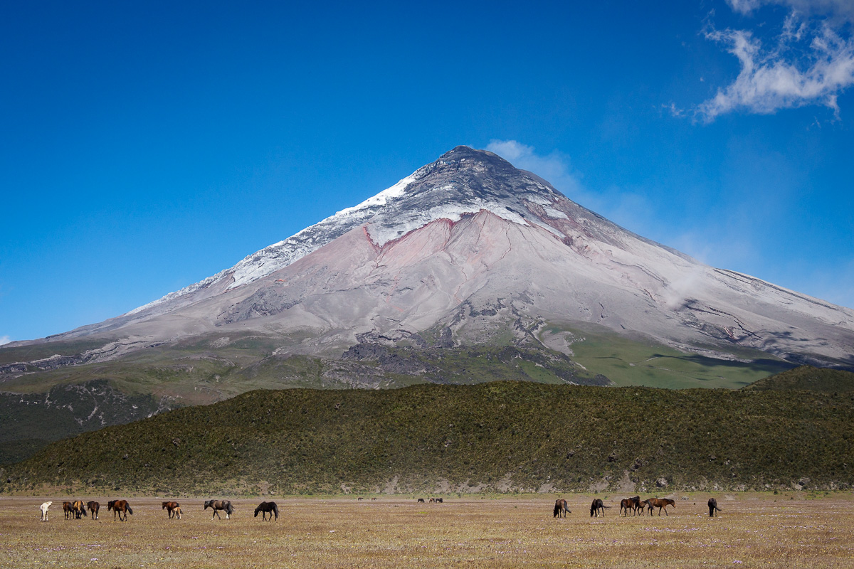 Au loin, nous apercevons le Chimborazo et l’Antisana. Et le Cotopaxi est là, tout près, cône parfait de pierres volcaniques noires et rouges, et de neiges éternelles. Il est en forte activité depuis quelques semaines, comme le prouvent les fumerolles qui s’échappent du cratère. Les vents dominants poussent les cendres sur la face ouest, noircissant le glacier et le faisant fondre. La différence entre les faces est et ouest est d’ailleurs flagrante. Plus nous nous rapprochons, plus il nous impressionne, plus les plaines sont parsemées de blocs piroclastiques issus d’éruptions lointaines. Nous reconnaissons d’ailleurs celui près duquel nous avions pique niqué avec Papy et Mamie. Au vu de leur taille, on ne peut qu’imaginer la violence des éruptions, qui mêlent pluies de cendres, flux piroclastiques, coulées de lave à plus de 900 degrés et lahars (eaux du glacier et cendres).
