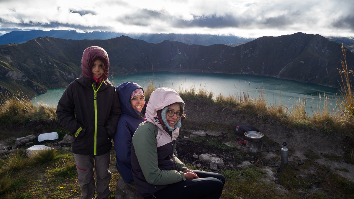 Le coeur en joie, nous franchissons les derniers kilomètres qui nous séparent de la lagune de Quilotoa par une piste sableuse au milieu de cheminées de fées, etant donné que la route principale s’est effondrée. Le vent glacial nous déstabilise ! Encore quelques efforts, et nous voilà surplombant cette caldeira volcanique maintenant remplie d’eaux émeraude ! Ses contours dessinent parfaitement l’ancien cratère… et toujours ces parois vertigineuses. Nous randonnons deux heures au gré des sentiers de crêtes, ivres de vent et de camaieux de verts. Un arc en ciel fugace y ajoute son grain de sel. Les eaux sont ensorcelantes. Nous bivouaquons sur un promontoire légèrement abrité avec vue directe sur la lagune. Nous avons voulu fuir la petite ville artificielle d’hôtels et de restaurants à moitié fermés.