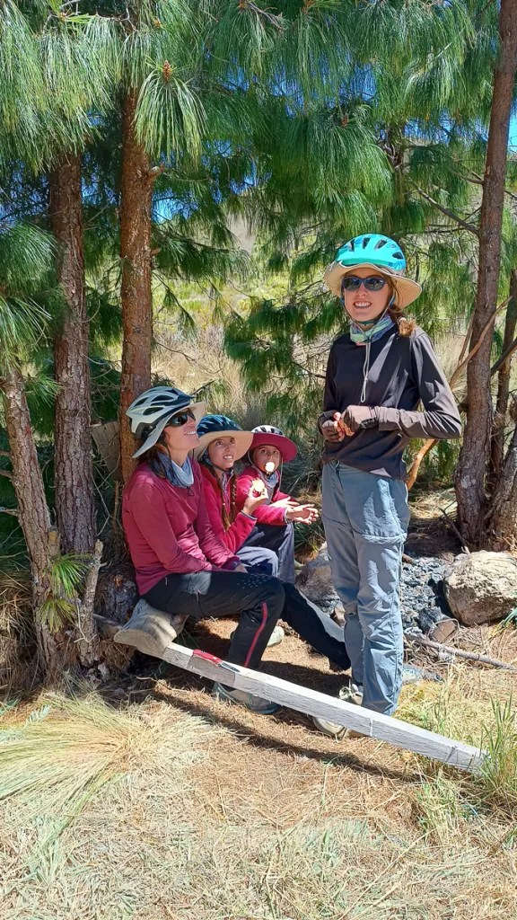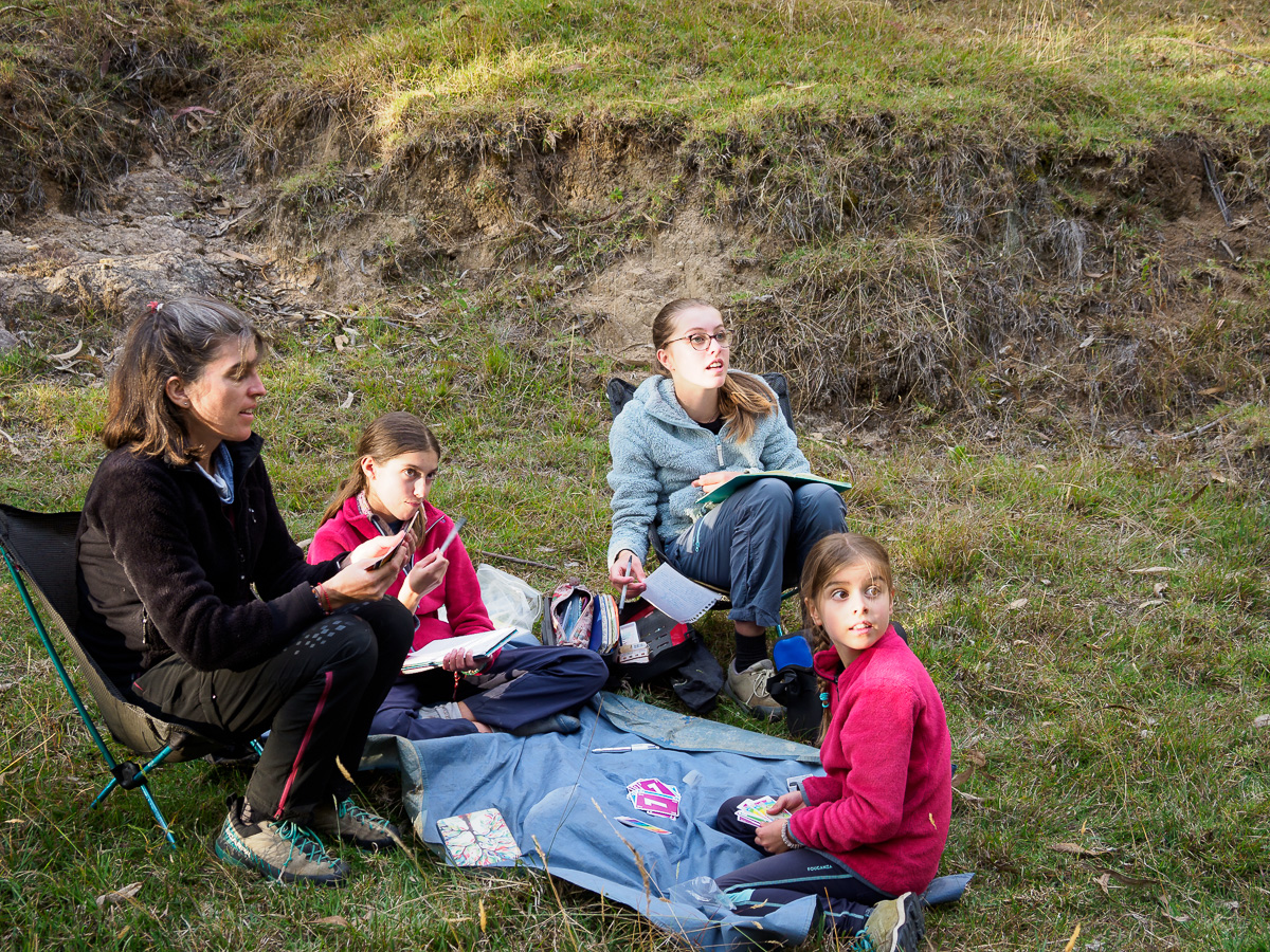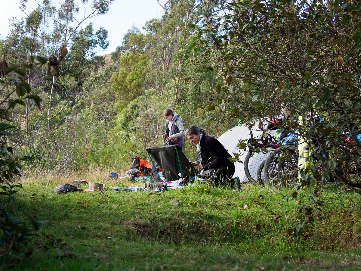 La piste continue à s’élever dans ce même paysage aride, en balcon souvent avec une vue dégagée sur des vallées prodondes et des canyons sculptés par des millénaires de pluie et de vent. Un bord de rivière et l’ombre de grands arbres nous accueilleront pour un nouveau bivouac sauvage et tranquille. Manon et Lucie partent un peu plus en amont faire la lessive, nous les entendons rire et chanter, Héloïse récupère après sa courte nuit avec ses amies. Ce sera d’ailleurs la première couchée ! Le ciel dégagé nous offrira ce soir un spectacle incroyable: coucher de soleil rougeoyant et premiers scintillement d’étoiles entre les feuillages d’eucalyptus, avant que la voie lactée nous surplombe de sa trace évanescente. Dans les yeux de Lucie se reflètent les cinq étoiles filantes qu’ellle a cueillies d’un battement de cil, comblée par ces petits bouts d’univers.
